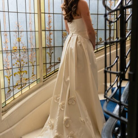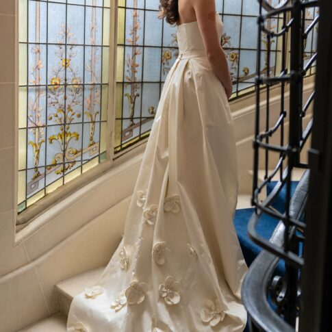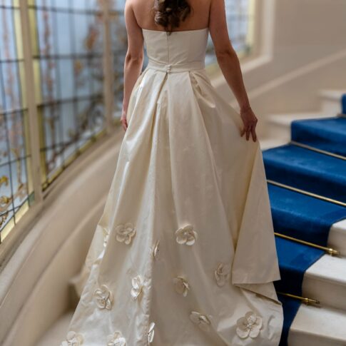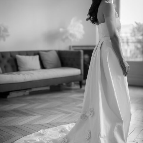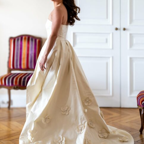 Robe de Pénélope Robe droite en taffeta écru, prolongée d’une longue traine fleurie. Toutes les fleurs sont faites à la main. Le soir, une ceinture remplace la traine, avec une grosse fleur dans le dos. Photos @emmanuelledemontgrand