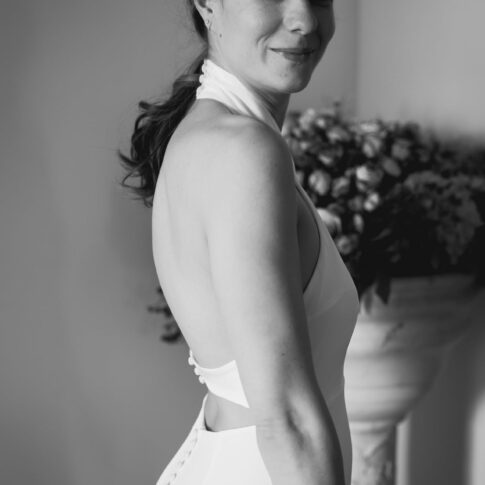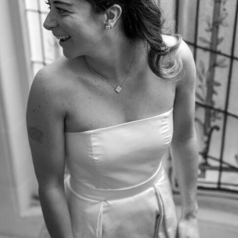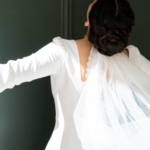 Robe de Claire Robe sans manche en satin de coton. Par dessus, top en dentelle ouvert dans le dos avec traine en dentelle amovible. Voile court réalisé sur mesure. Photos @emmanuelledemontgrand