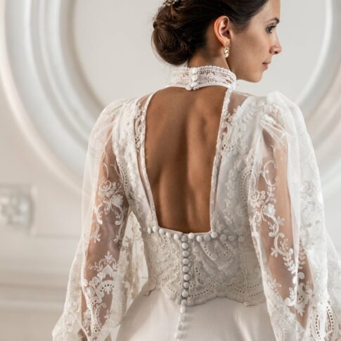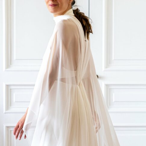 Robe de Lara Robe en crêpe polyester lourd avec des manches courtes et un dos en tulle brodé. Par dessus, une cape en organza de soie toute bordé de galon de tulle brodé. Photos @emmanuelledemontgrand