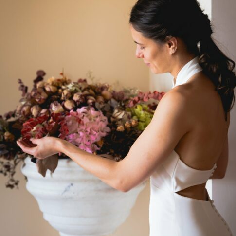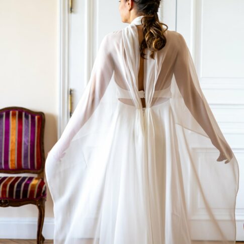 Robe de Pauline Robe en crêpe lourd, avec un drapé de soie crinkle noué sur le devant et des manches souples. Dans le dos, une cape amovible en crêpe de soie mousse. Photos @emmanuelledemontgrand & @coolkidsonthedancefloor Fleurs de tête @florencechardignymodiste
