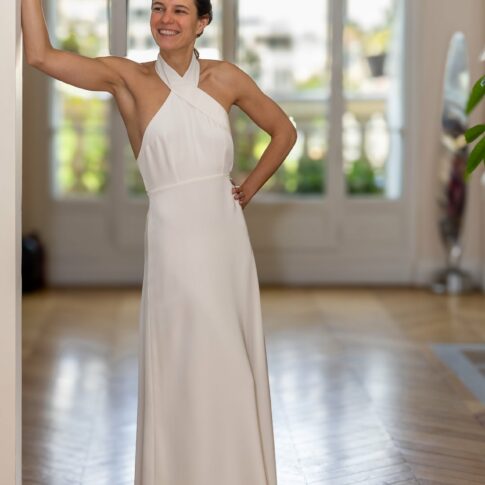 Robe de Marion Robe en crêpe caddy de soie, avec un col et une ceinture froissés. Dans le dos, deux pans amovibles qui forme une traine. Photos @emmanuelledevilmorin