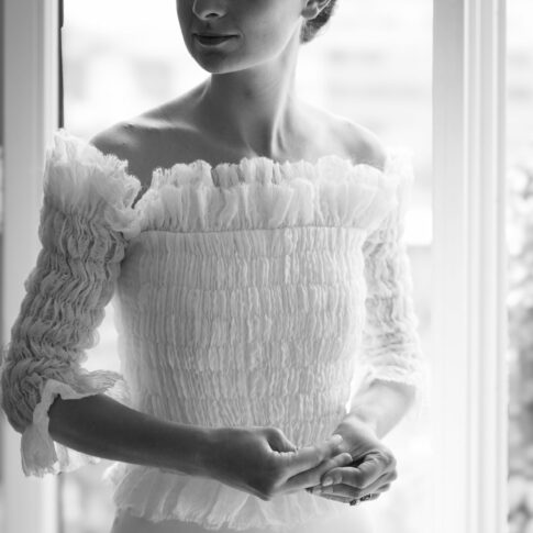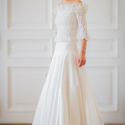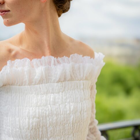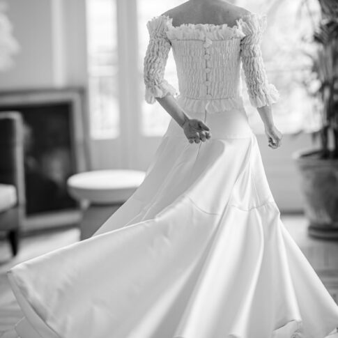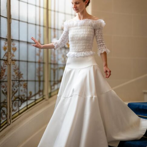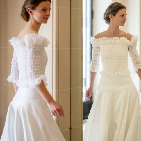 Robe de Solweig Jupe en double mikado de soie et haut entièrement froncé de smocks, en coton et soie. Voile de famille recomposé pour s’adapter à la robe. Photos @emmanuelledemontgrand