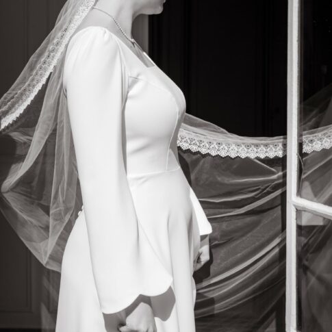 Robe de Mathilde Robe festonnée en crepe lourd infroissable, sans traine. Les manches sont amovibles. Voile long sans rabat bordé de guipure. Photos @emmanuelledemontgrand