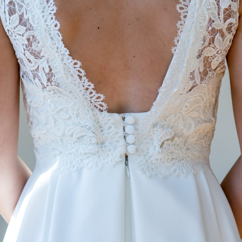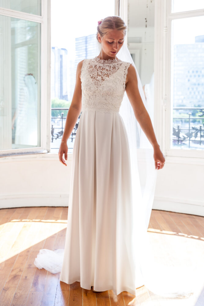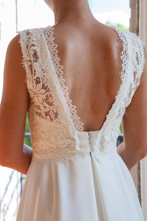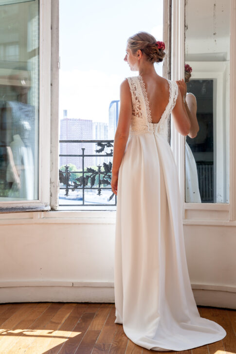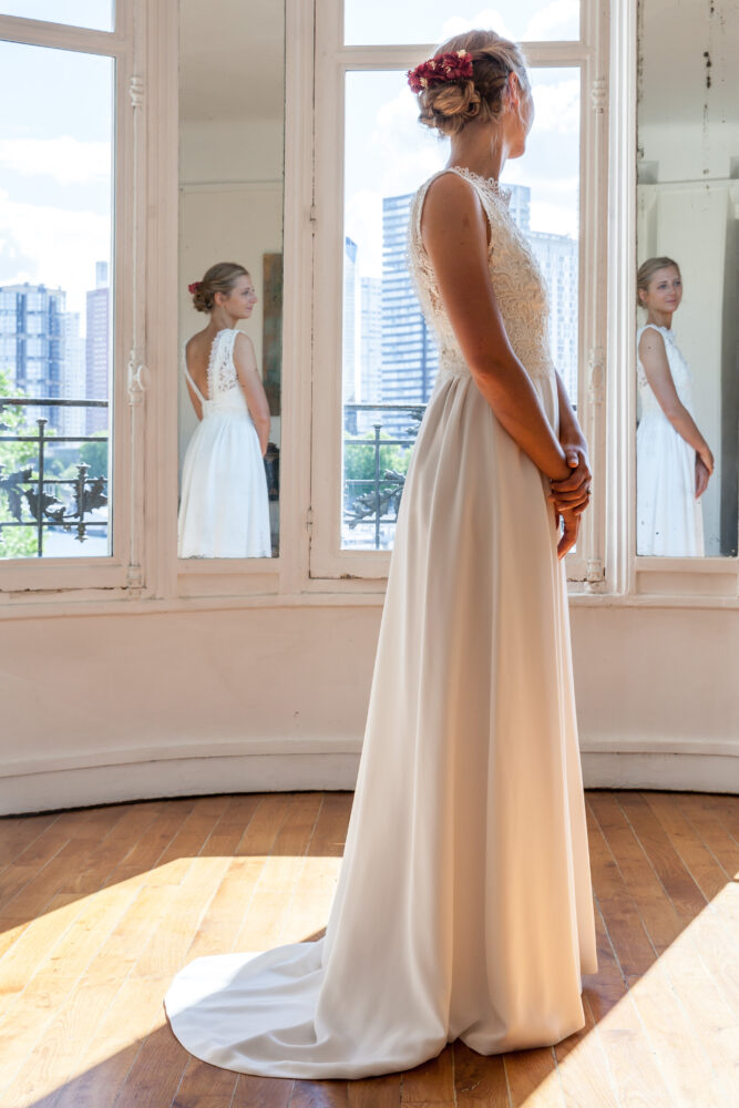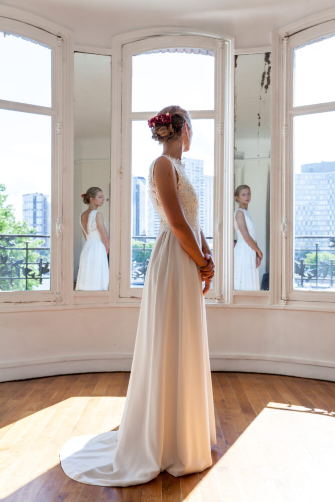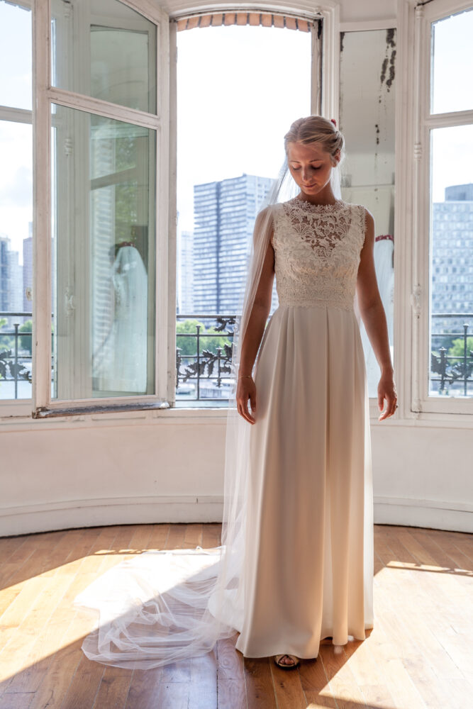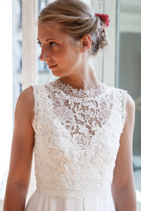 Par dessus, un top ajusté, en dentelle de Lyon rebrodée.