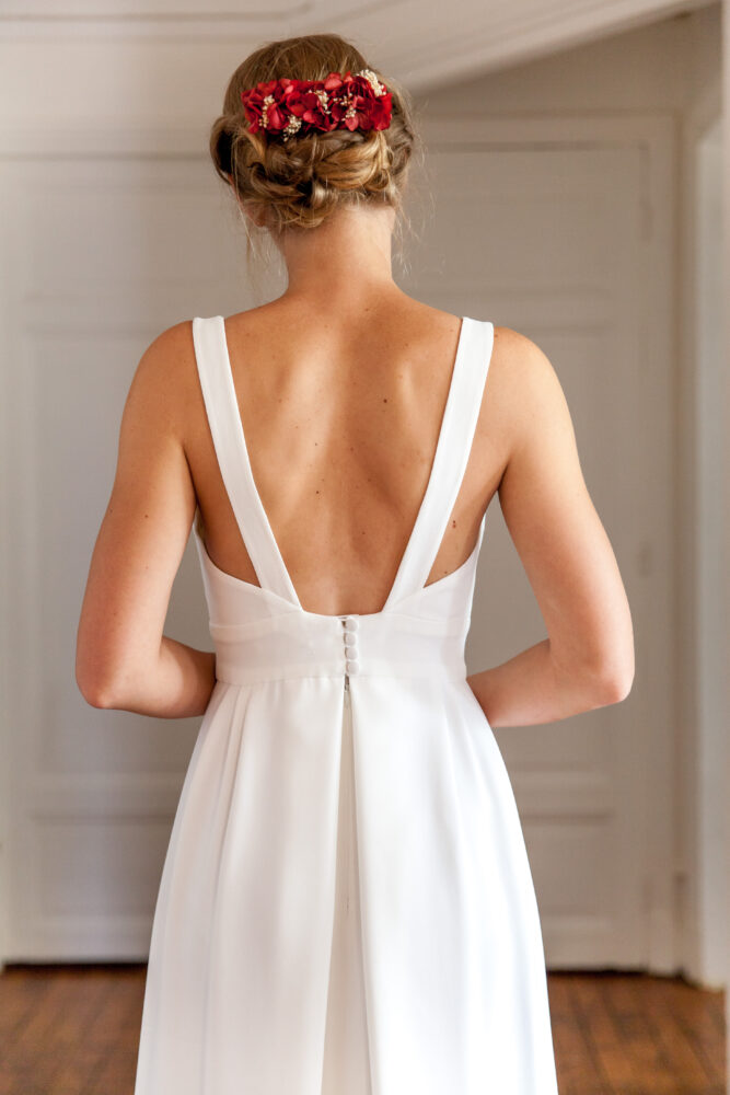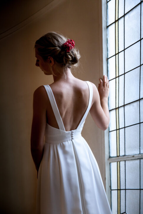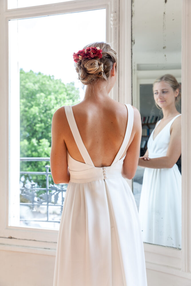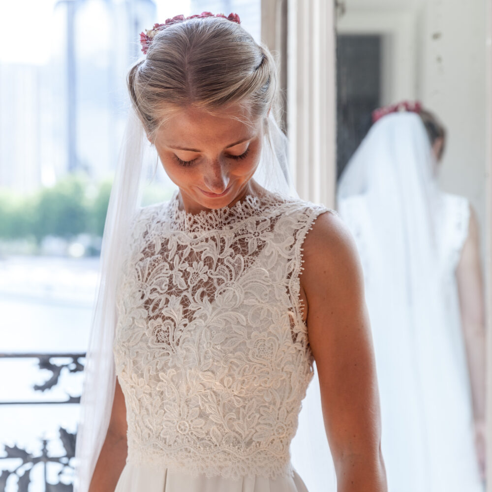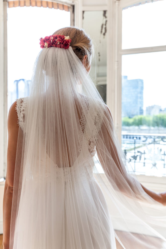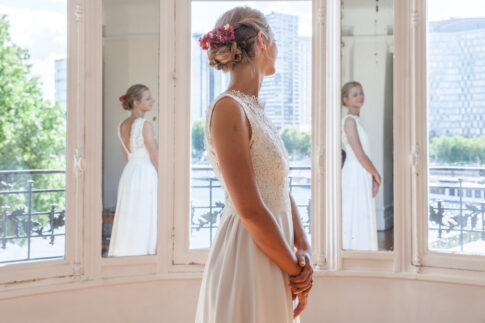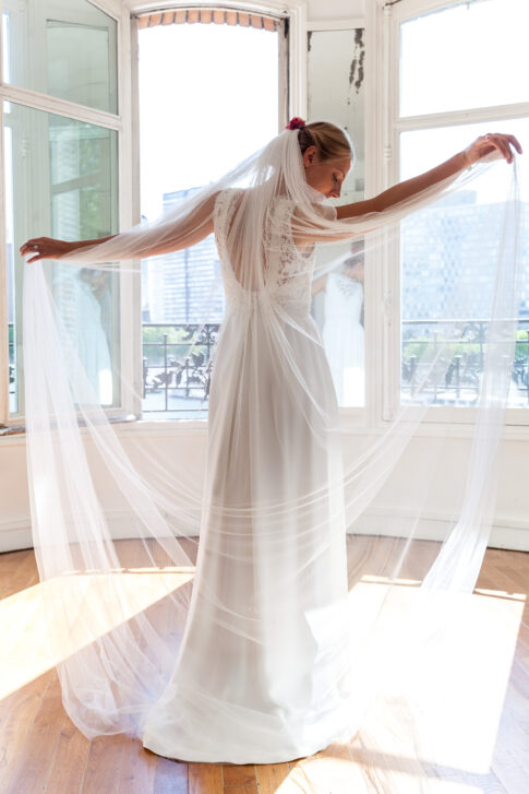 Par dessus, un top ajusté, en dentelle de Lyon rebrodée.