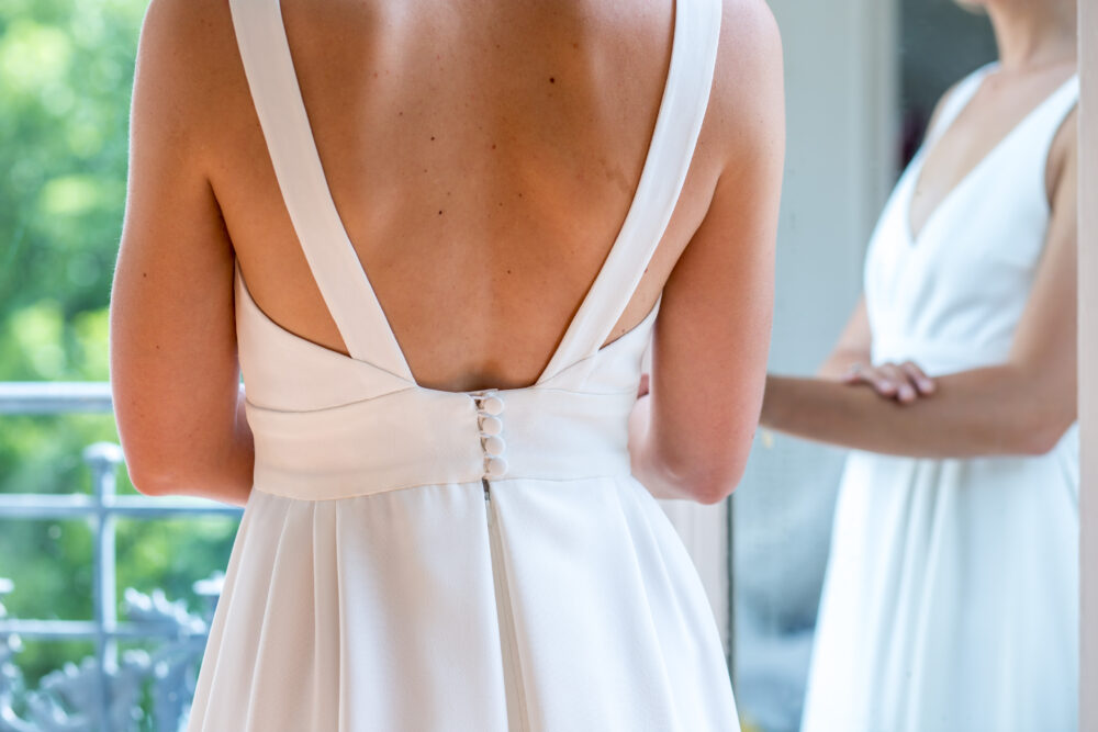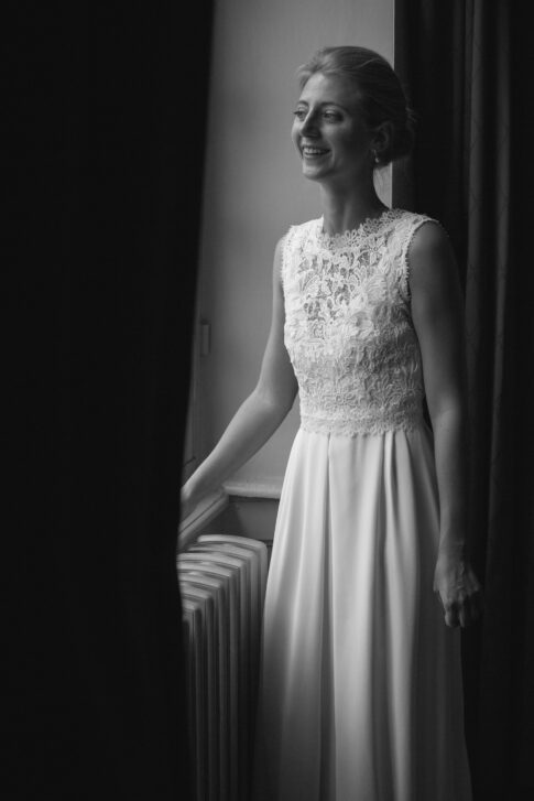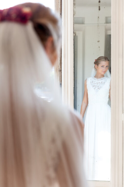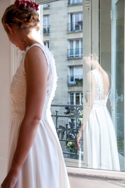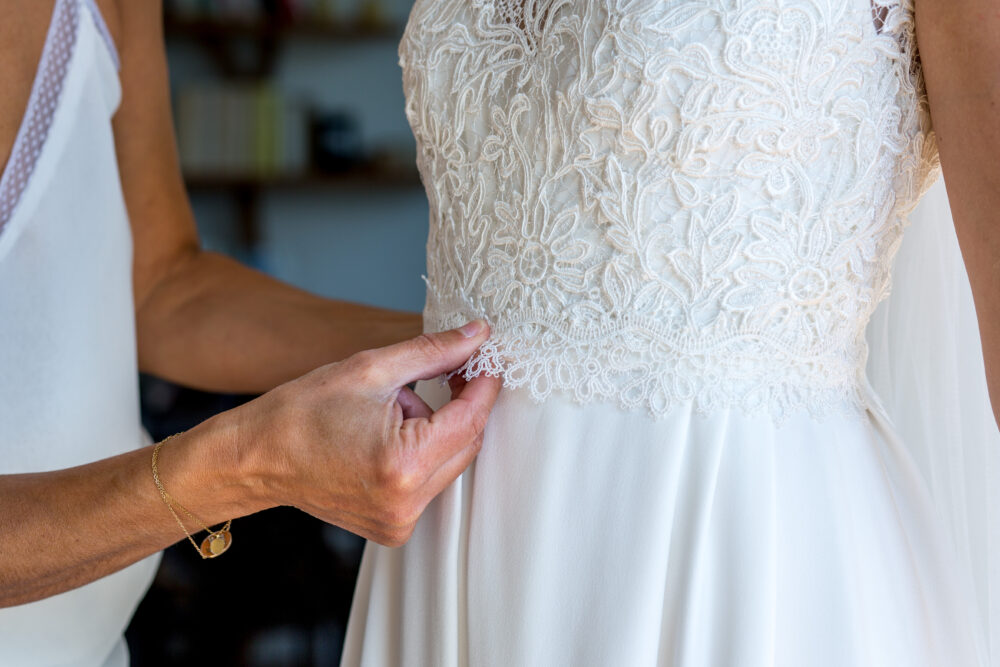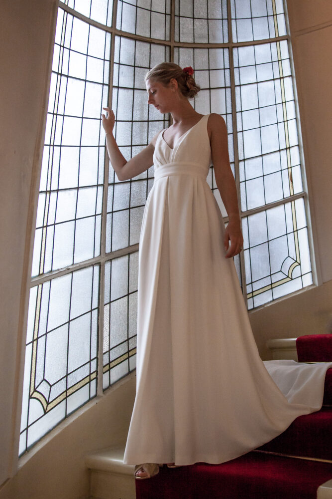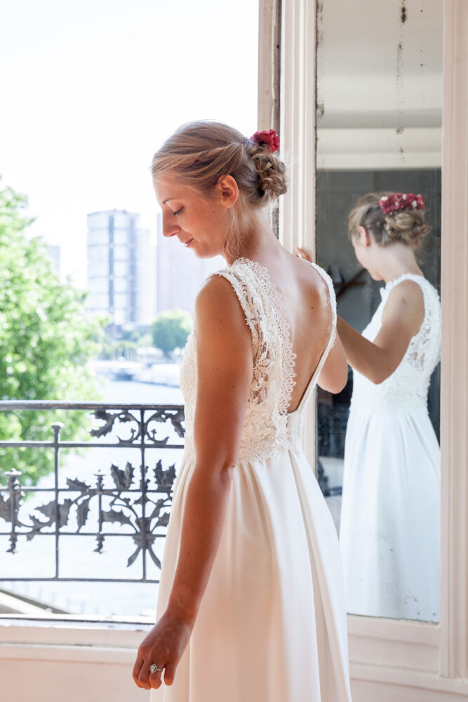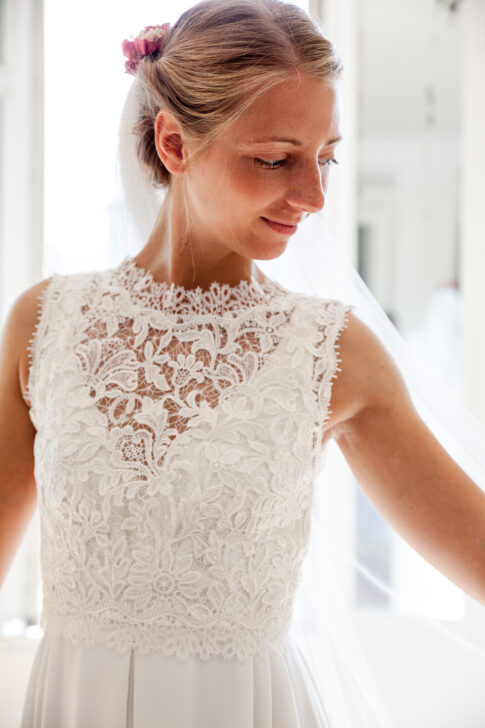Par dessus, un top ajusté, en dentelle de Lyon rebrodée.