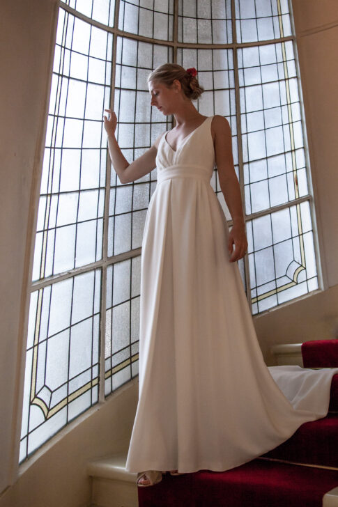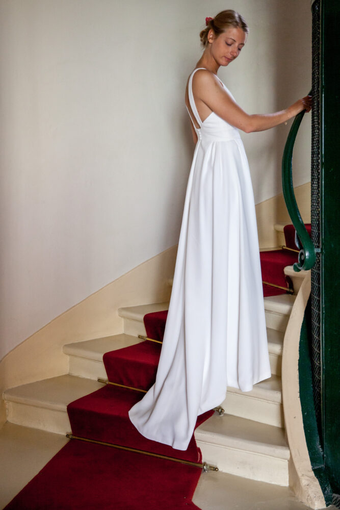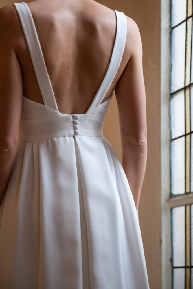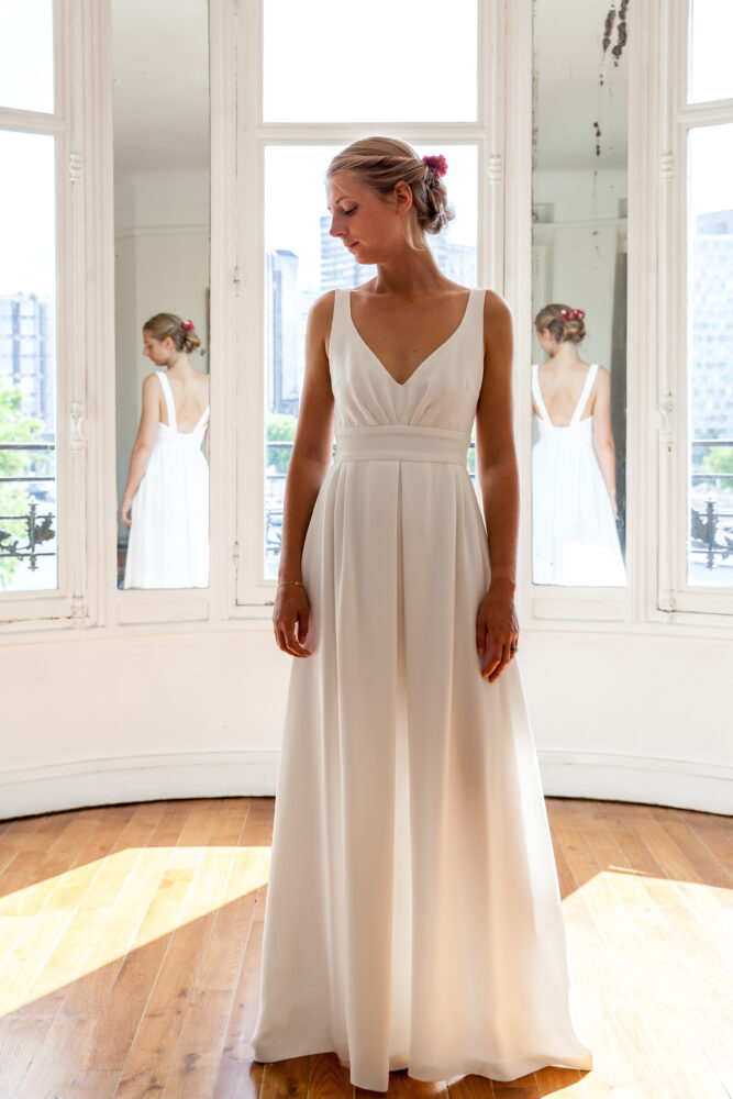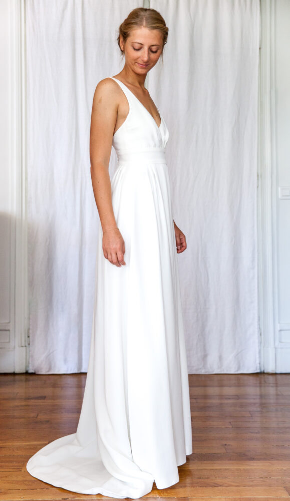Robe en crêpe lourd, à bretelles. Ceinture et jupe à plis plats.