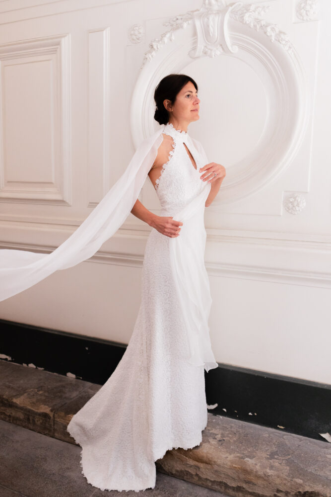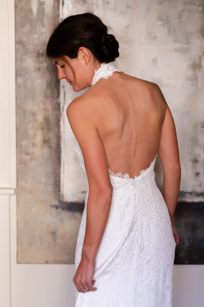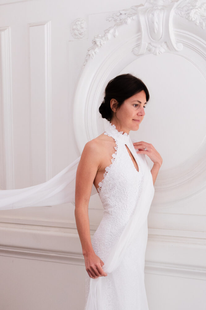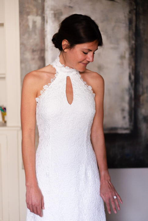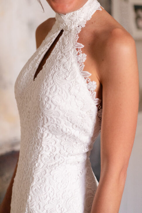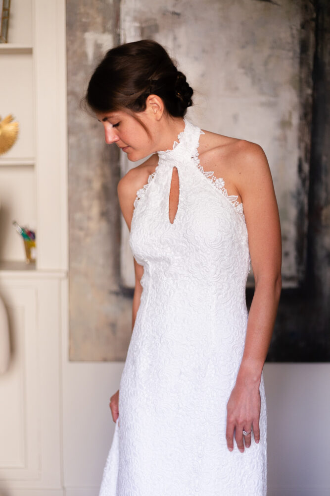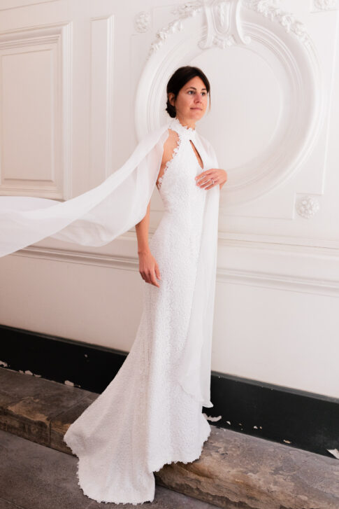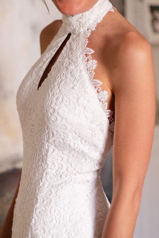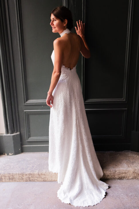 Robe en guipure près du corps avec une longue traine, légèrement ouverte devant.