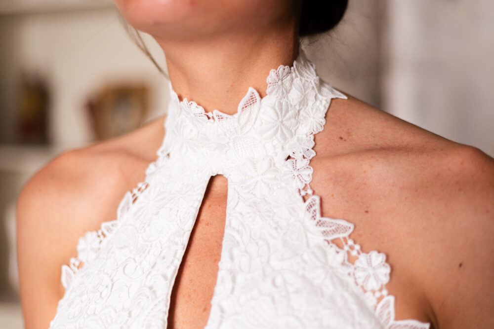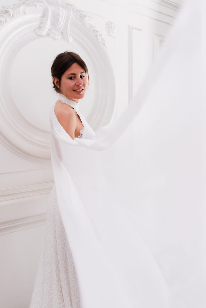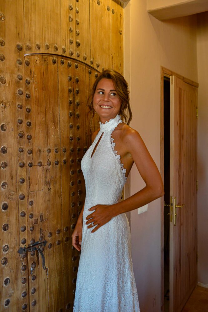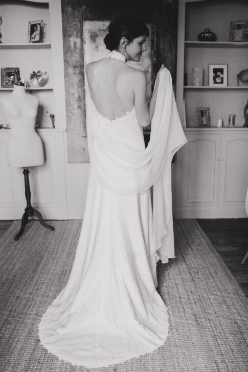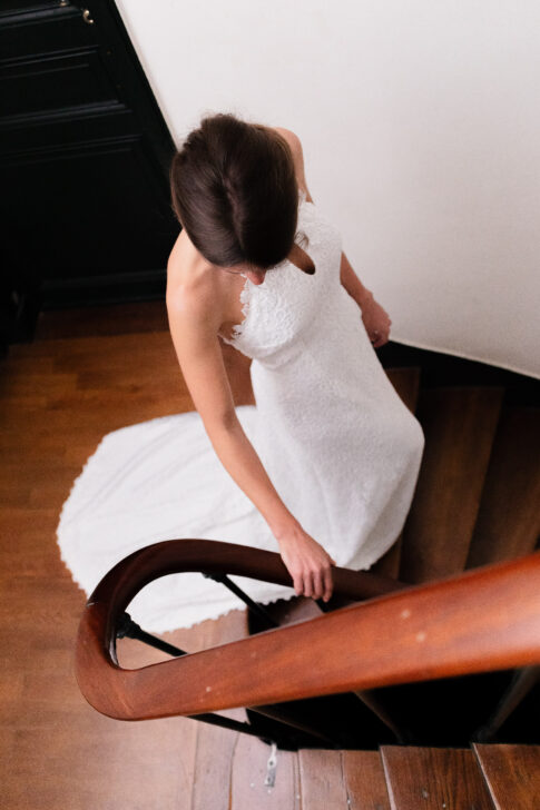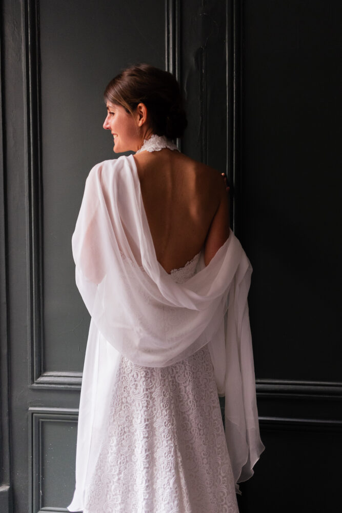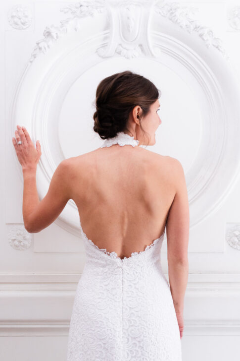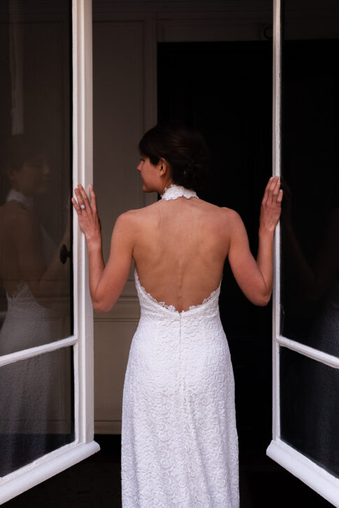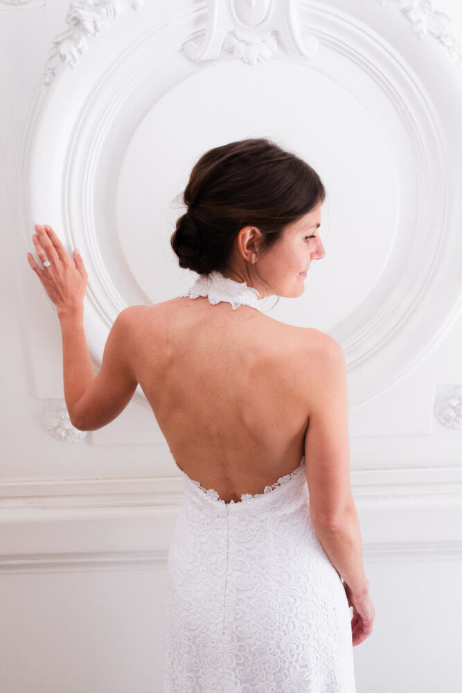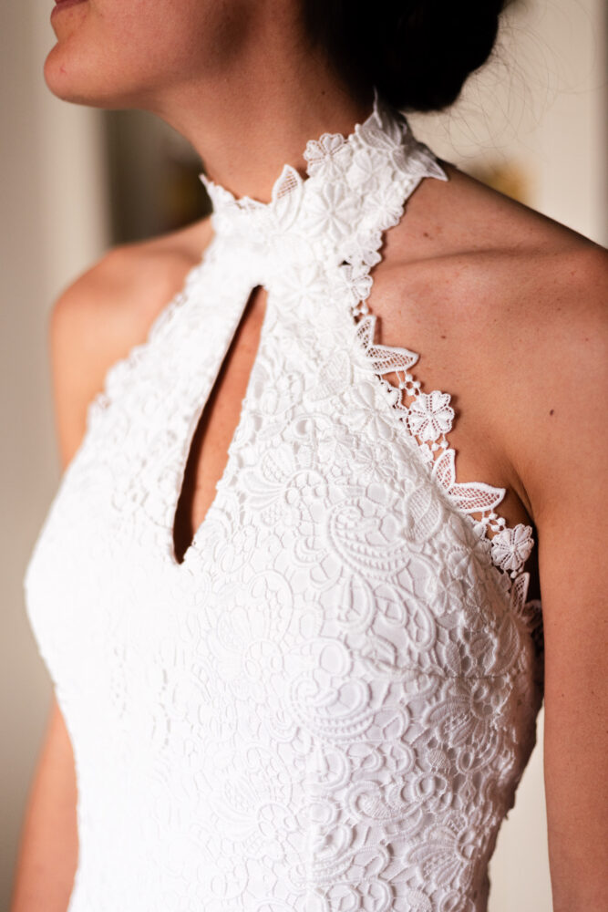 Robe en guipure près du corps avec une longue traine, légèrement ouverte devant.