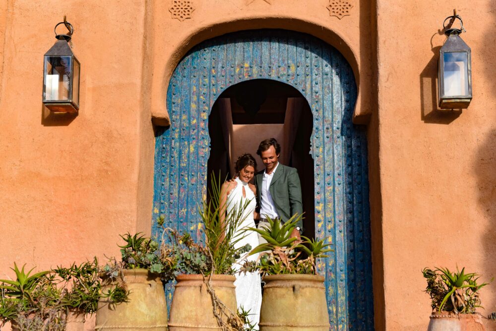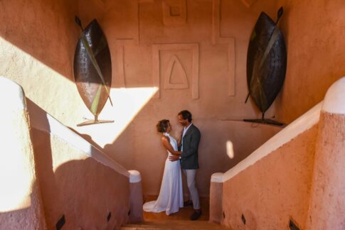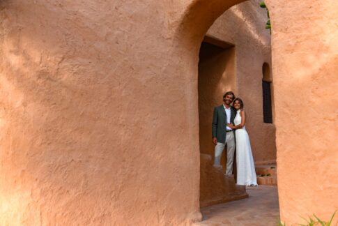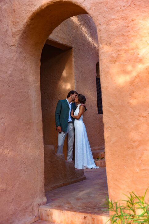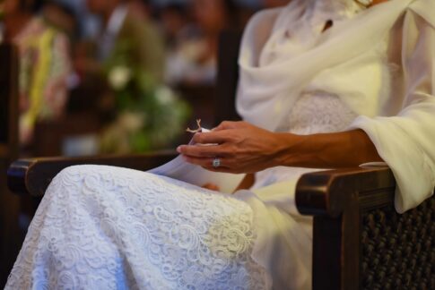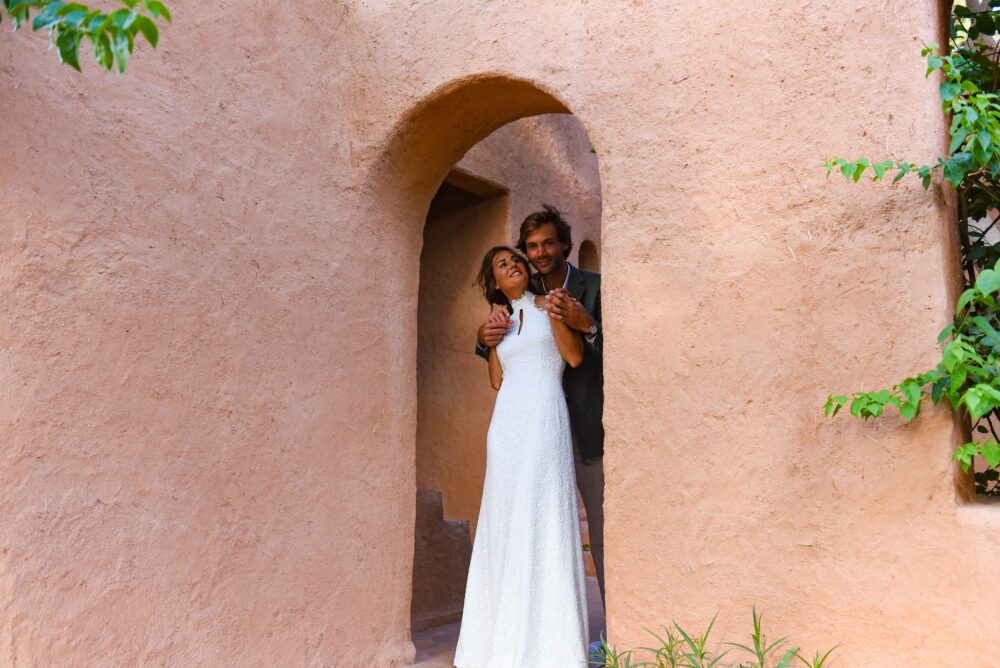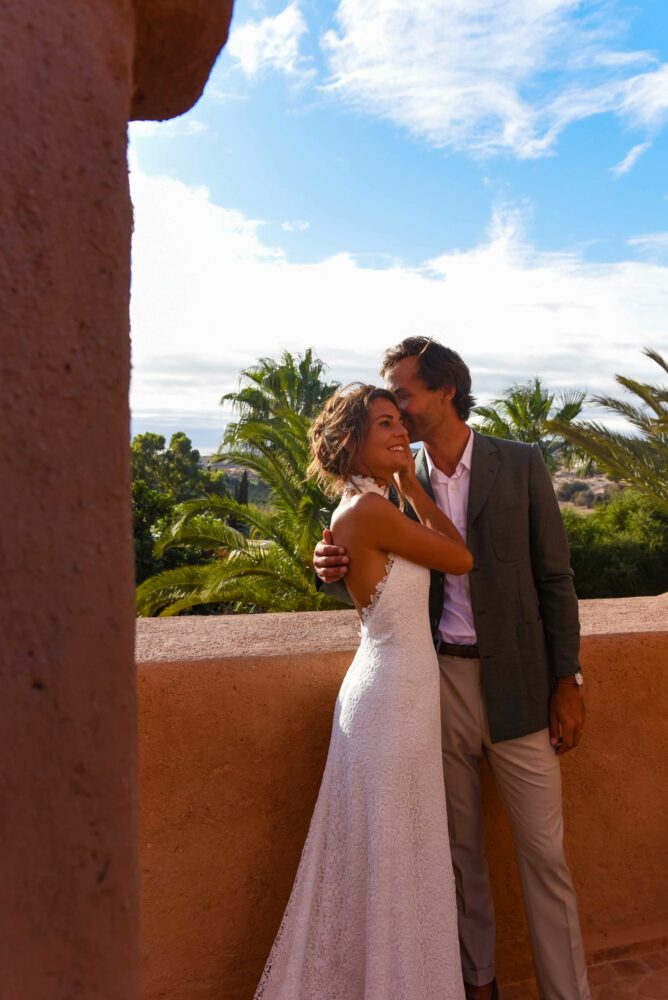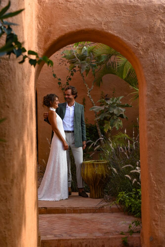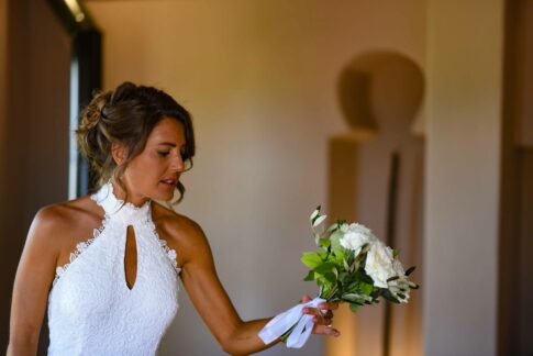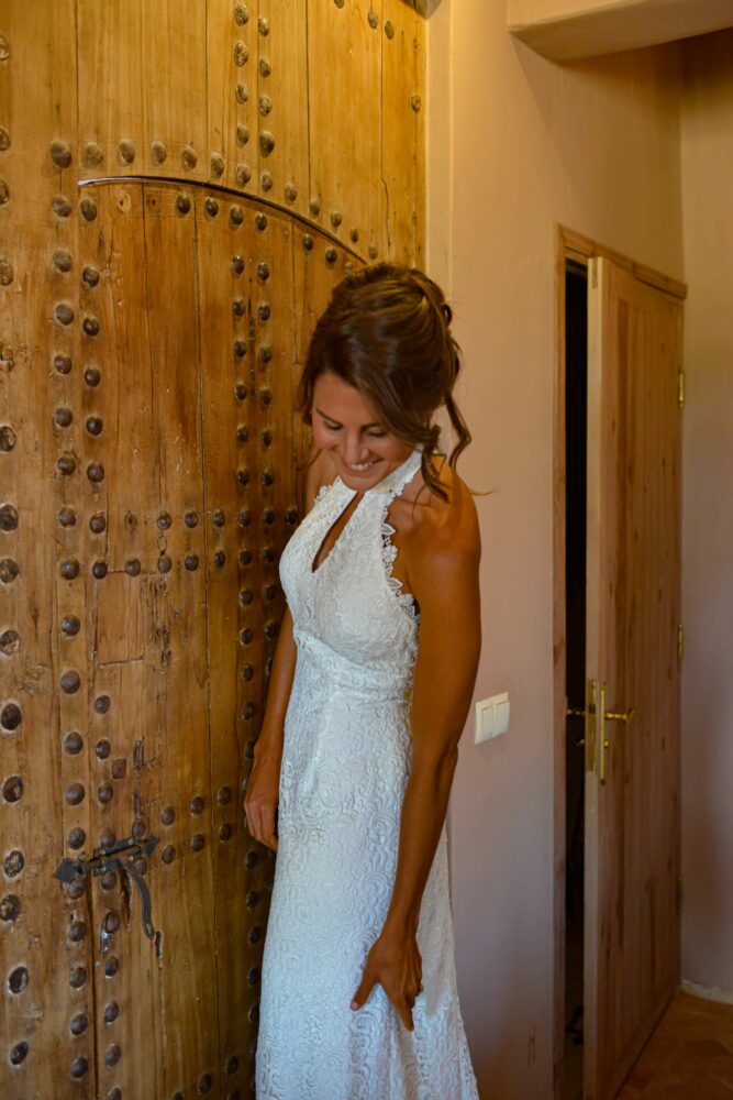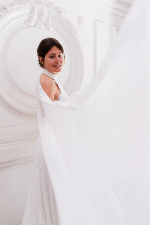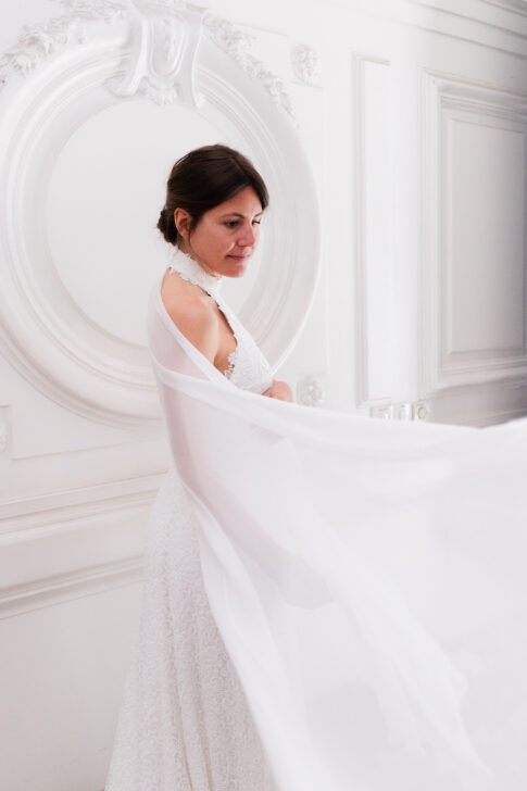 Robe en guipure près du corps avec une longue traine, légèrement ouverte devant.