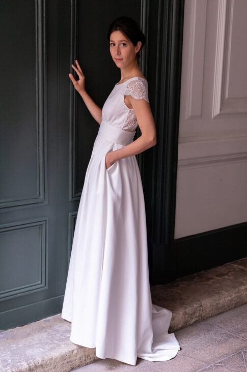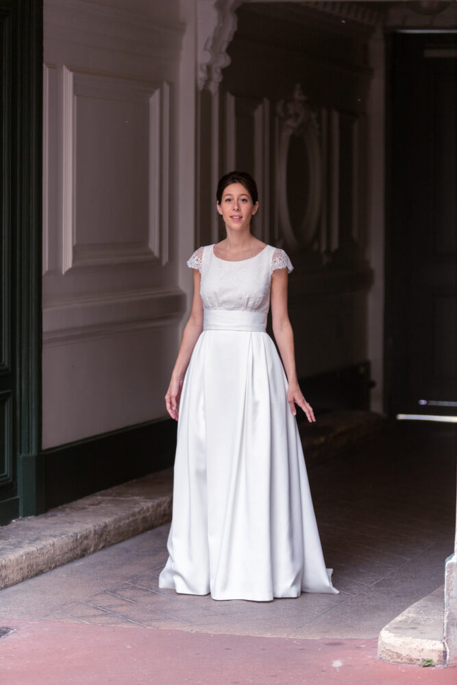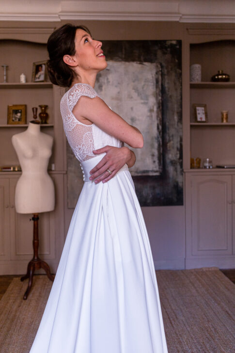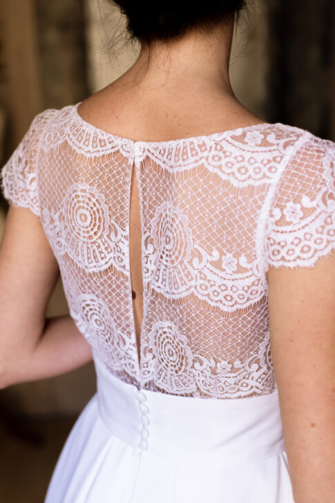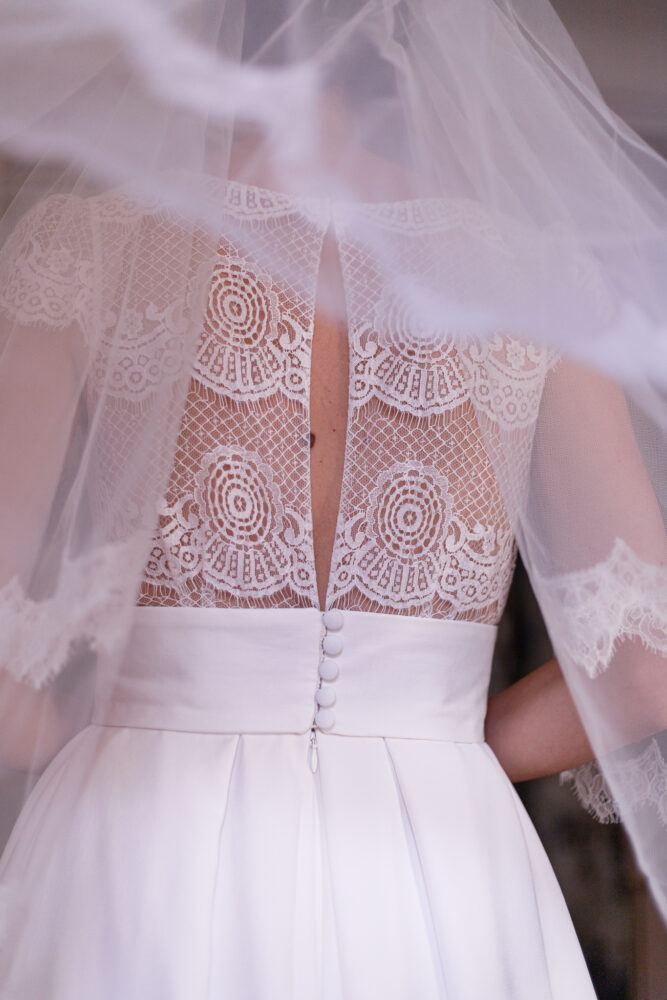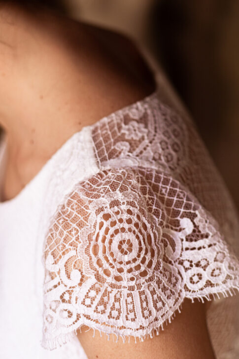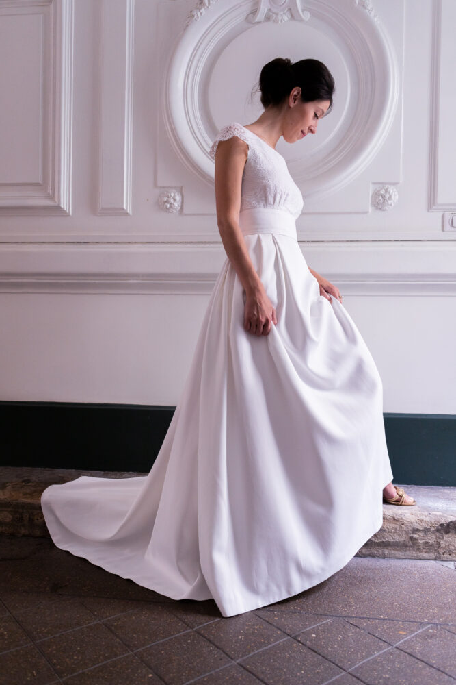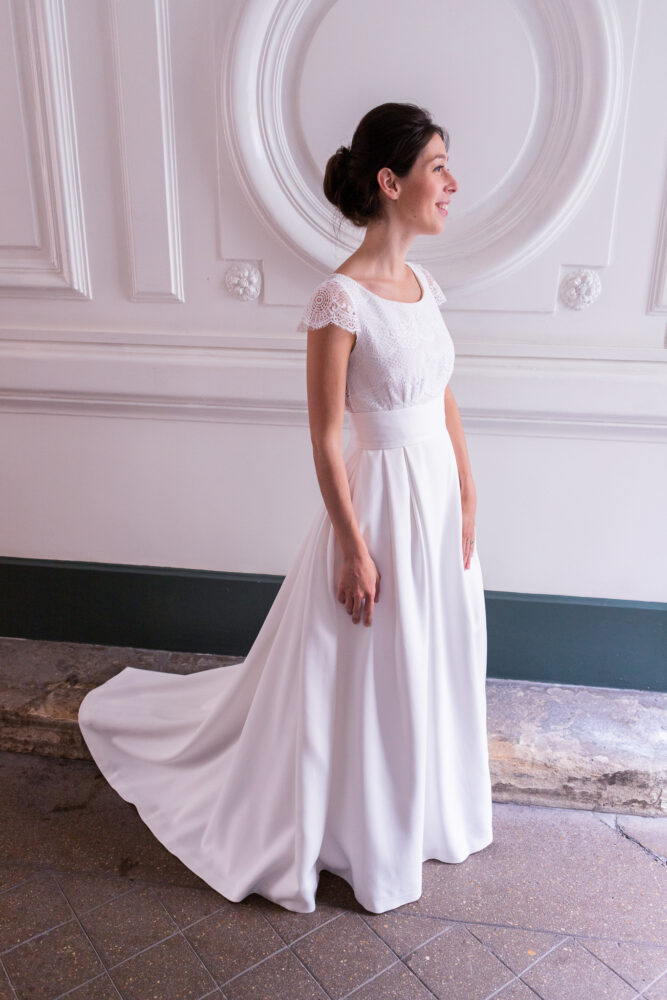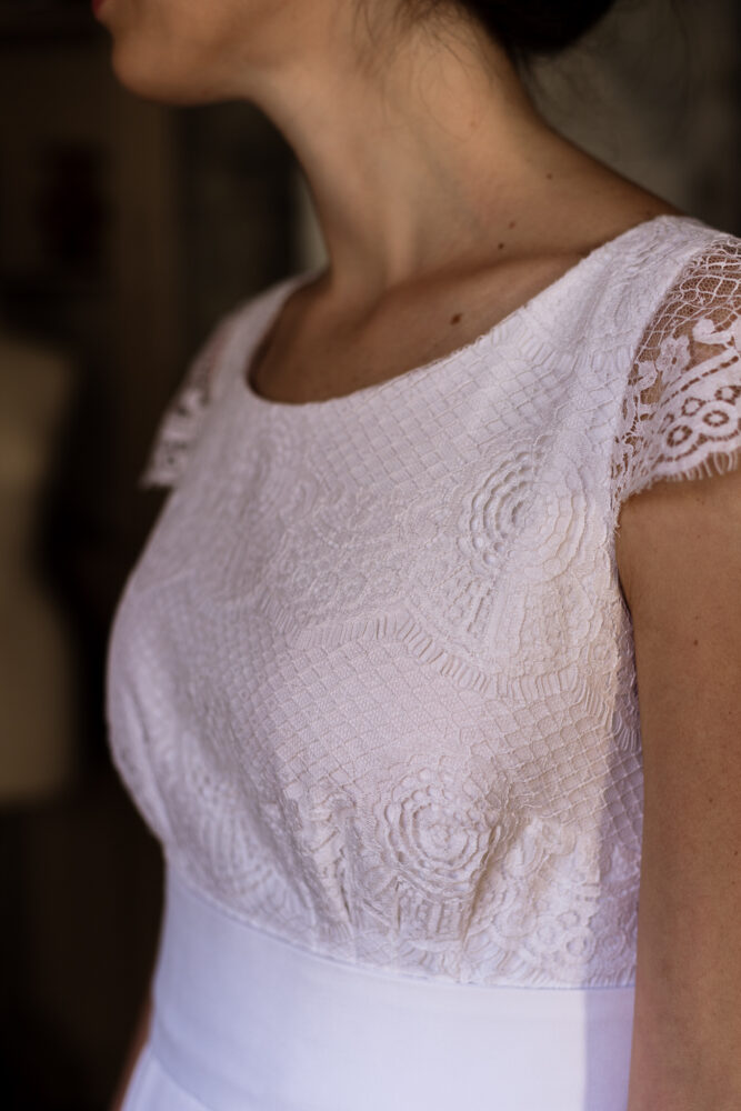 Robe ceinturée avec un top en dentelle de Calais « Art déco ».