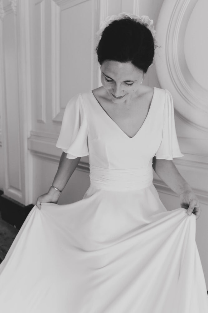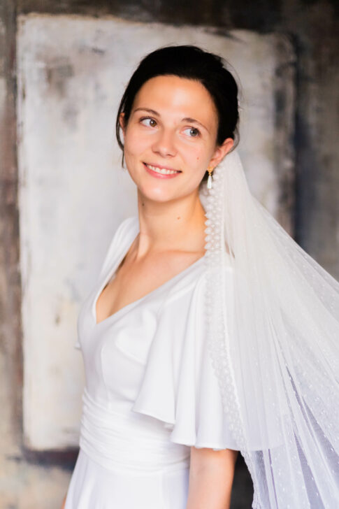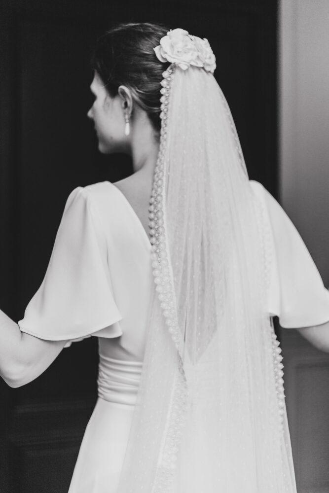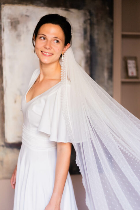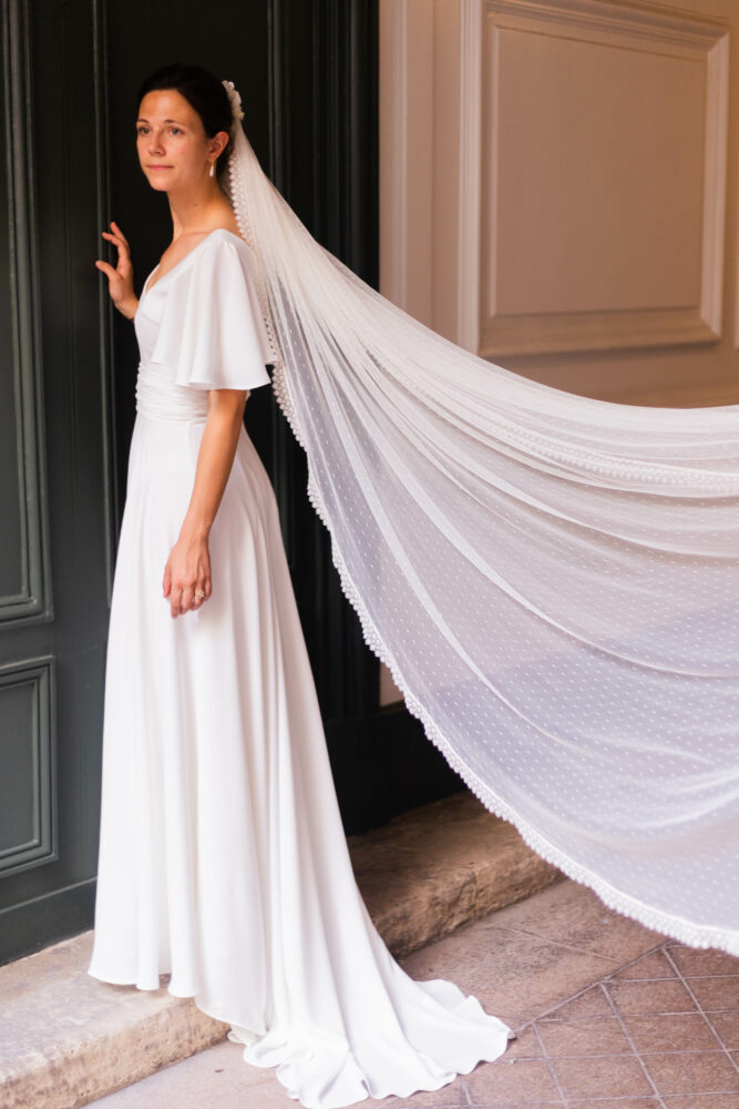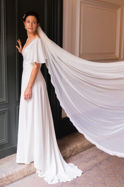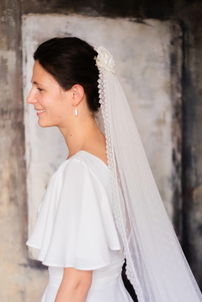 Voile en plumetis bordé d’une dentelle de Calais.
