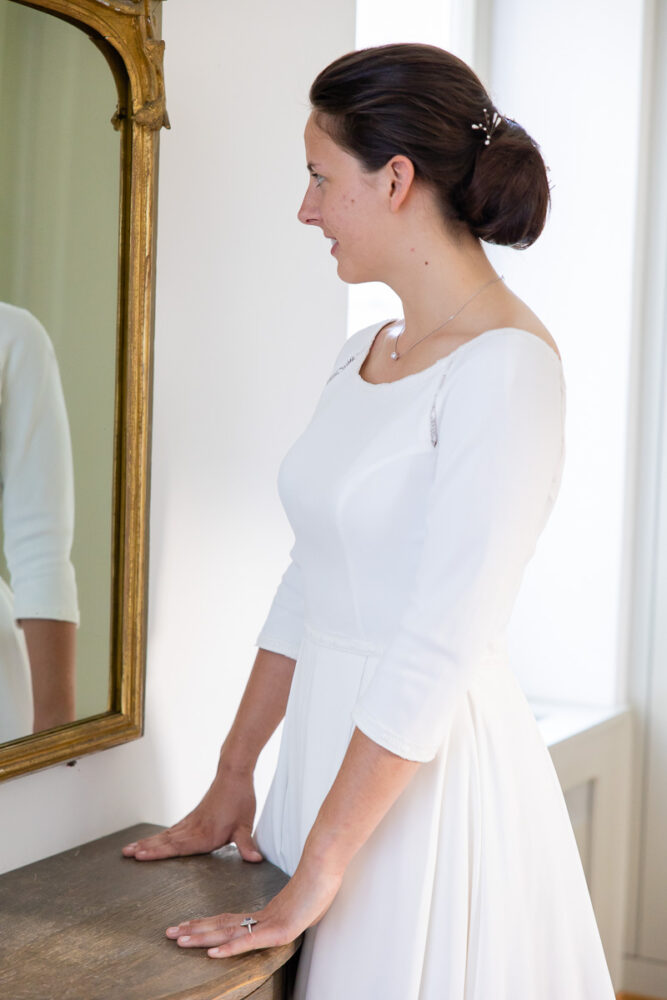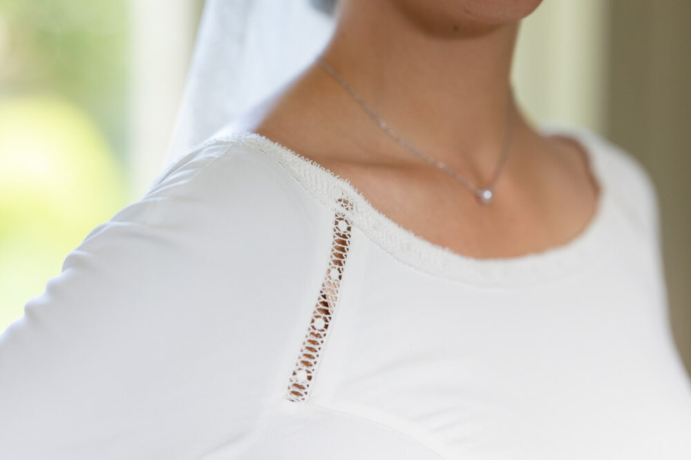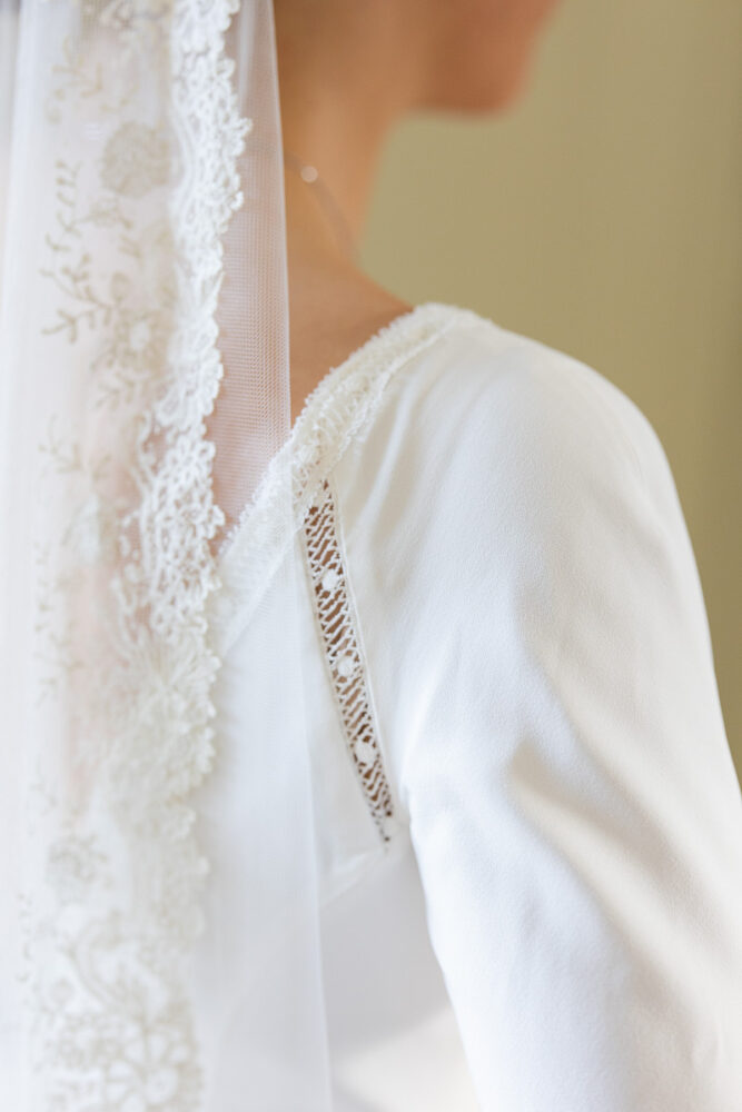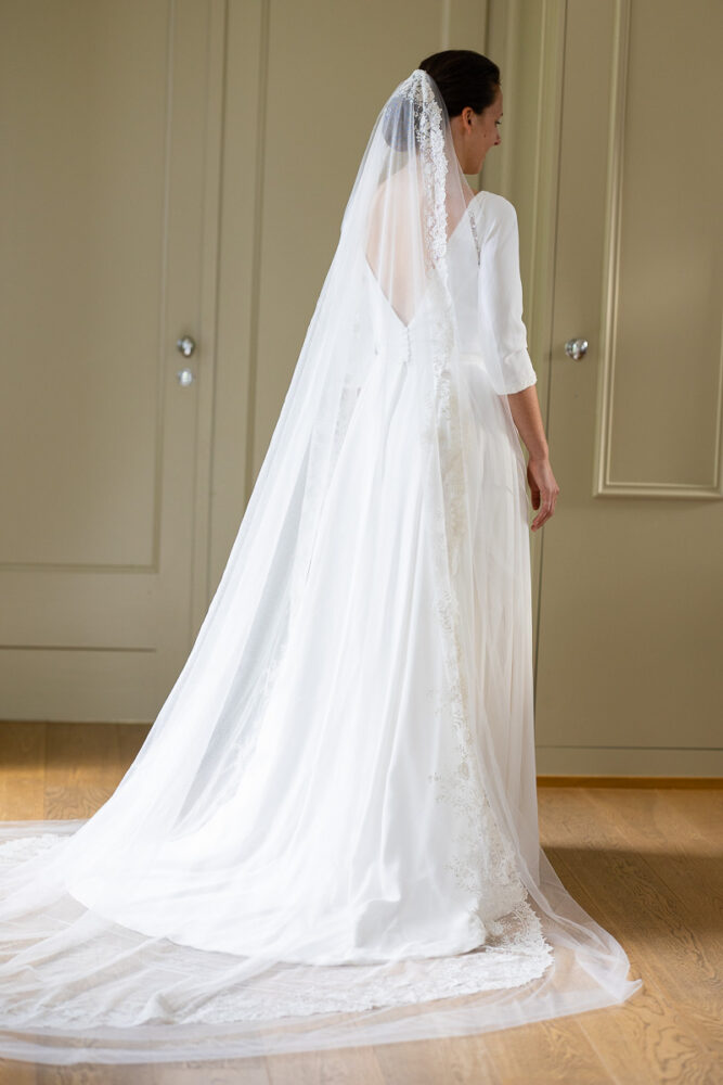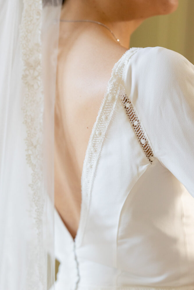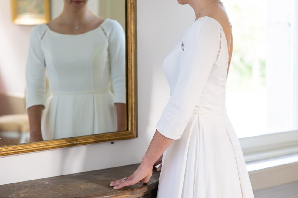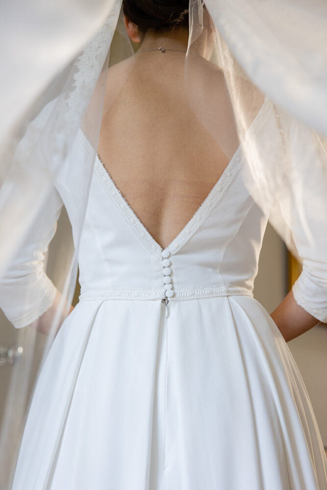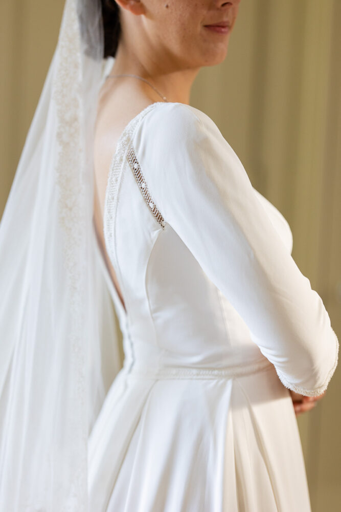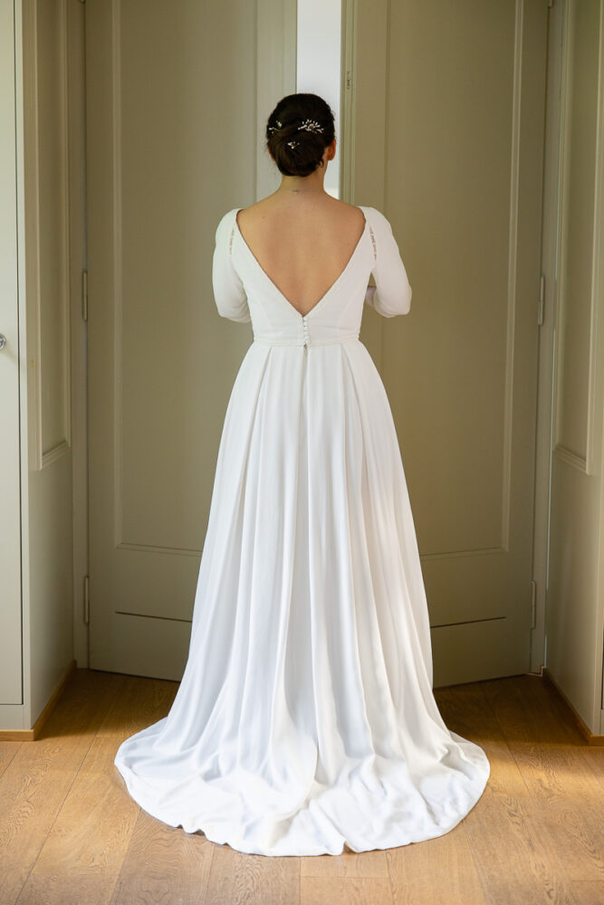 Robe en crêpe fluide, manches ¾, avec des emmanchures américaines ajourées d’un petit galon, en rappel à l’encolure et à la taille.