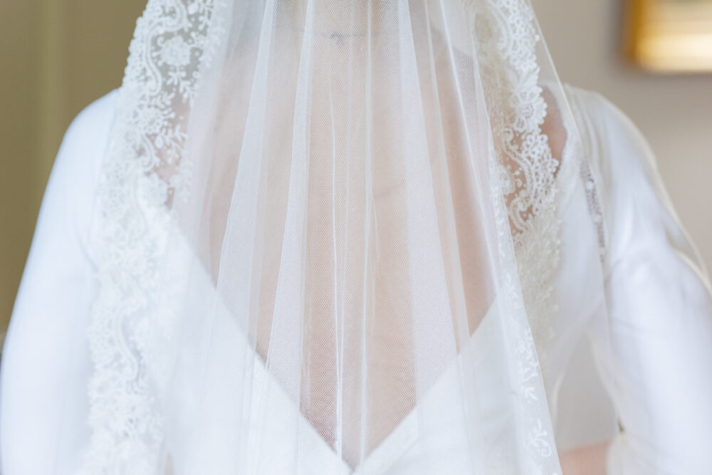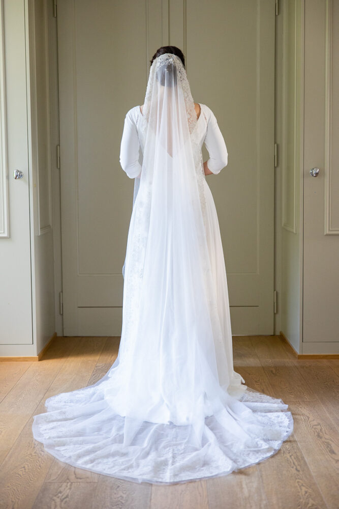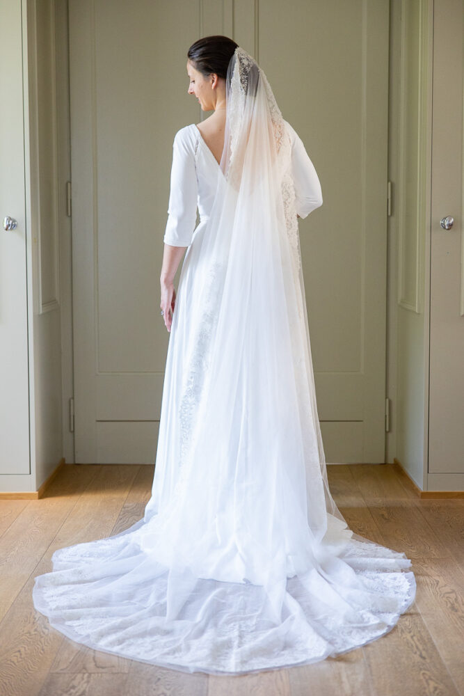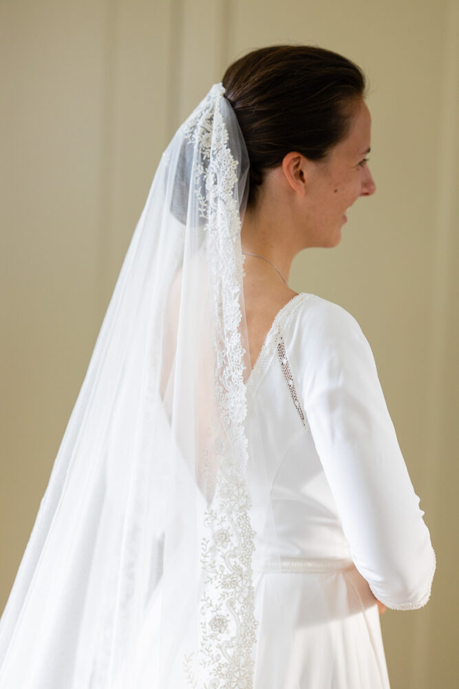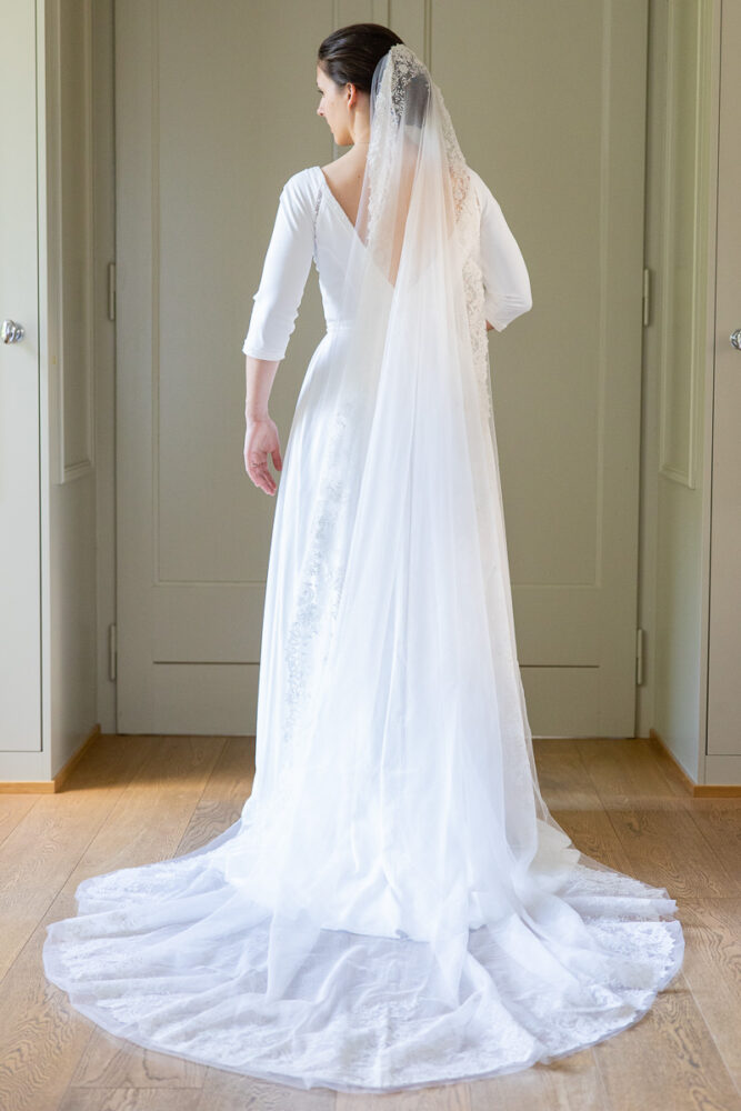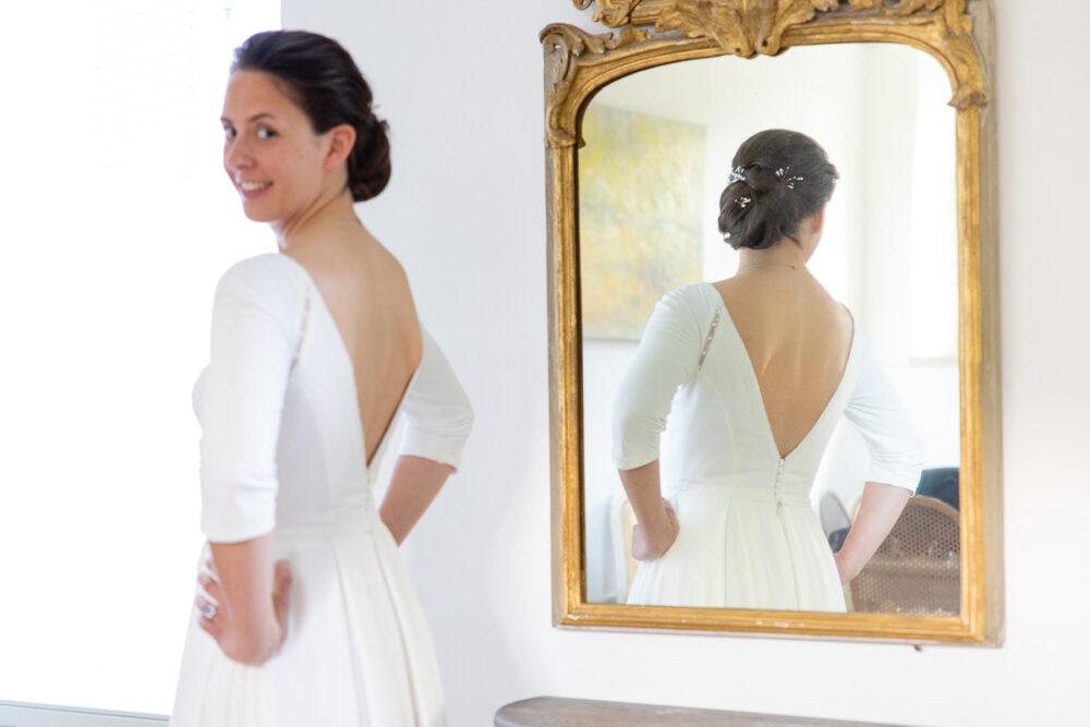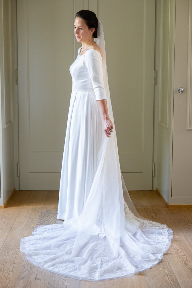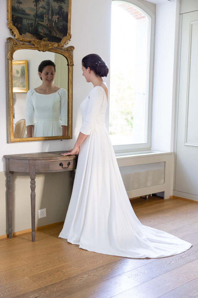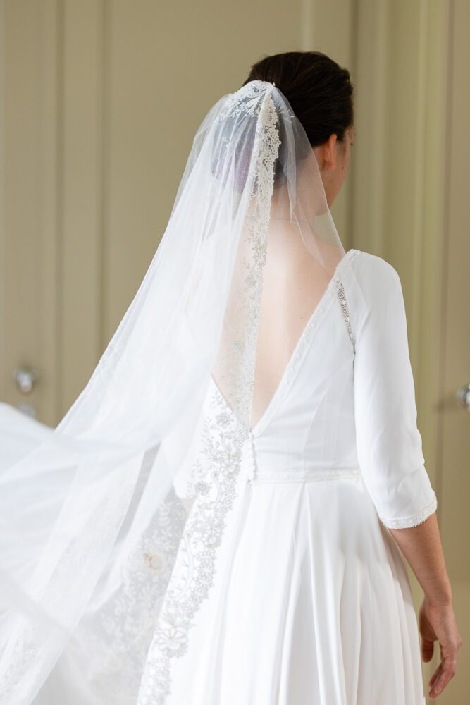 Robe en crêpe fluide, manches ¾, avec des emmanchures américaines ajourées d’un petit galon, en rappel à l’encolure et à la taille.