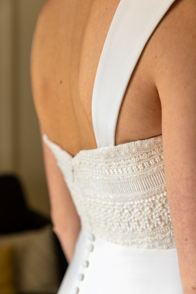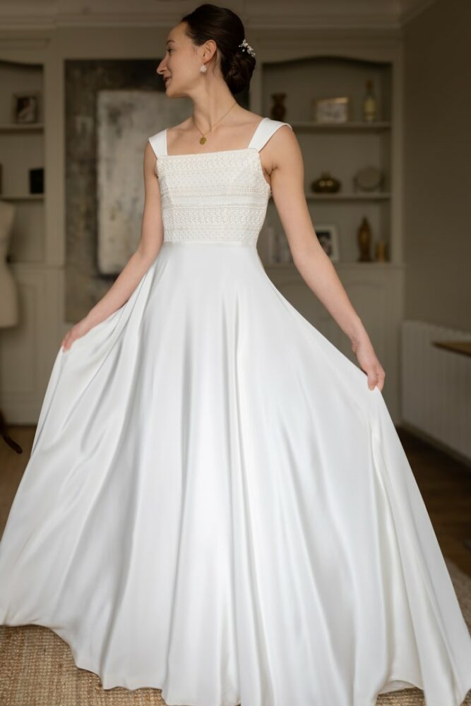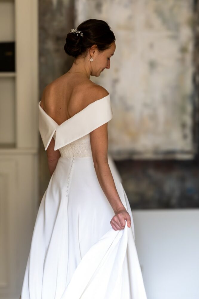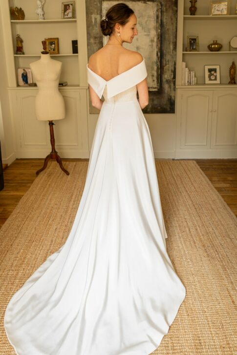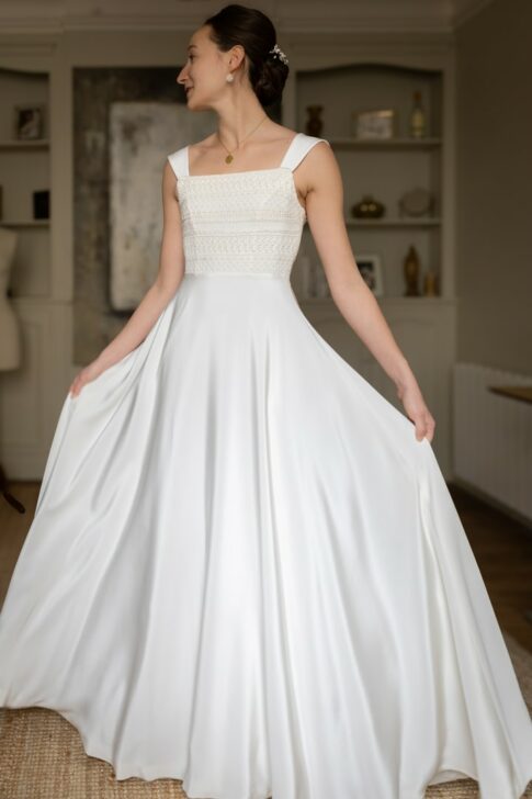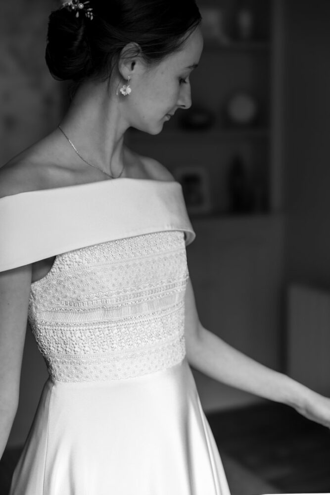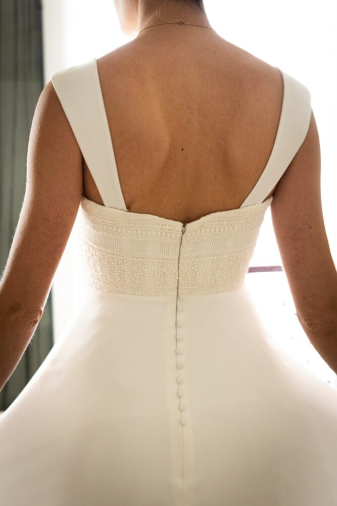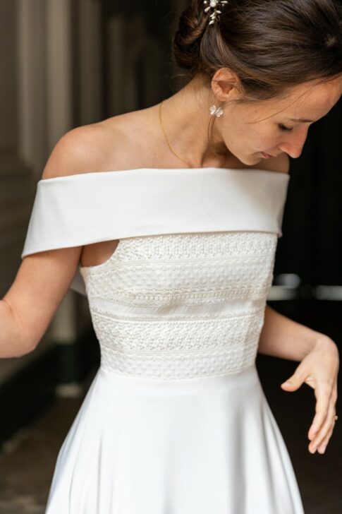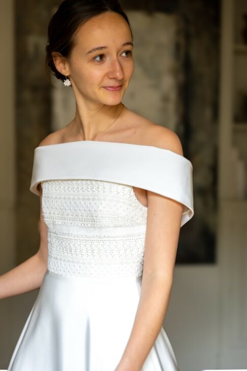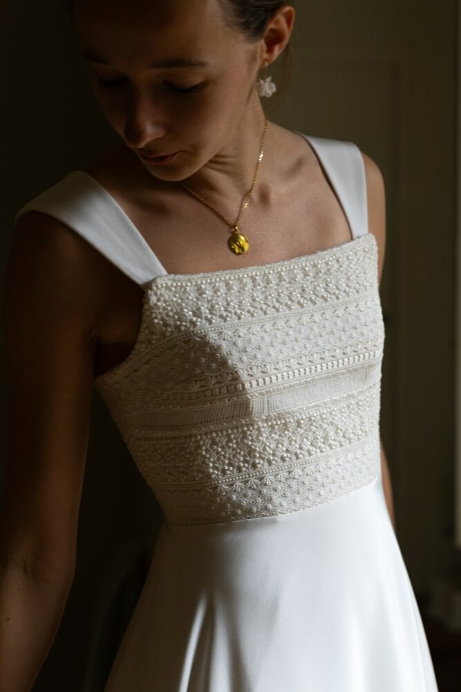 Robe en crepe de soie et guipure, avec le bandeau amovible,