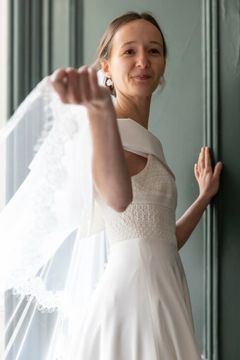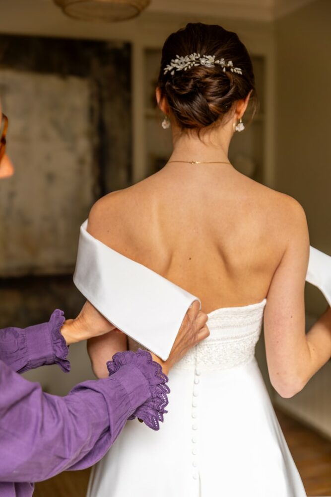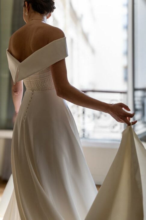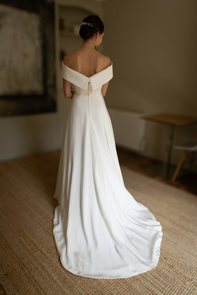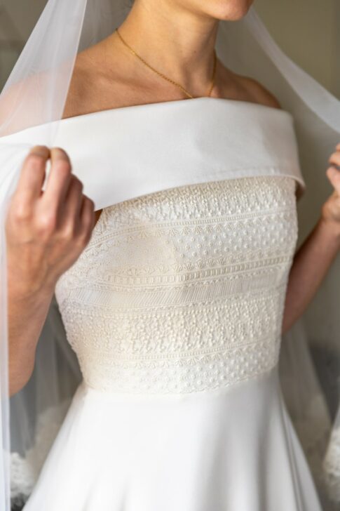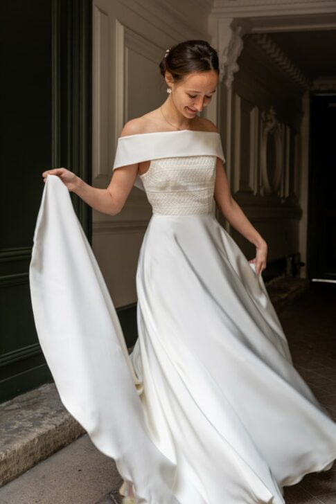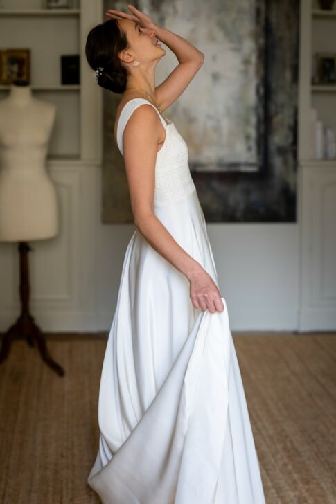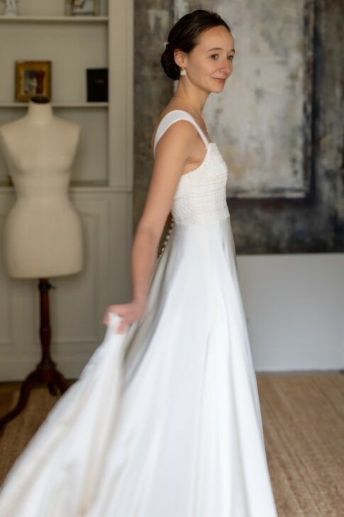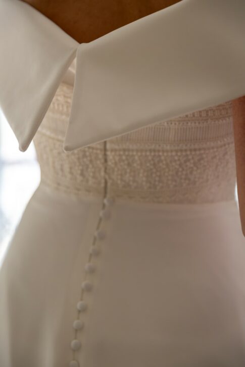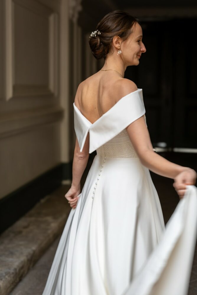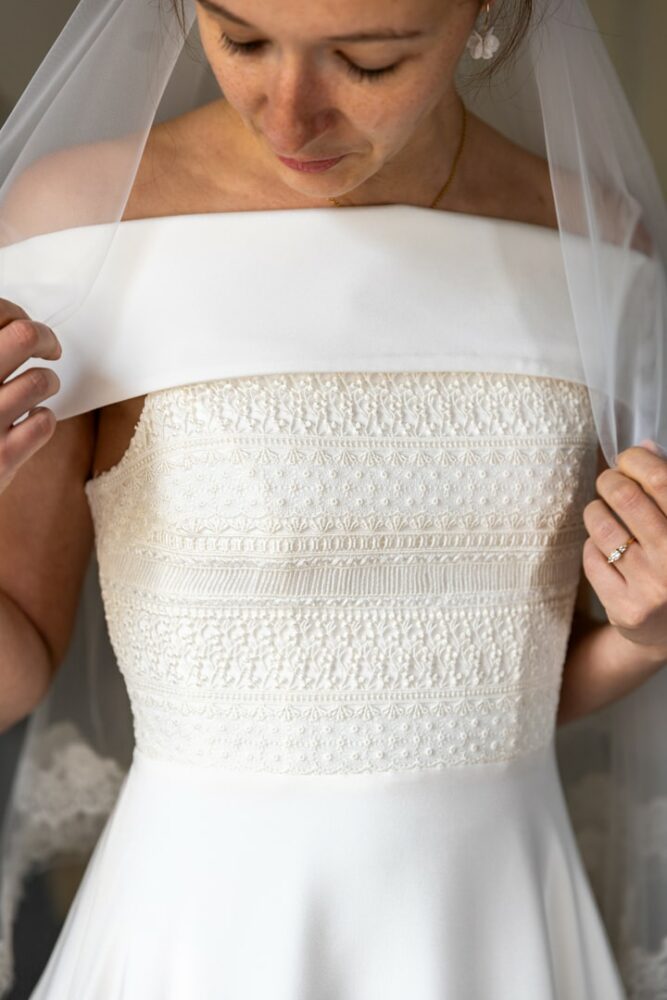 Robe en crepe de soie et guipure, avec le bandeau amovible,