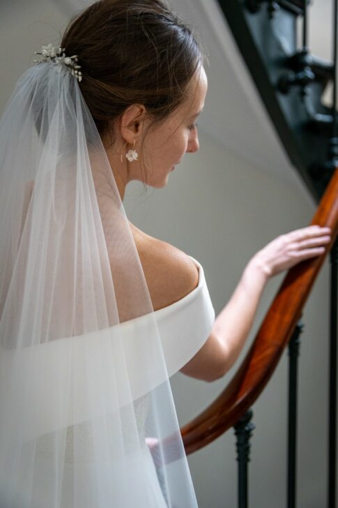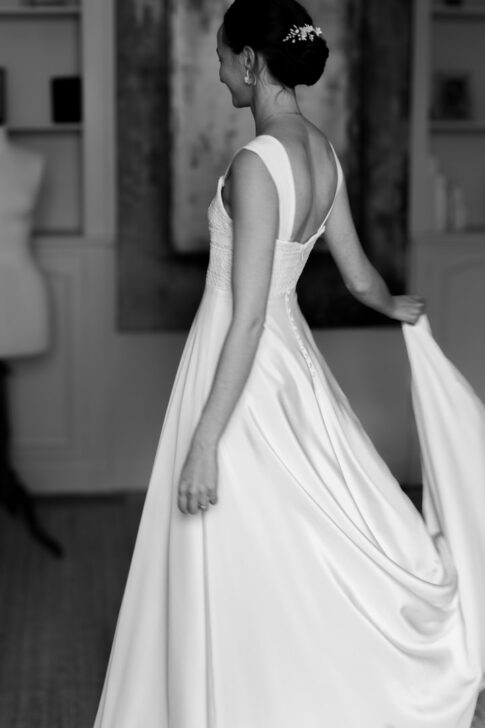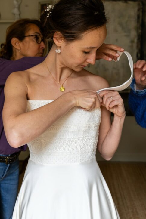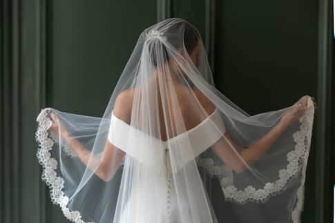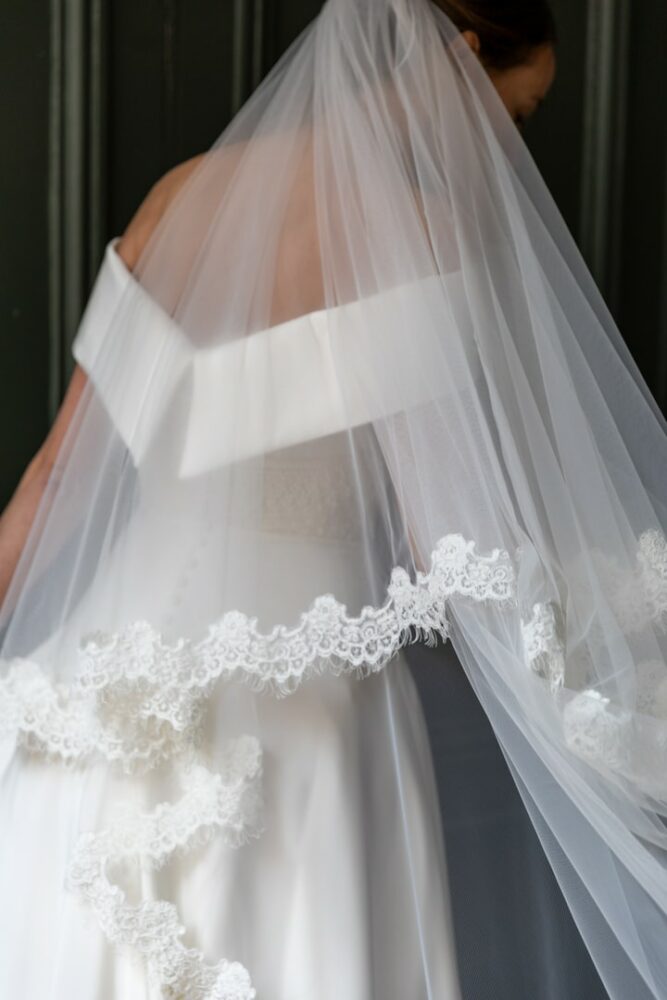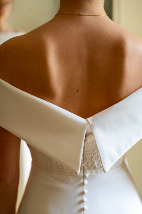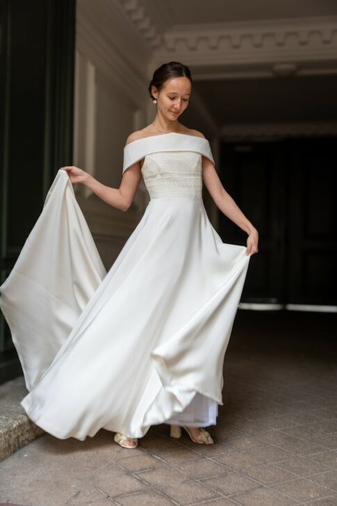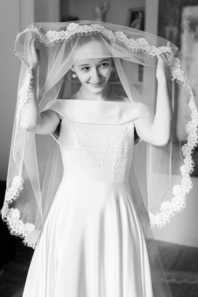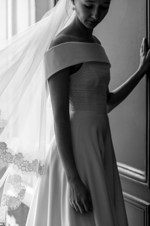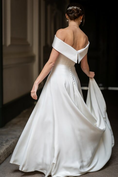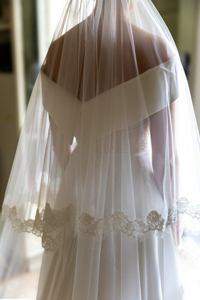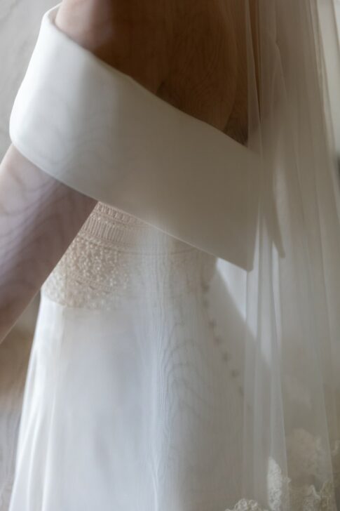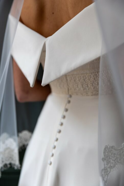 Robe en crepe de soie et guipure, avec le bandeau amovible,