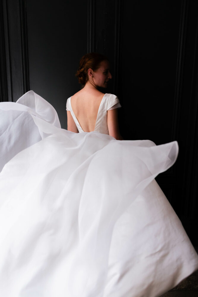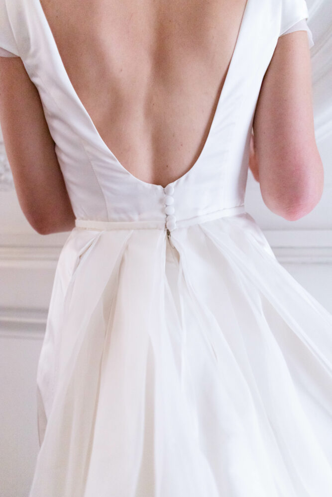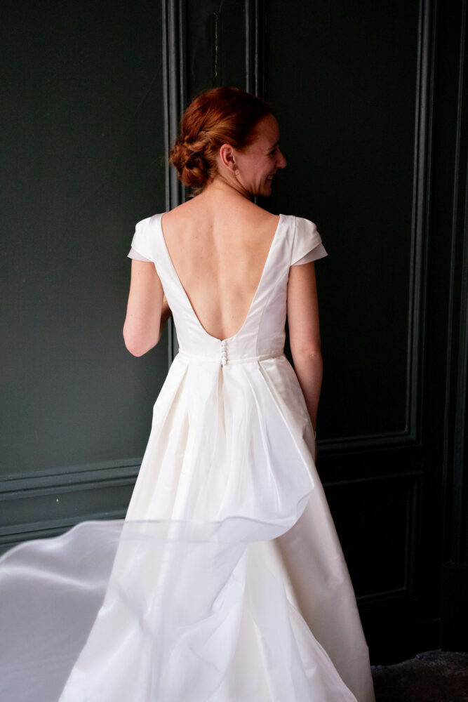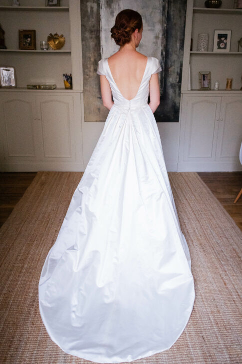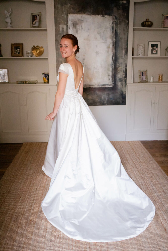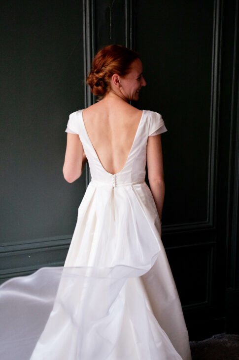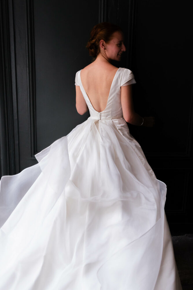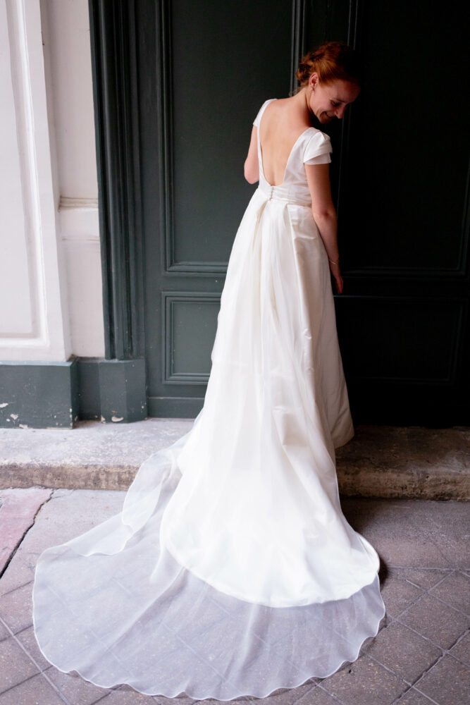 Petites manches en satin et en organza de soie. Dans le dos, une traine amovible en organza de soie.