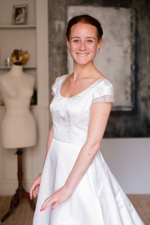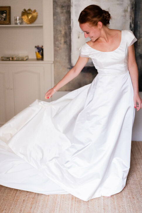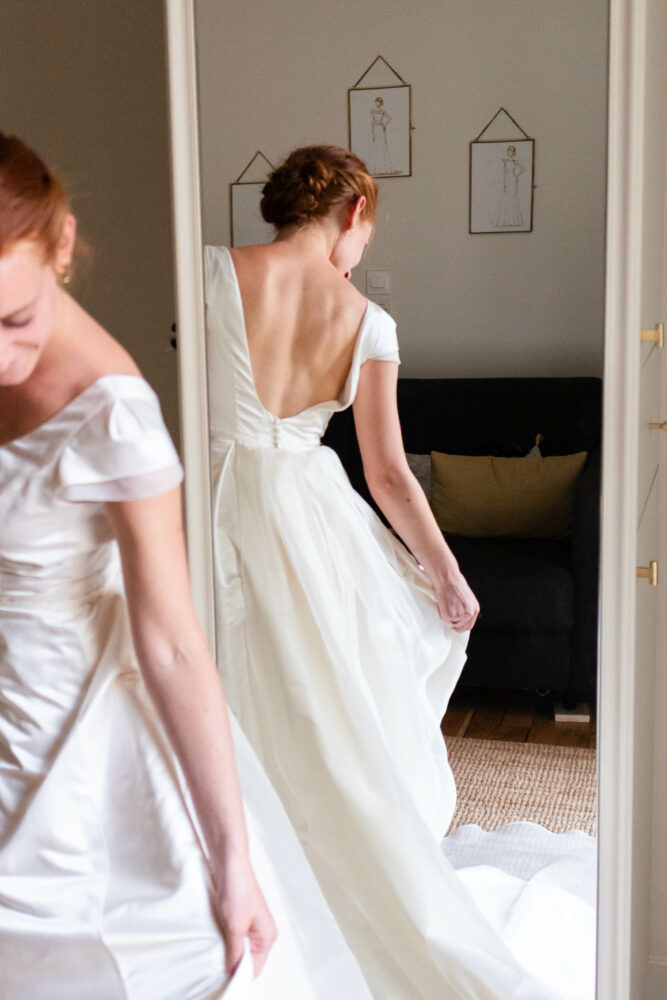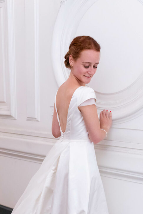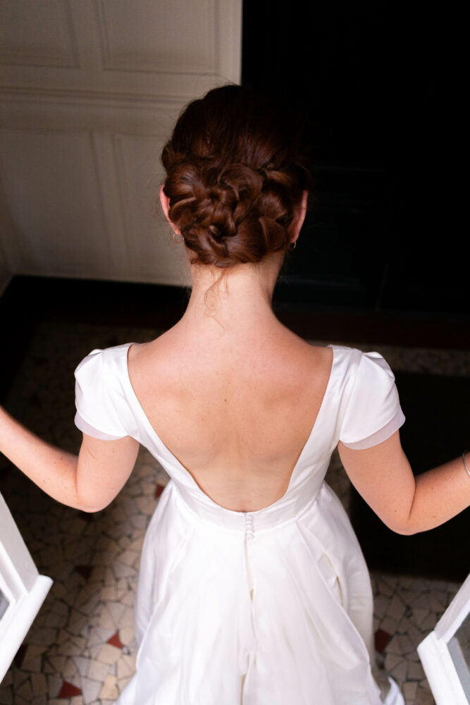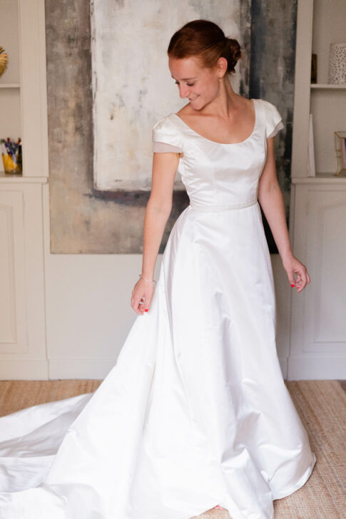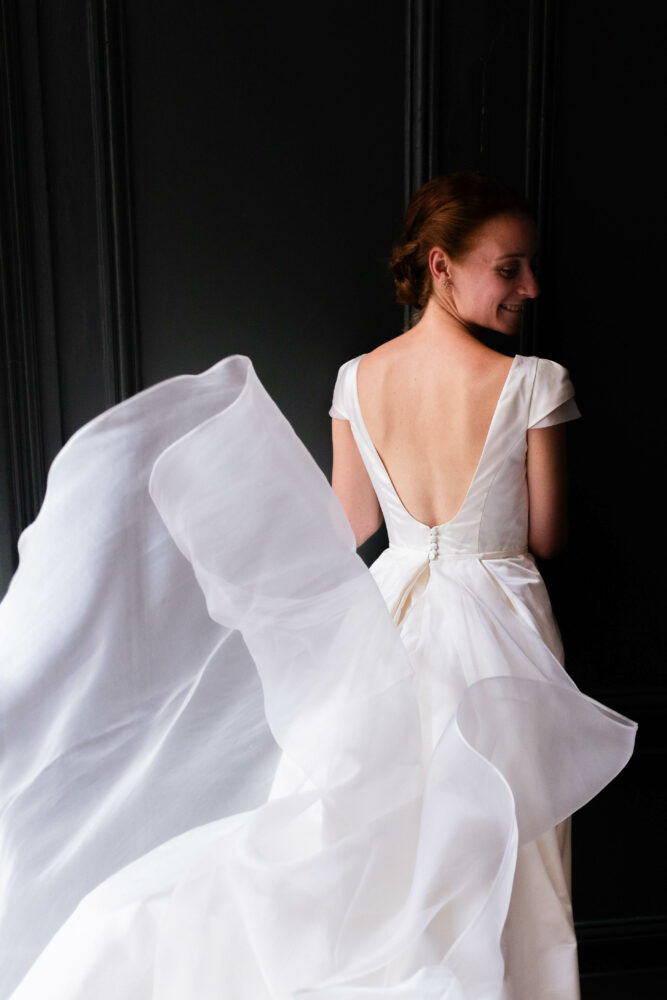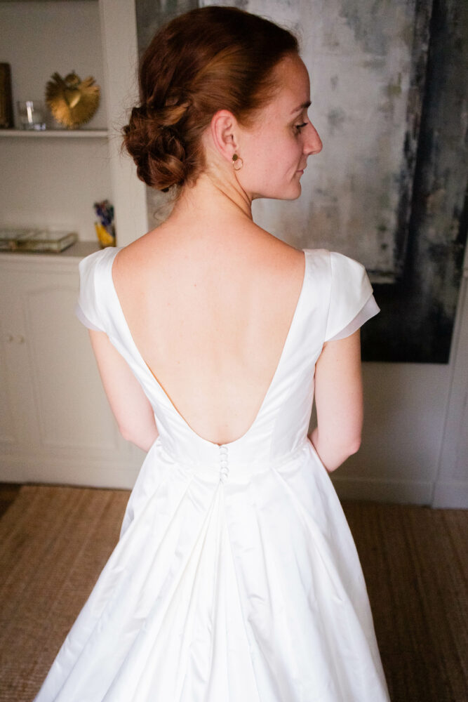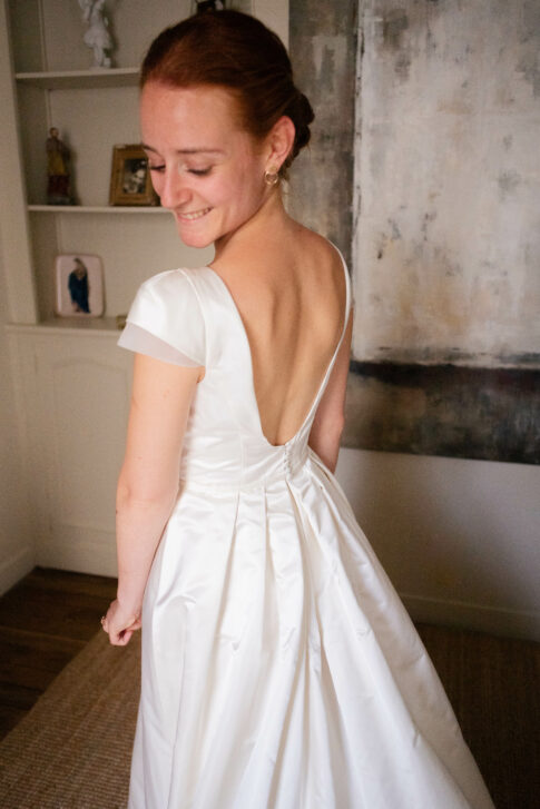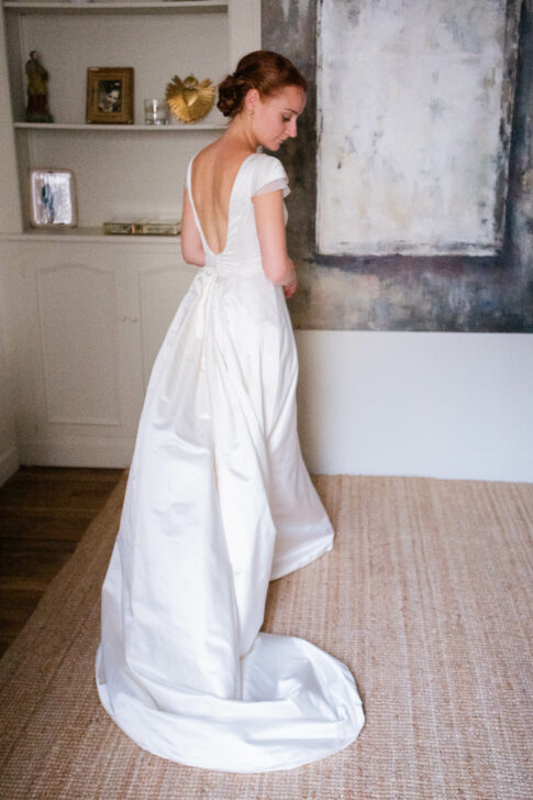 Petites manches en satin et en organza de soie. Dans le dos, une traine amovible en organza de soie.