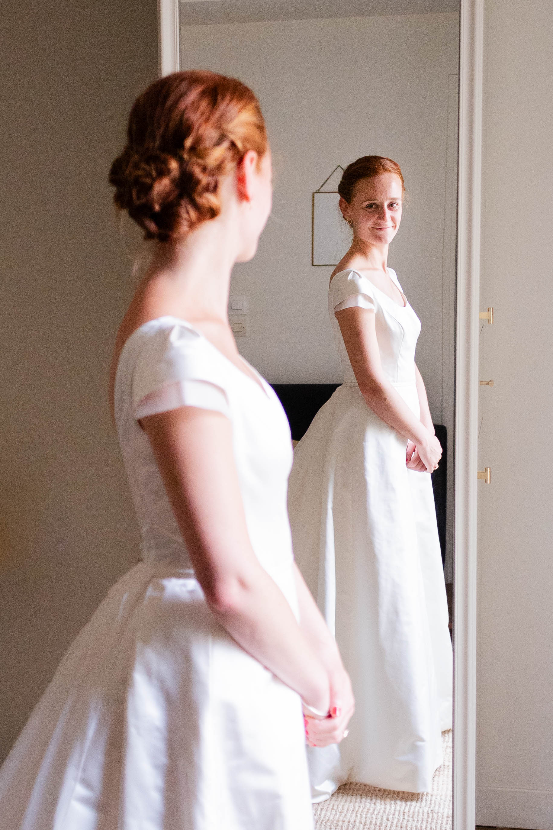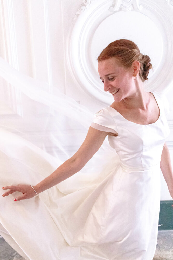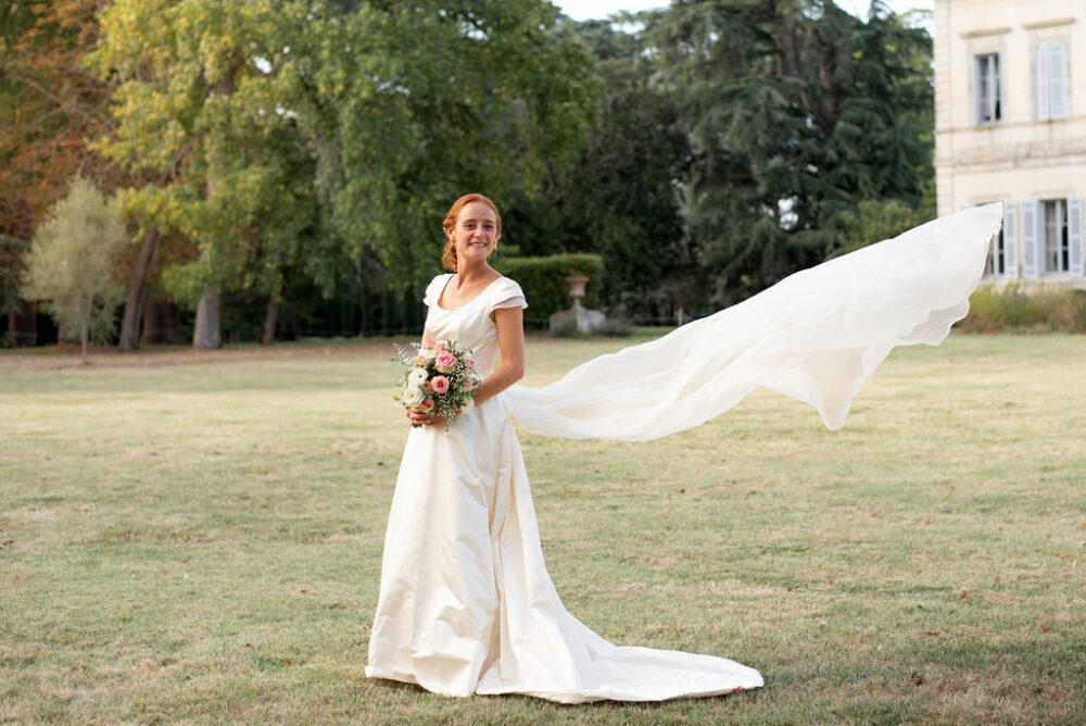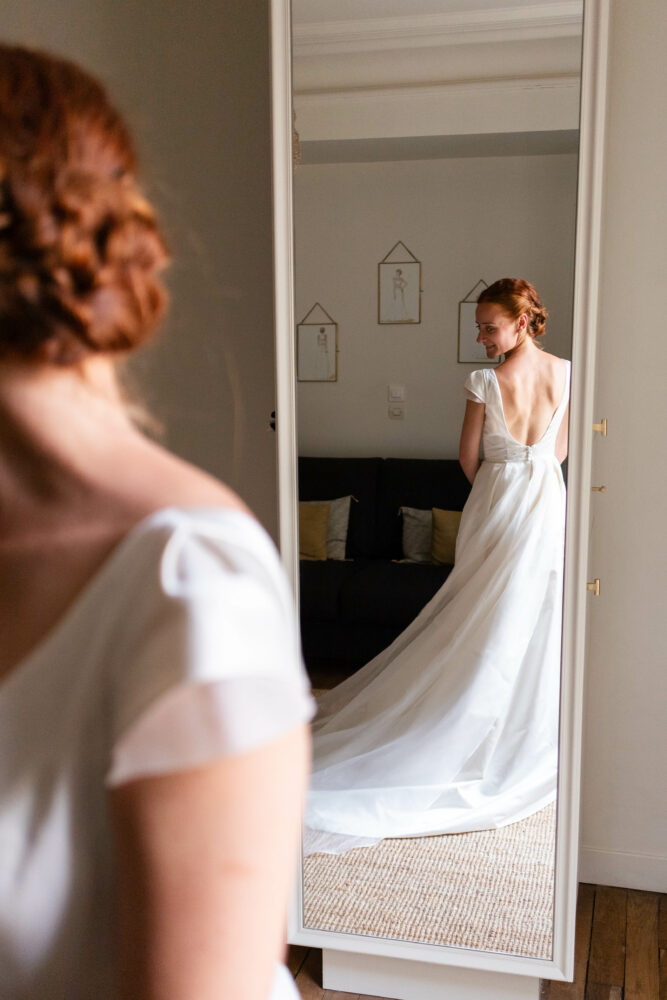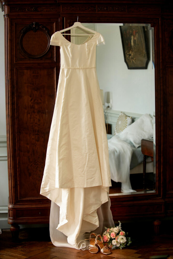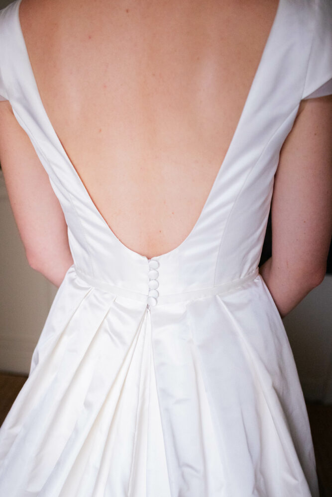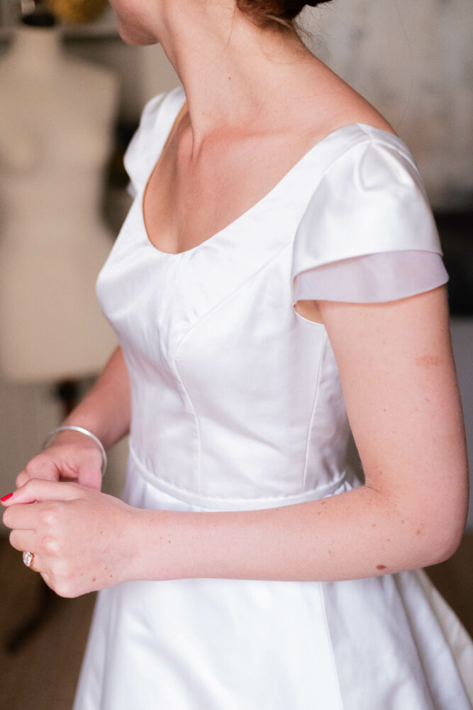 Petites manches en satin et en organza de soie. Dans le dos, une traine amovible en organza de soie.