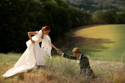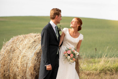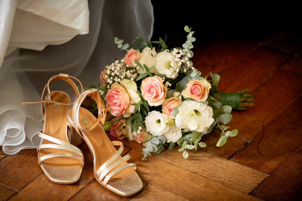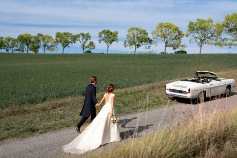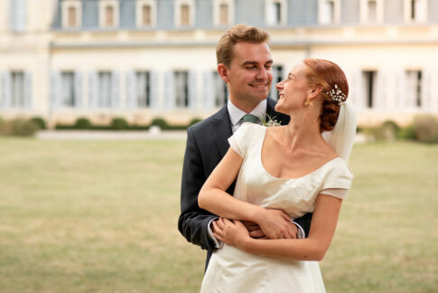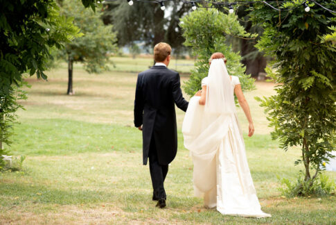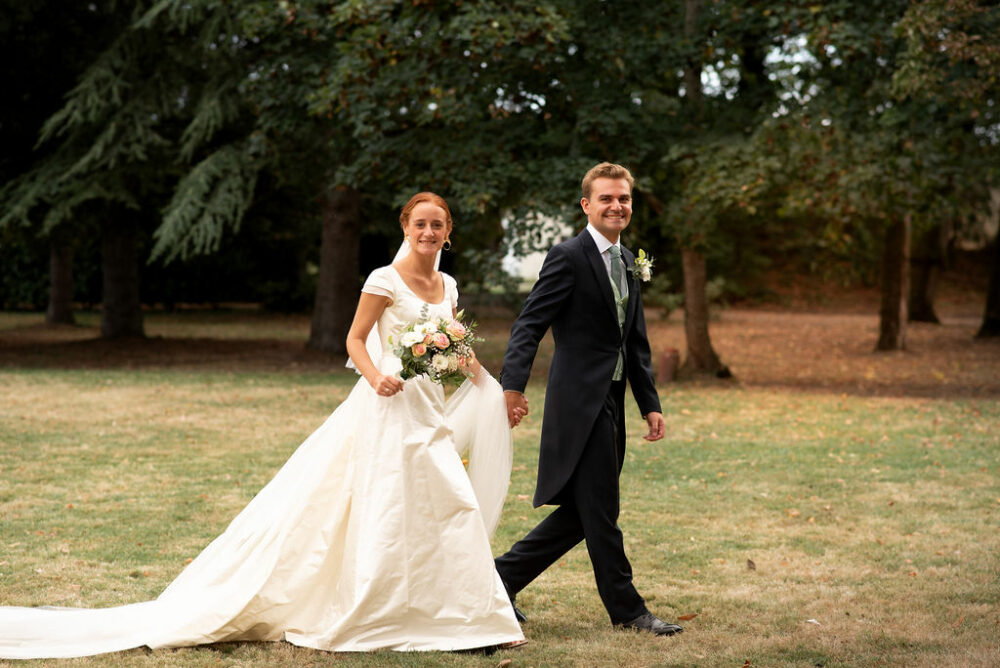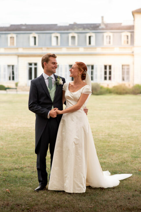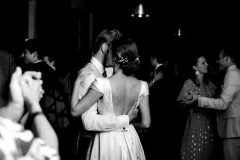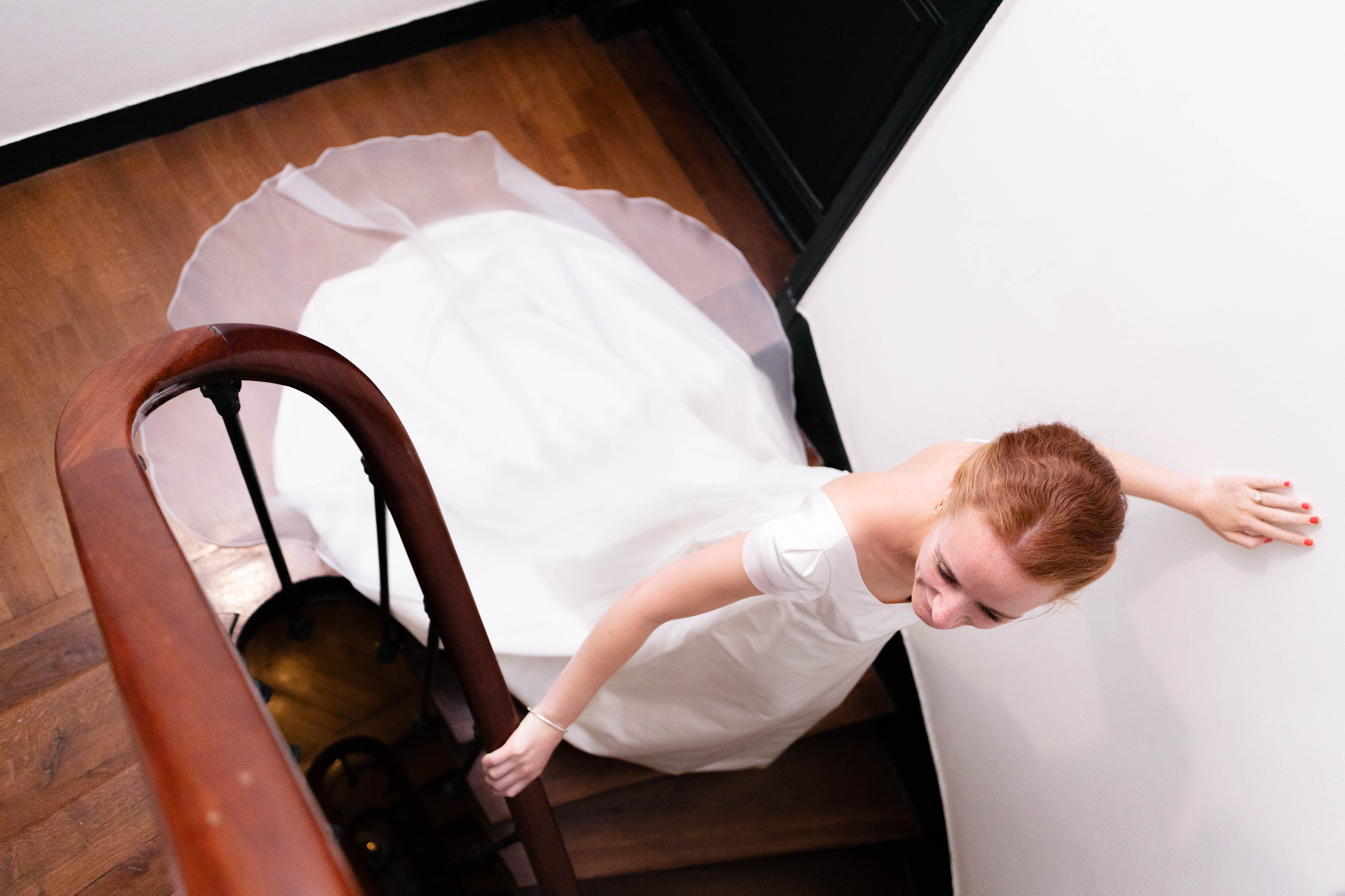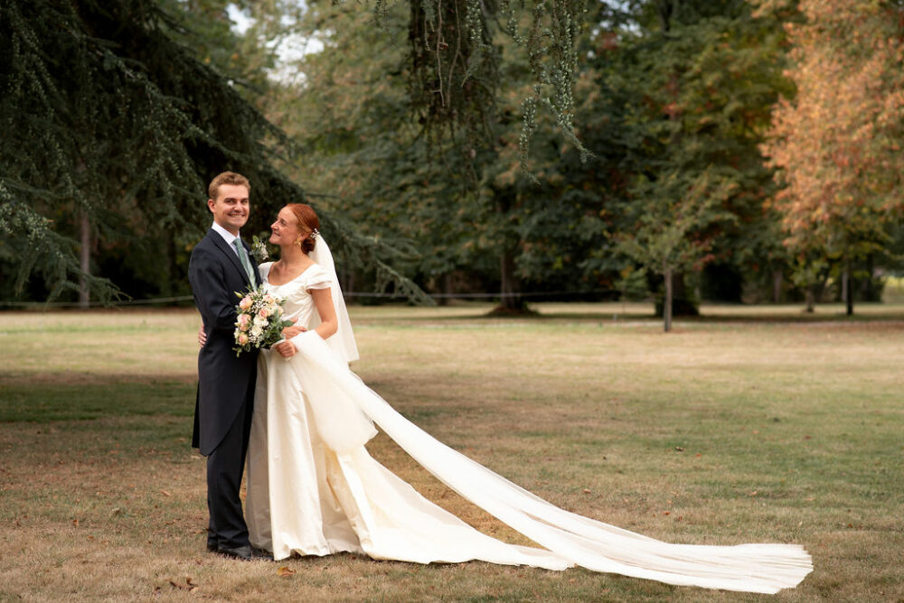 Petites manches en satin et en organza de soie. Dans le dos, une traine amovible en organza de soie.