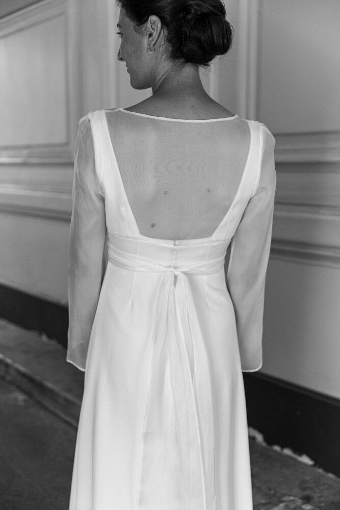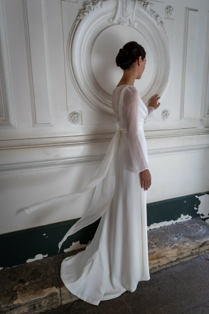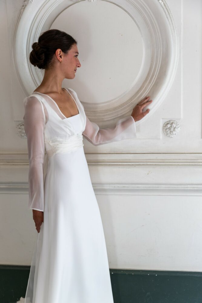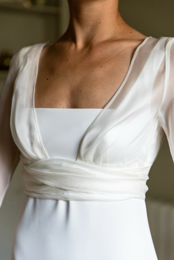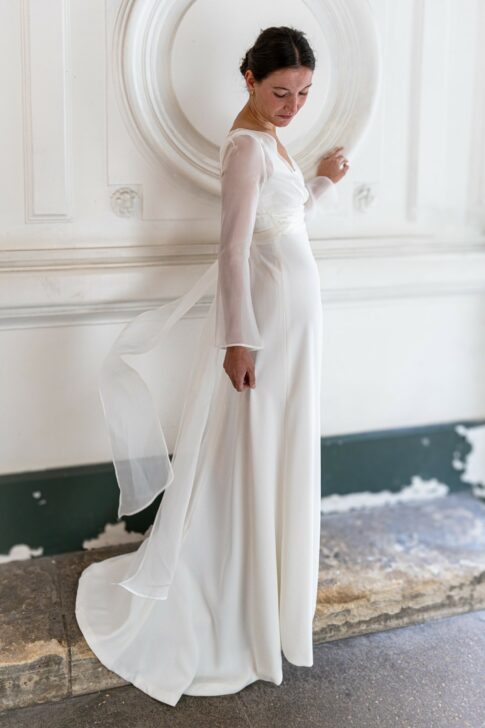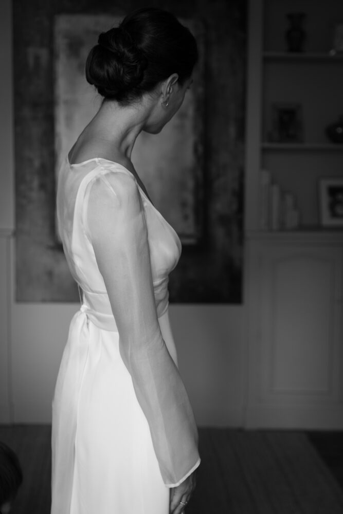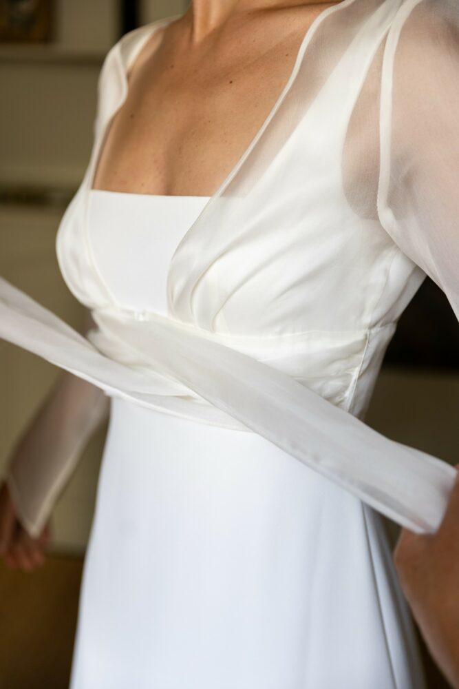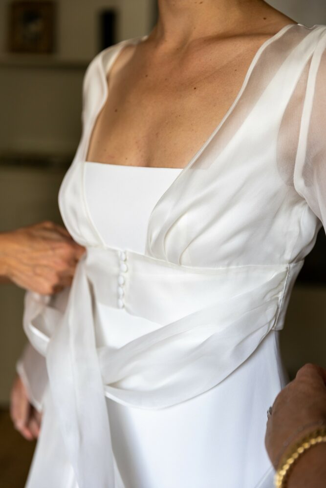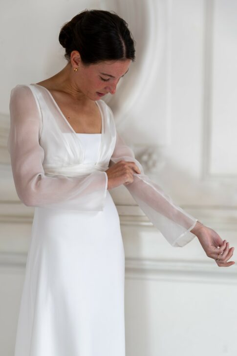 Par dessus, un top en organza de soie avec des manches trompettes et une ceinture nouée à la taille.