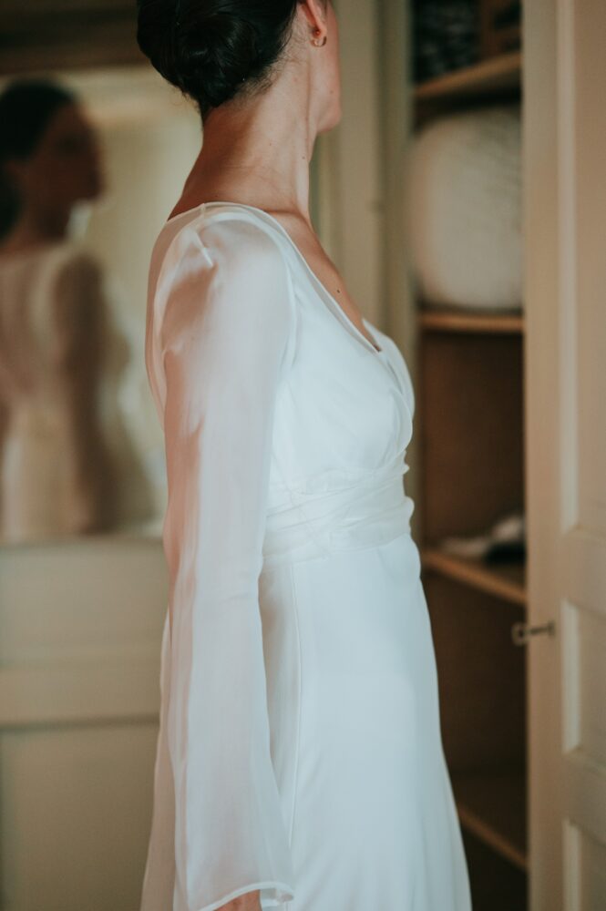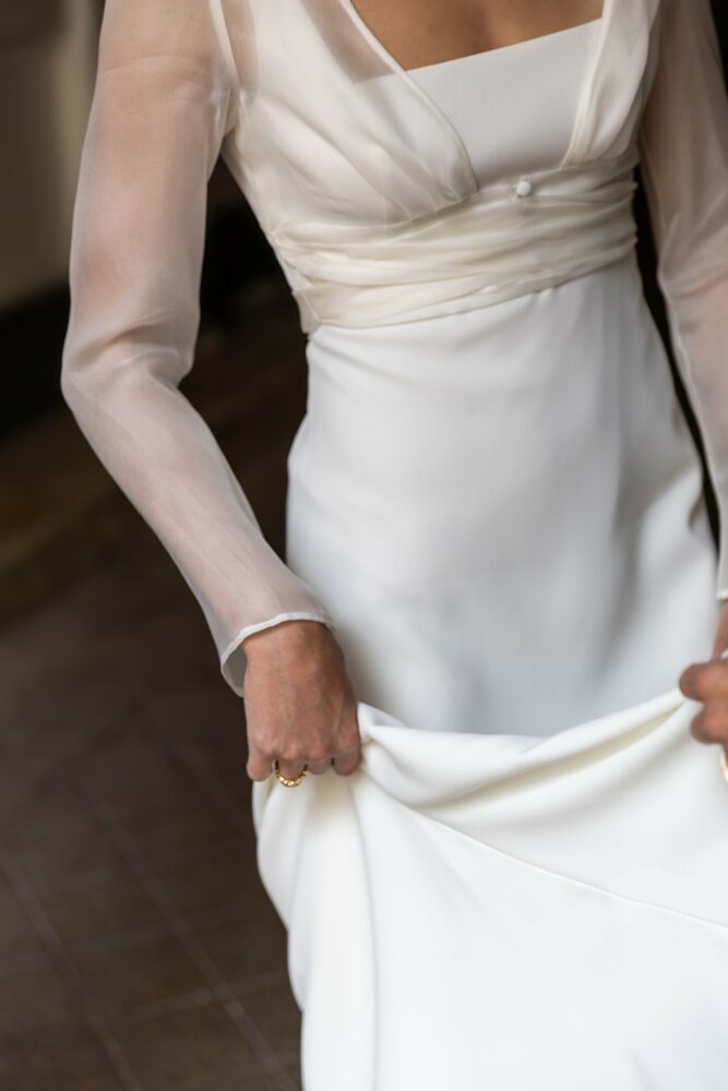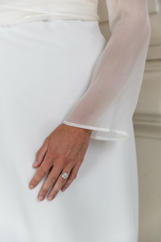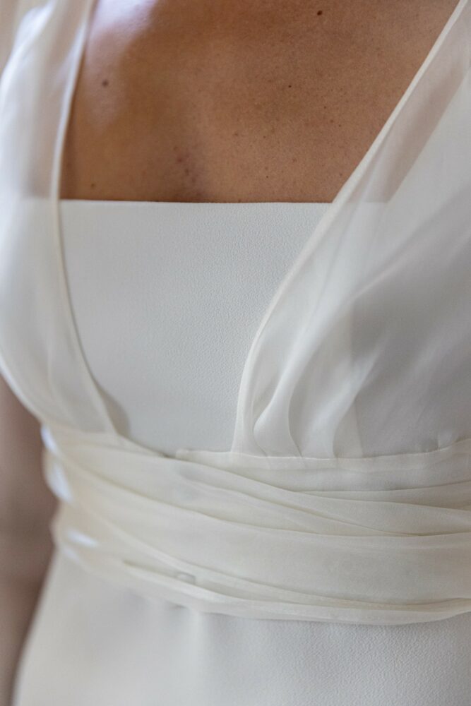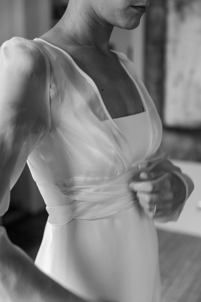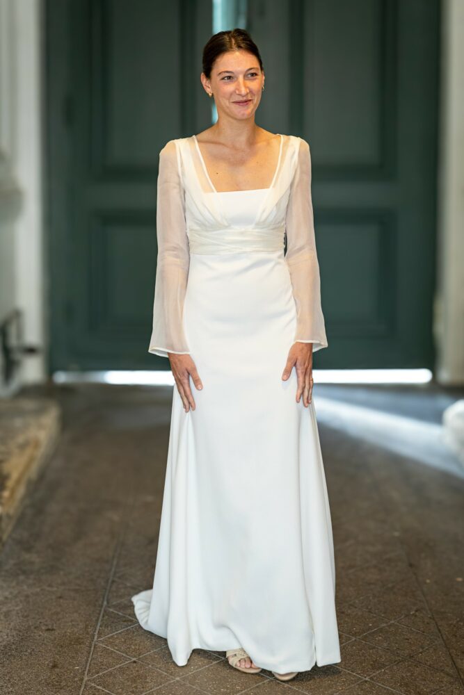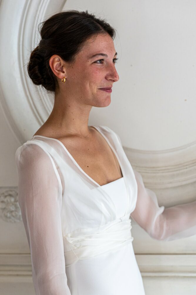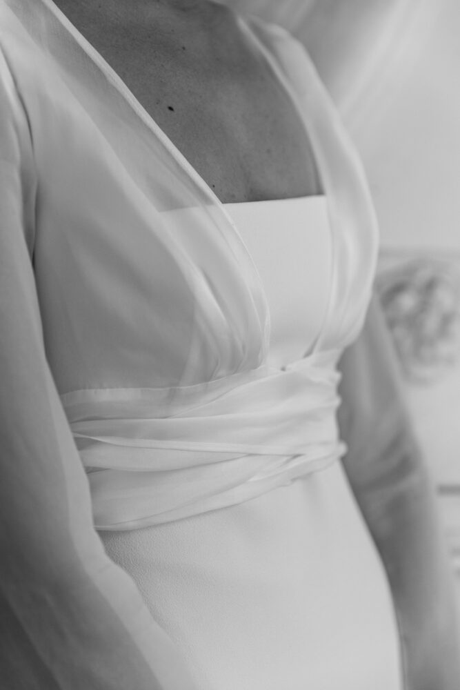 Par dessus, un top en organza de soie avec des manches trompettes et une ceinture nouée à la taille.