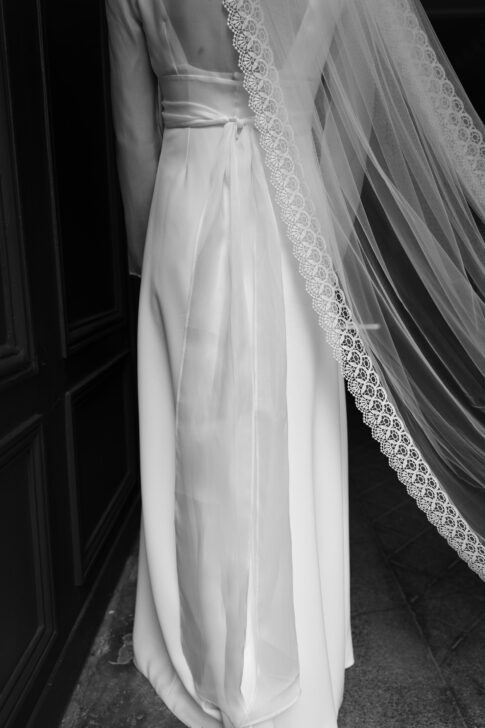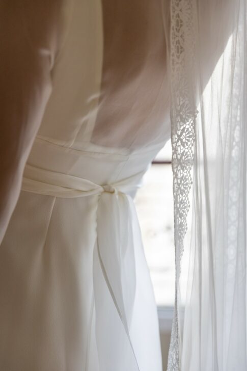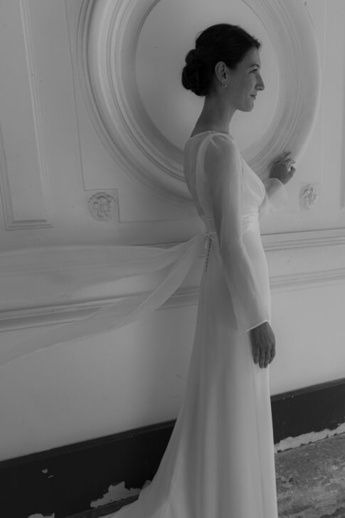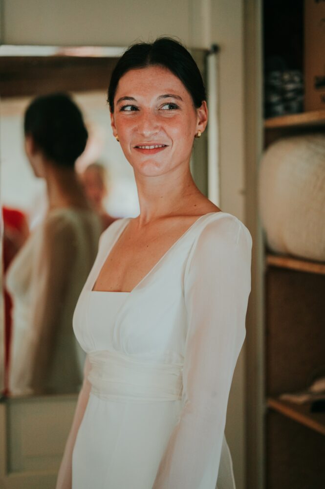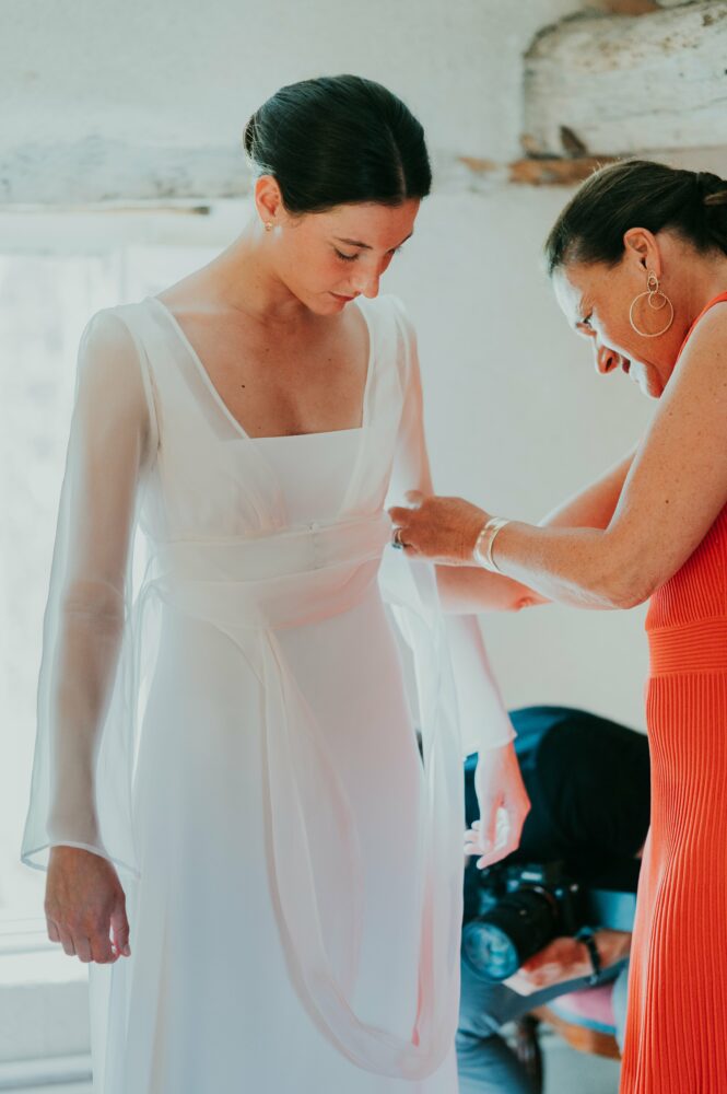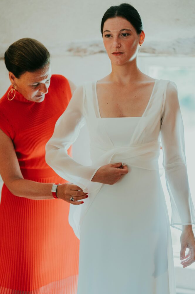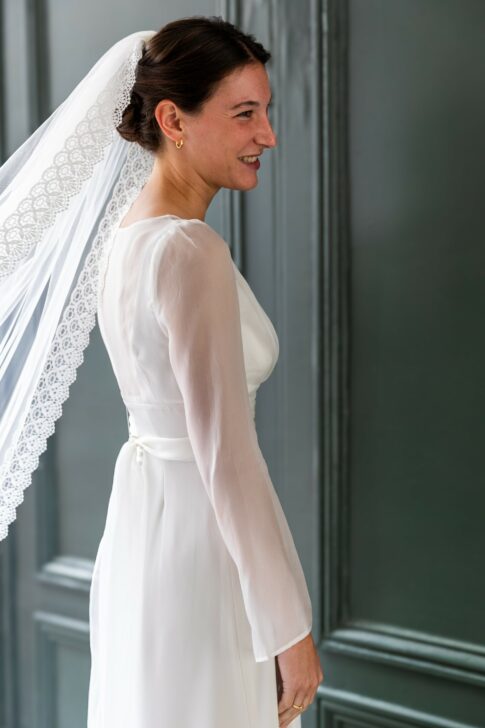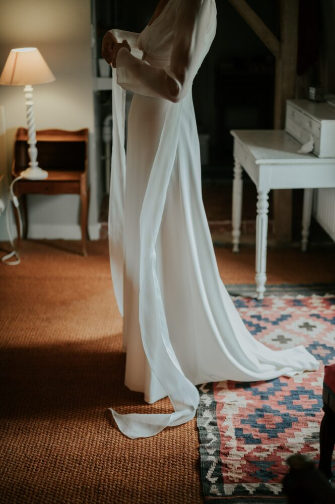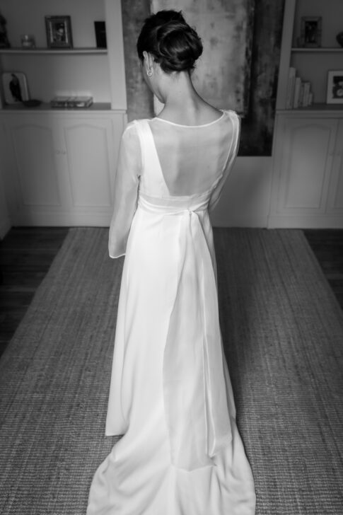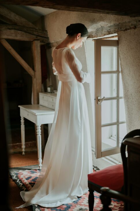 Par dessus, un top en organza de soie avec des manches trompettes et une ceinture nouée à la taille.