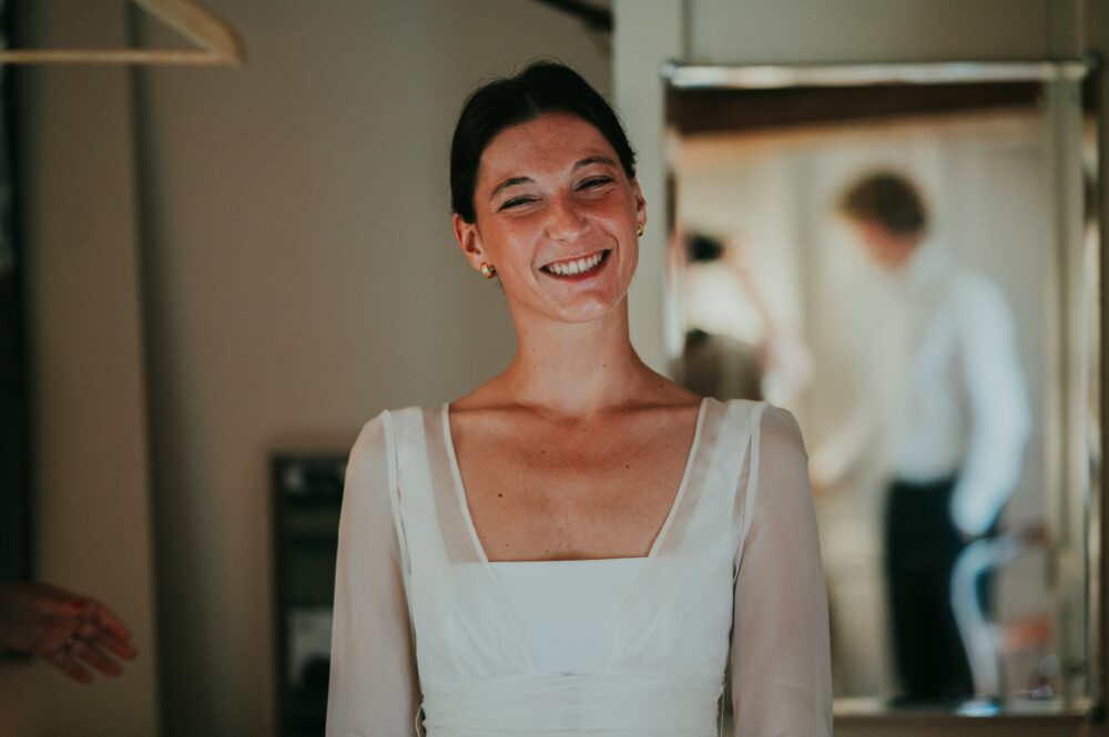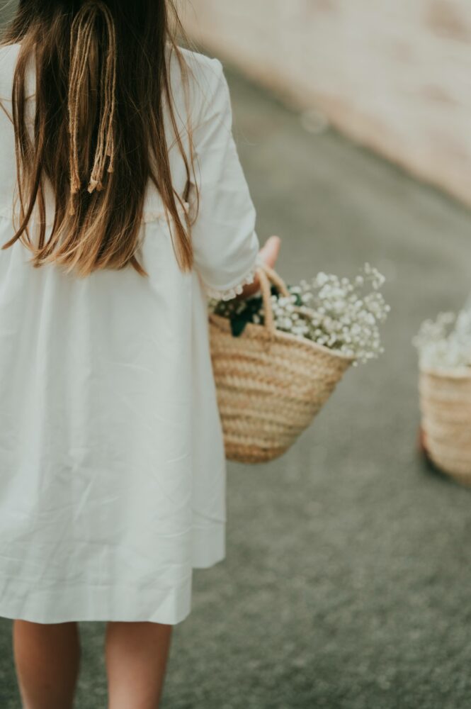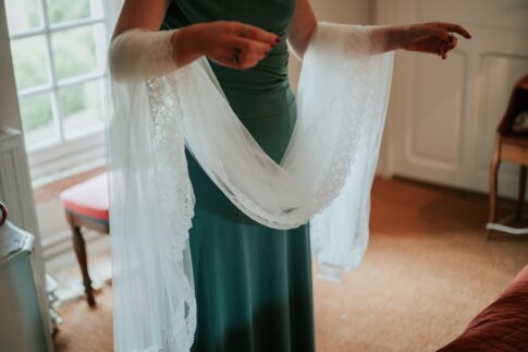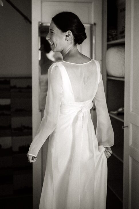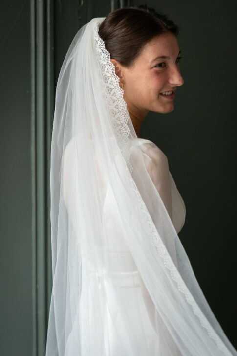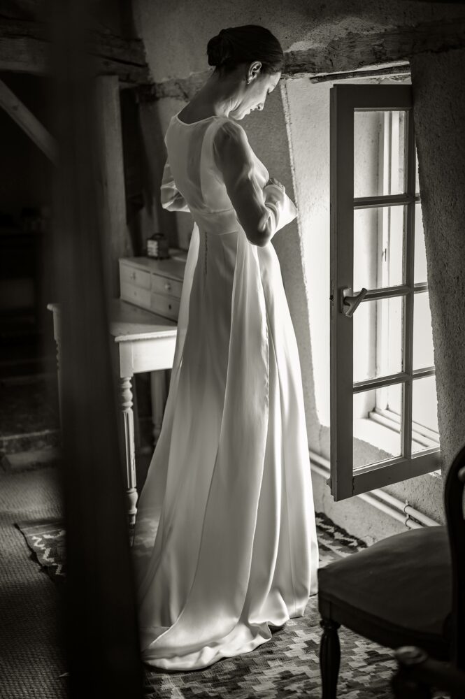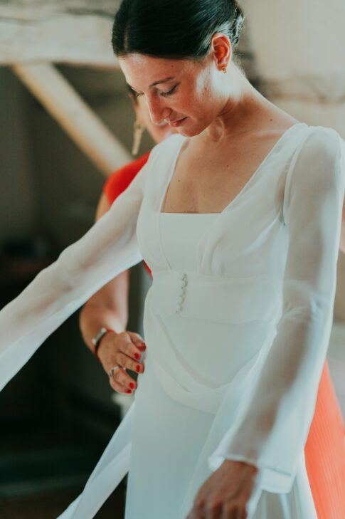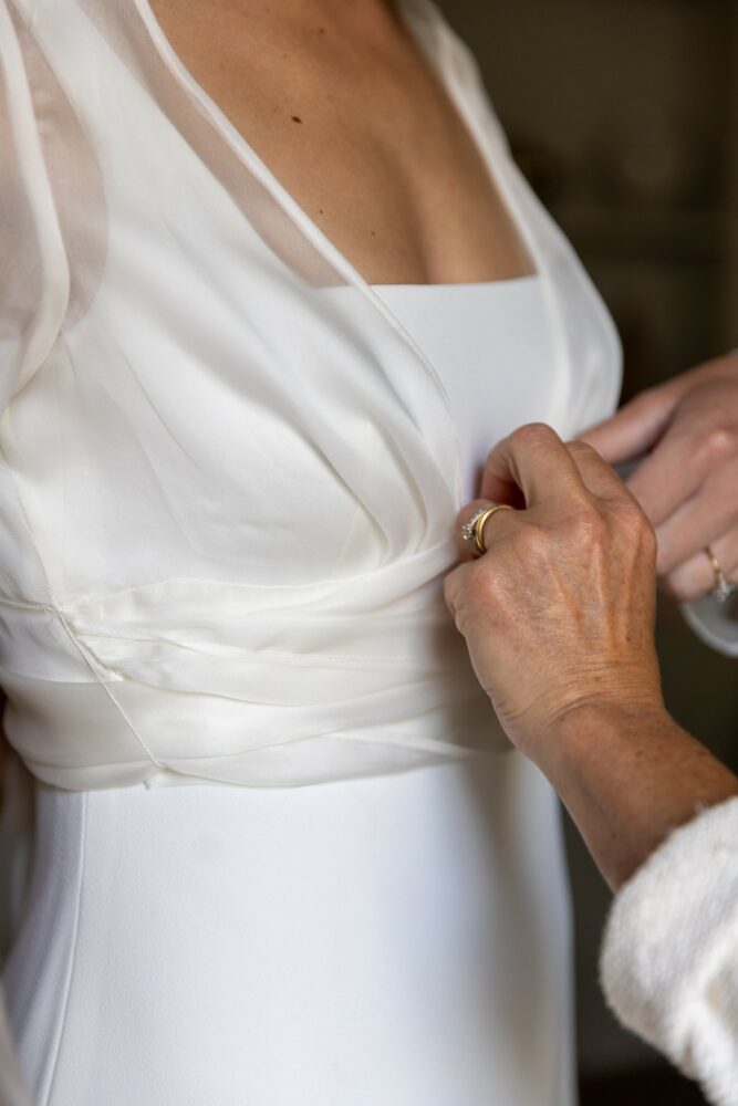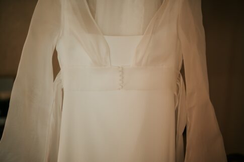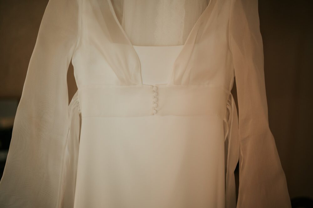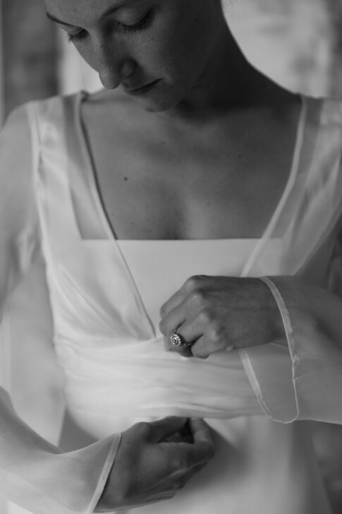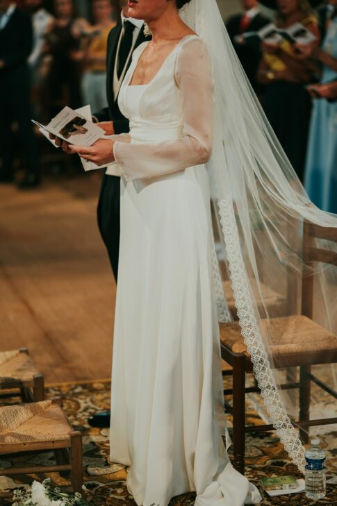 Par dessus, un top en organza de soie avec des manches trompettes et une ceinture nouée à la taille.