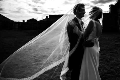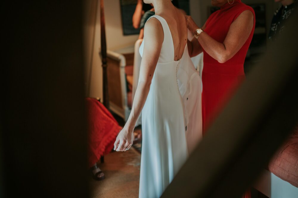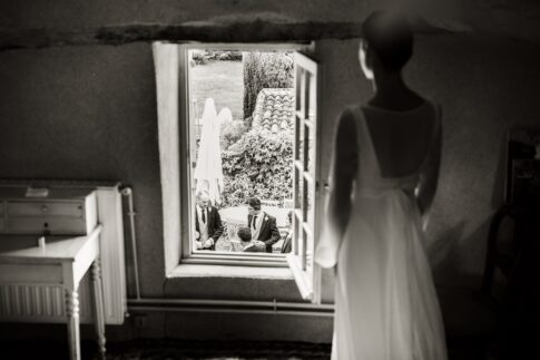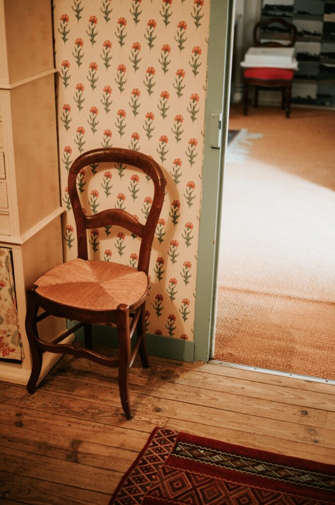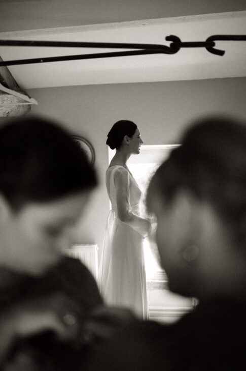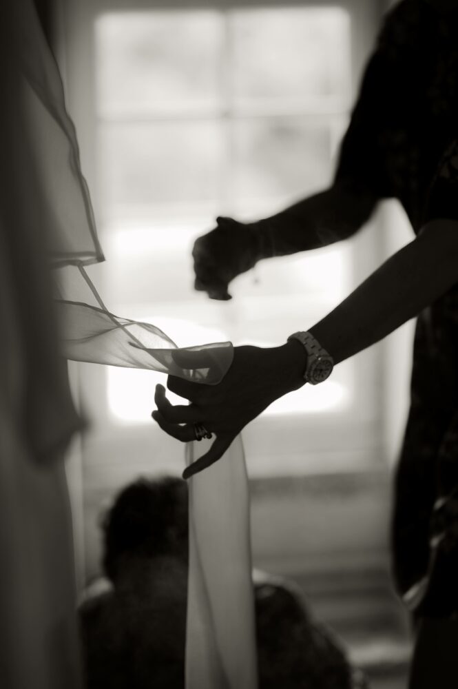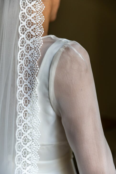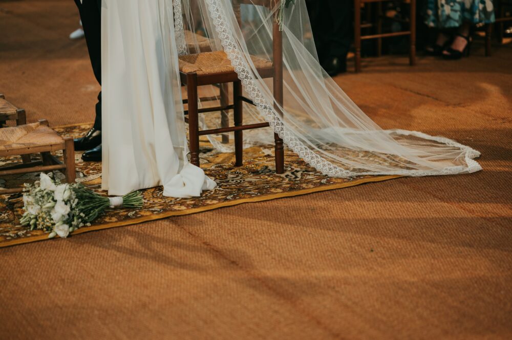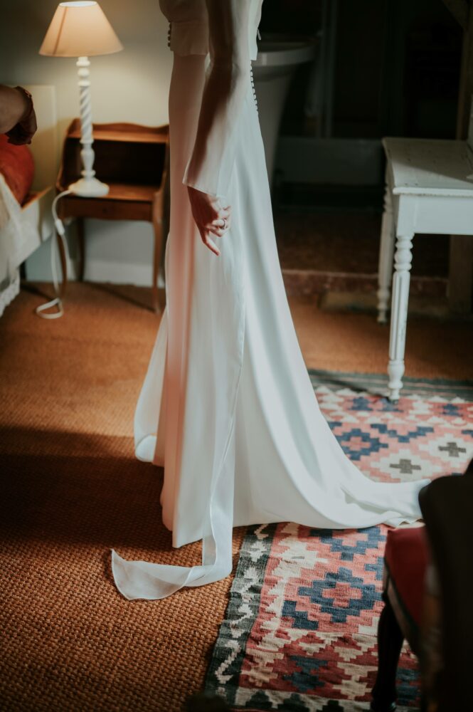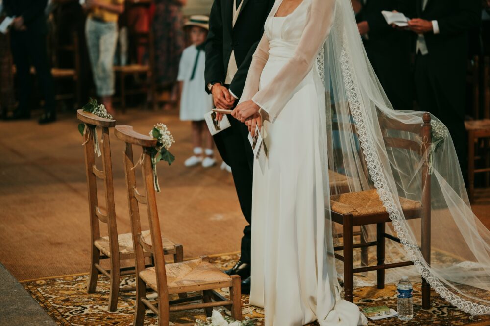 Par dessus, un top en organza de soie avec des manches trompettes et une ceinture nouée à la taille.