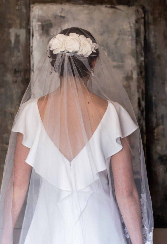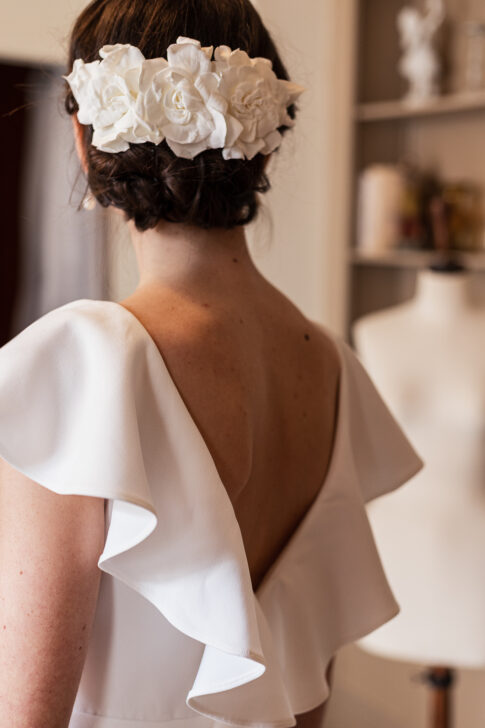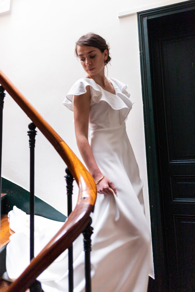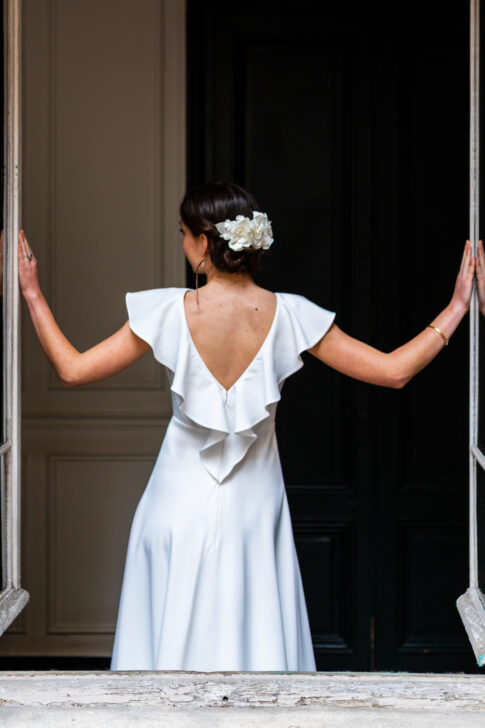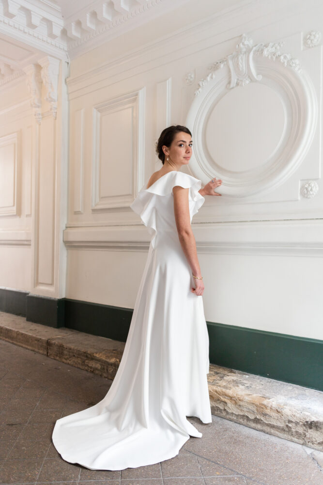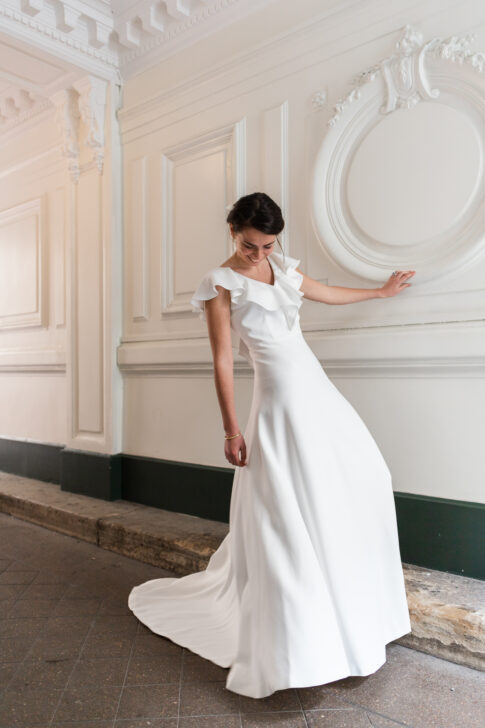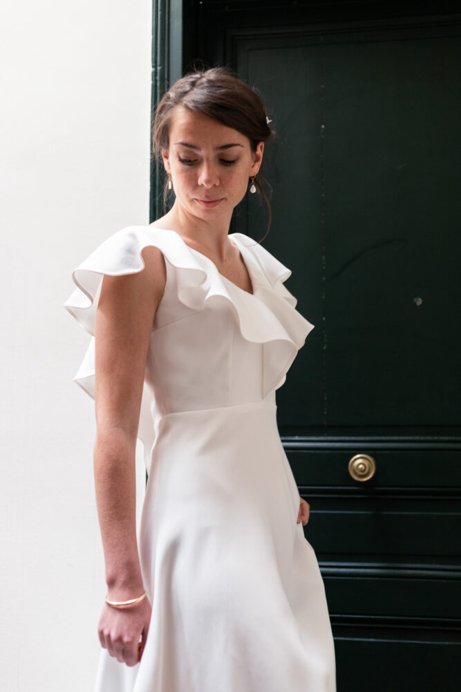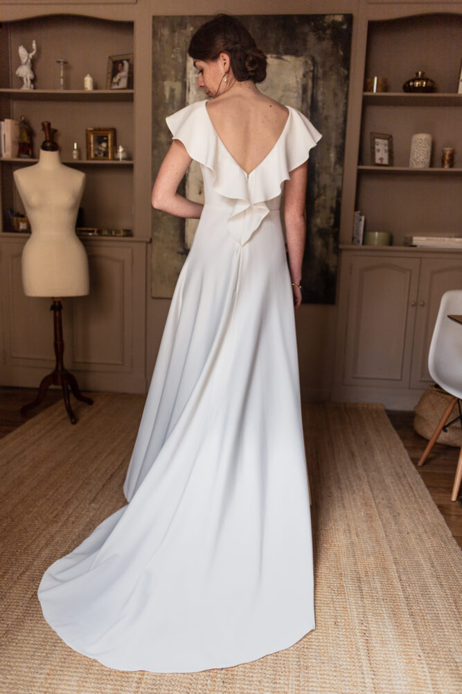 Robe en crêpe lourd, jupe trapèze et petite traine.