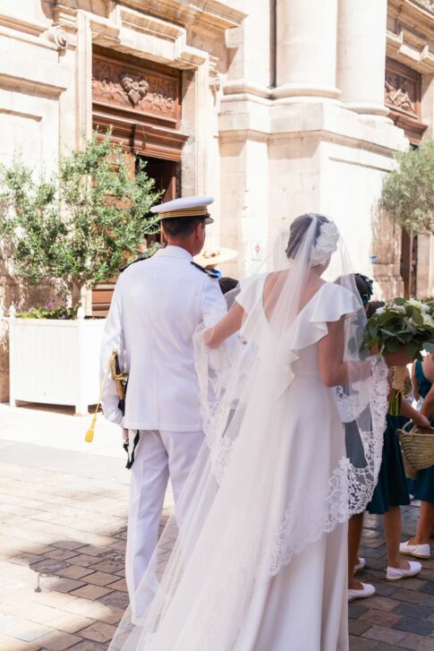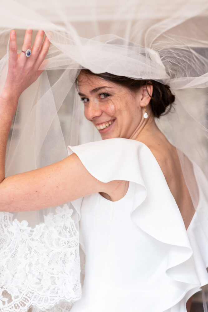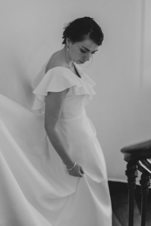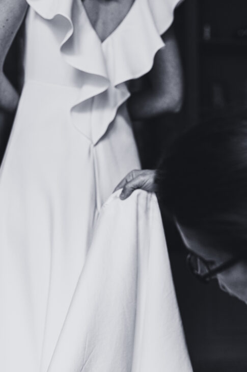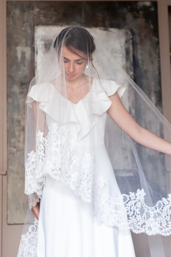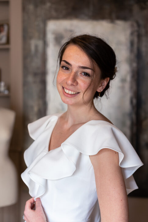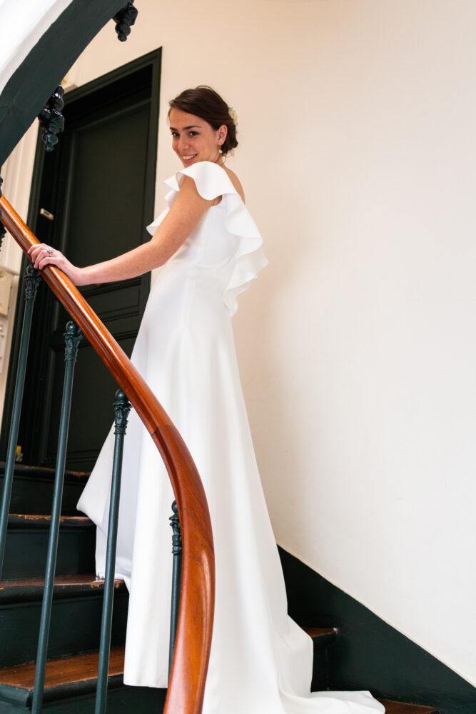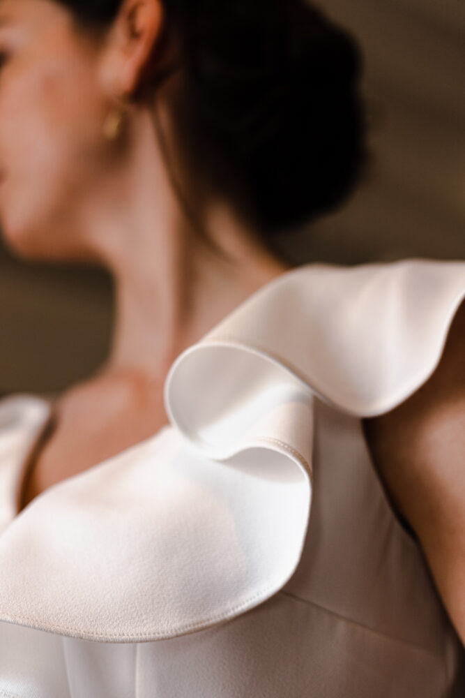 Robe en crêpe lourd, jupe trapèze et petite traine.