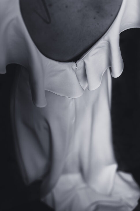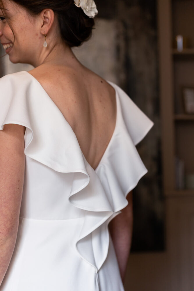 Encolure en pointe, devant et dos, bordée d’un grand col à volant.