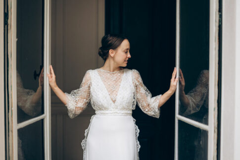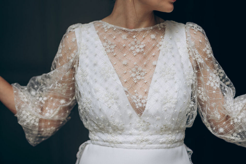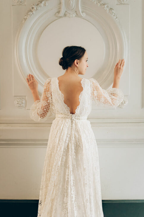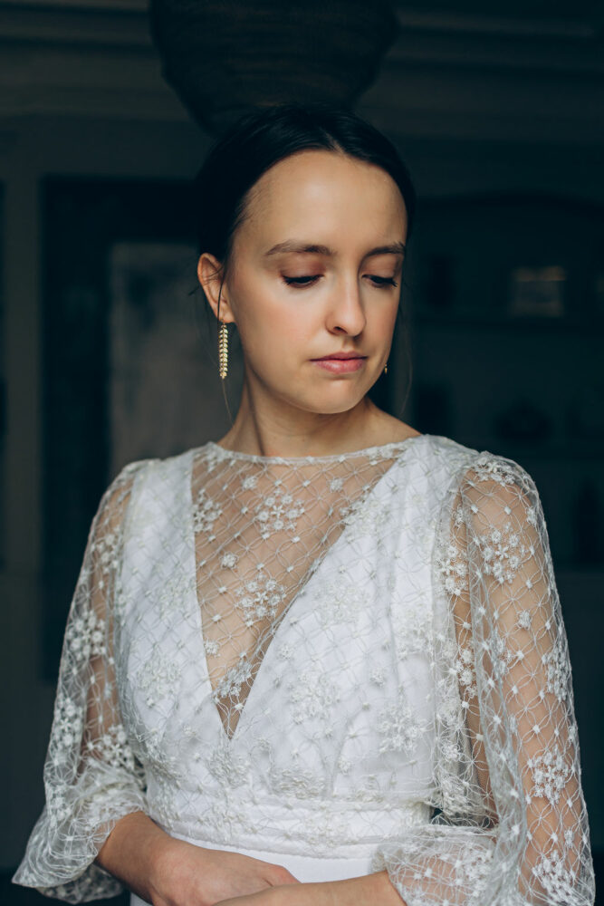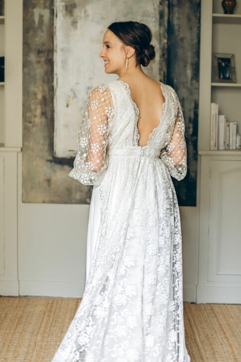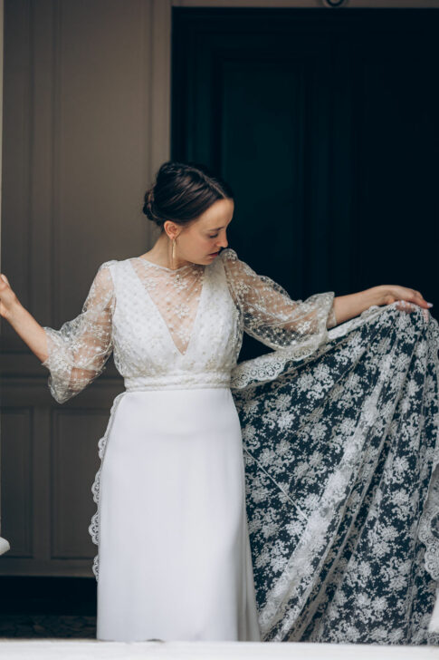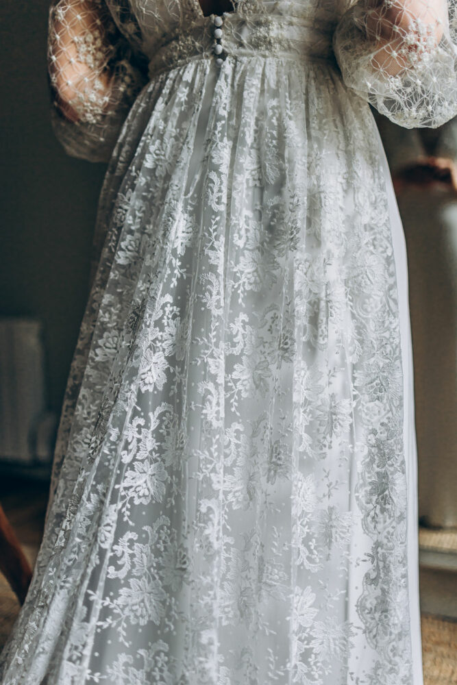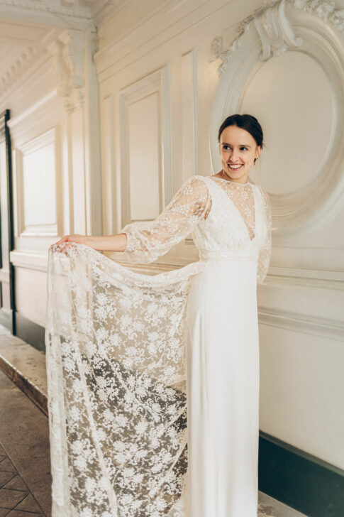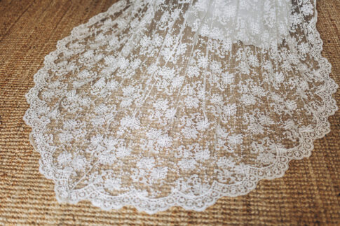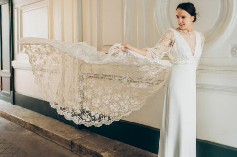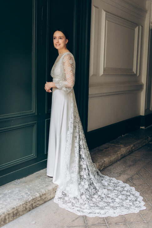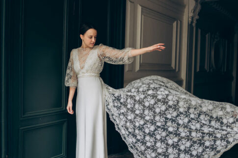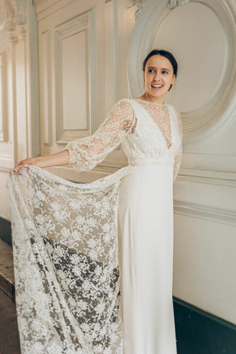 Robe en crêpe de soie avec une sur-robe en dentelle de Calais et tulle brodé.