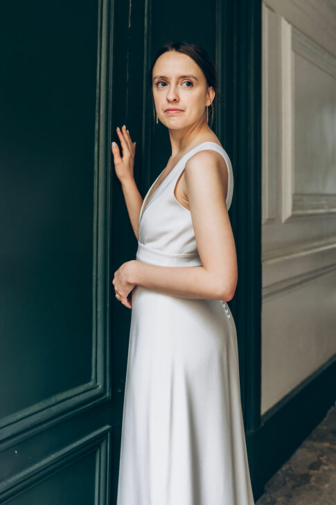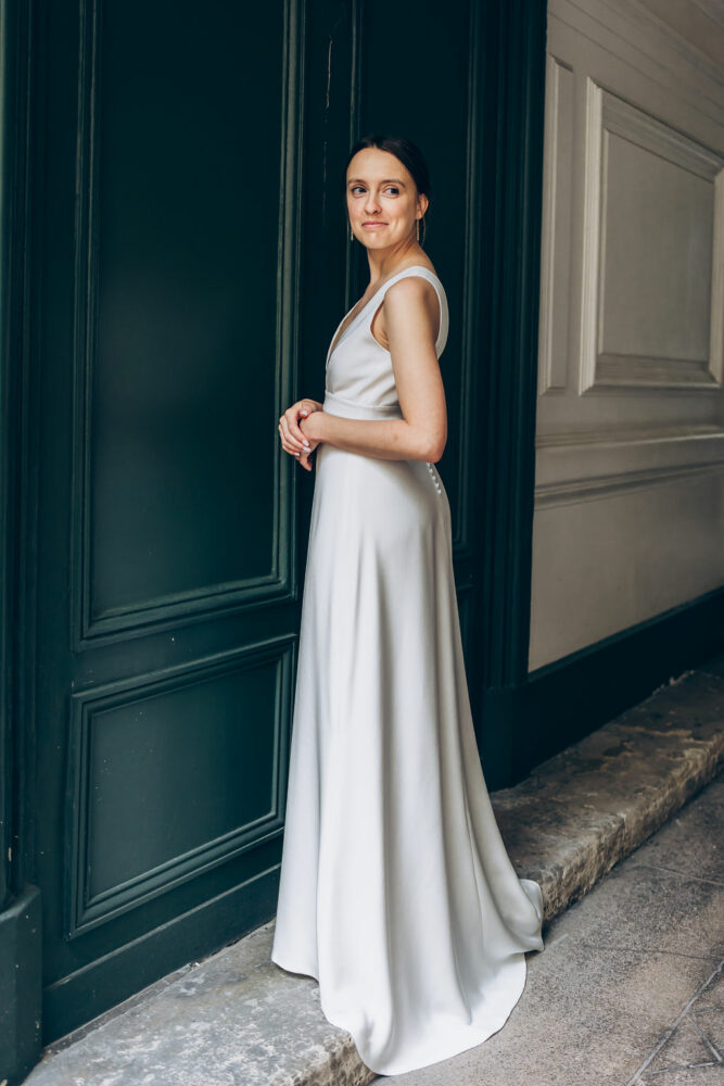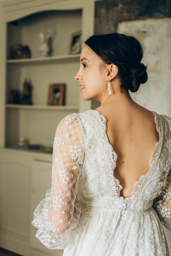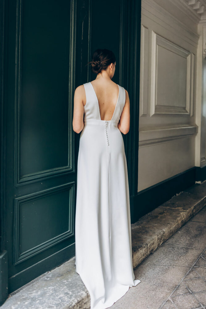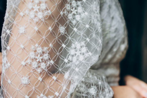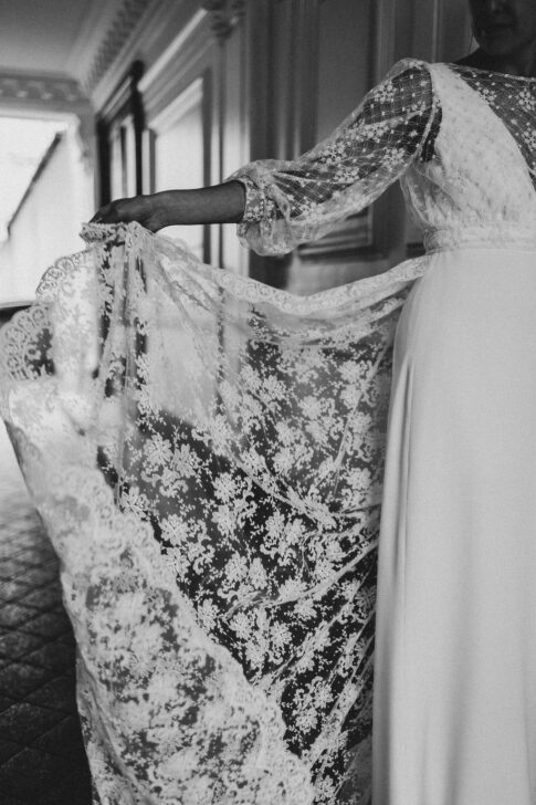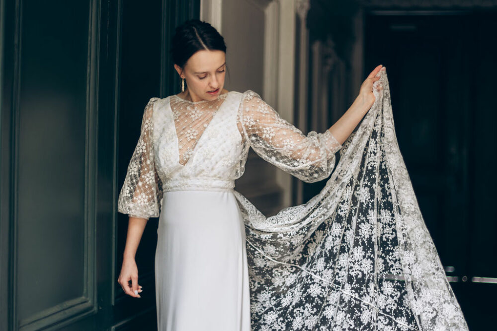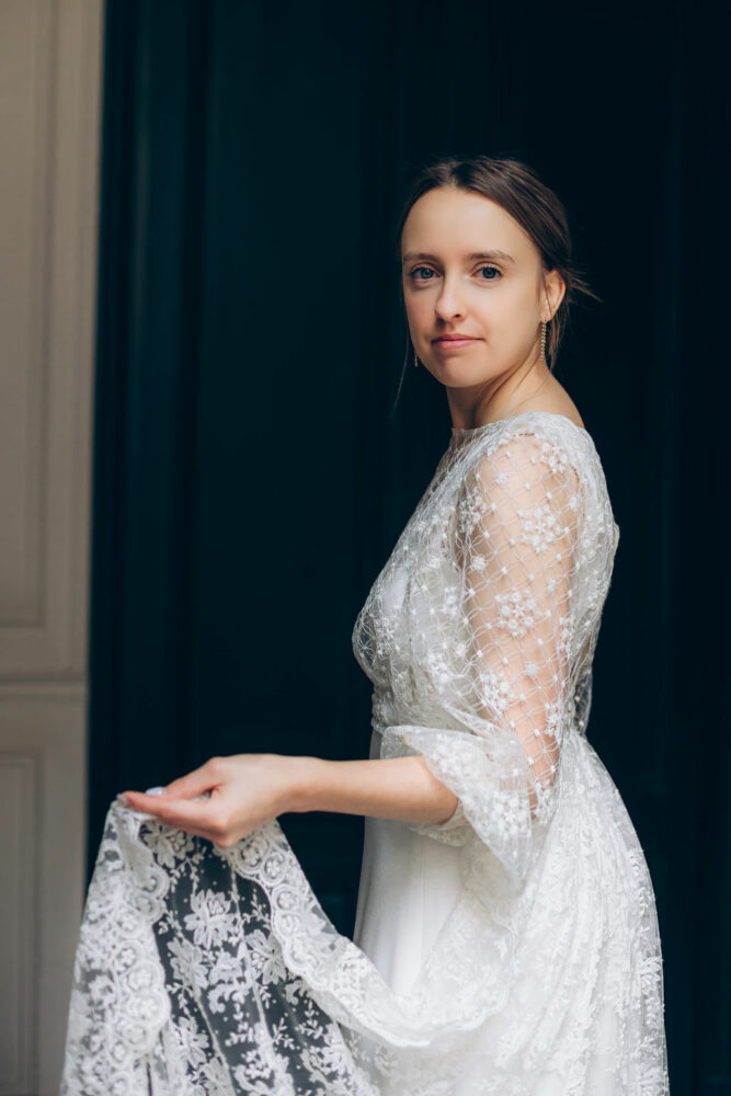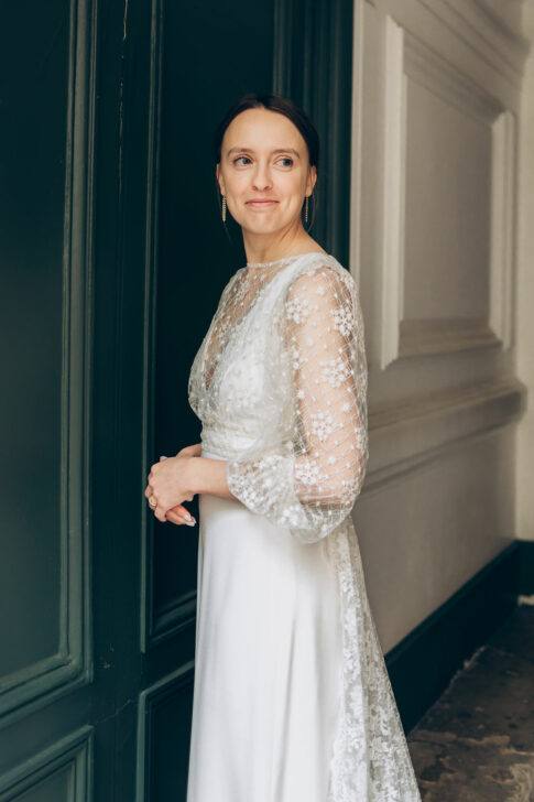 Robe en crêpe de soie avec une sur-robe en dentelle de Calais et tulle brodé.