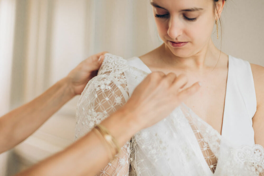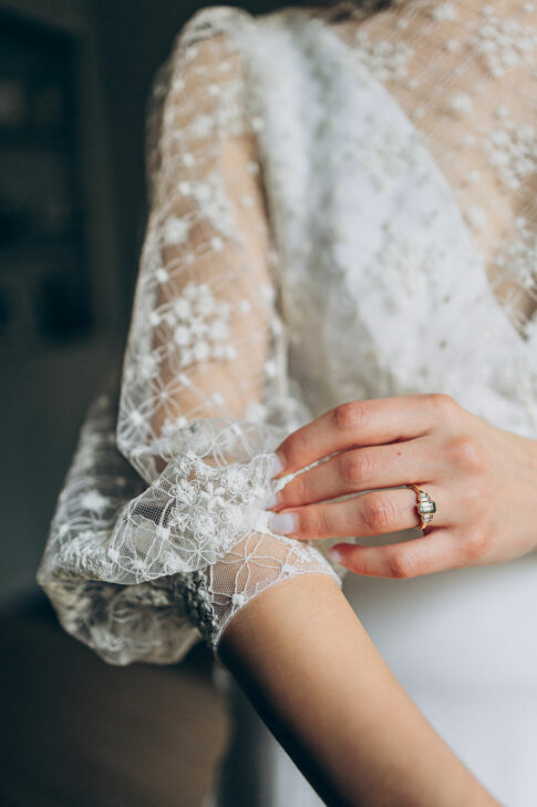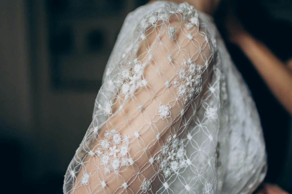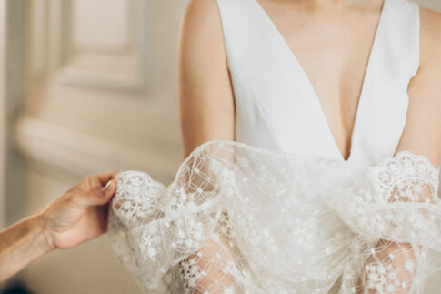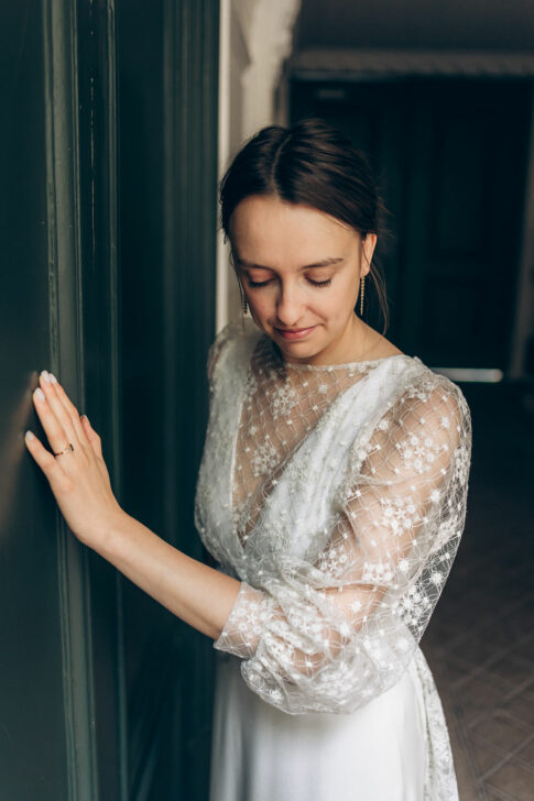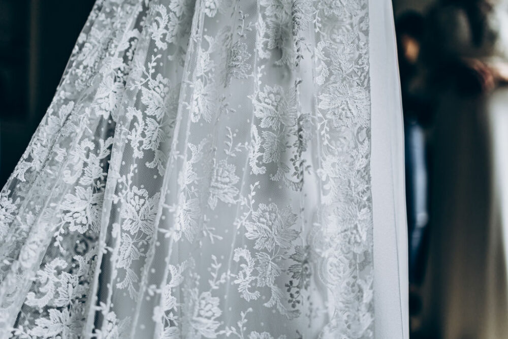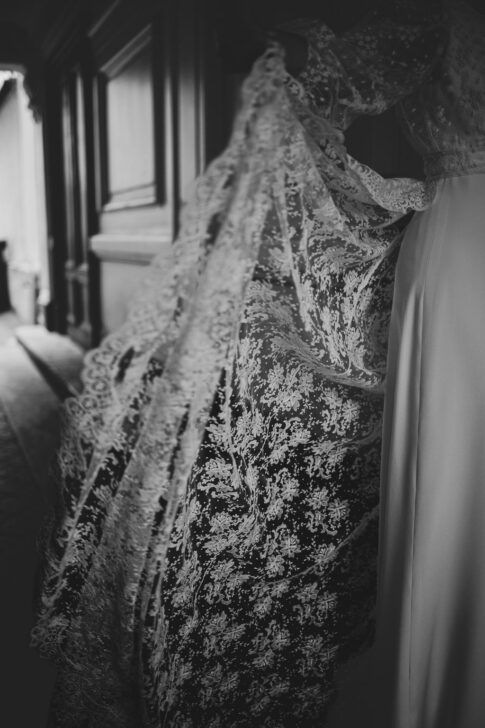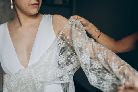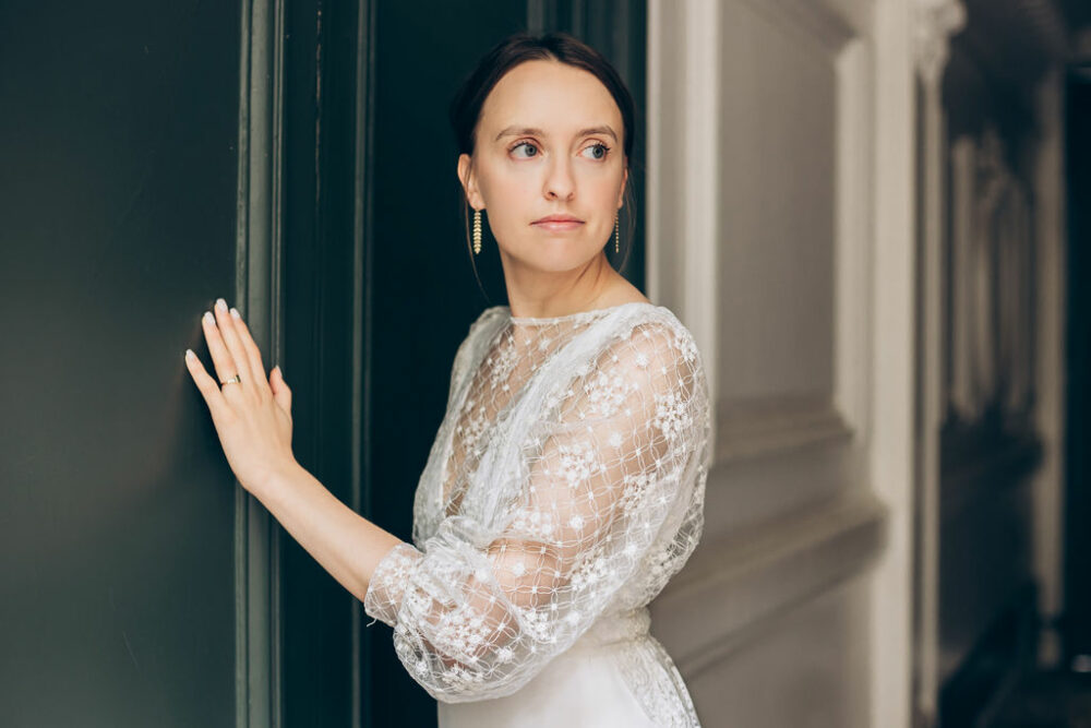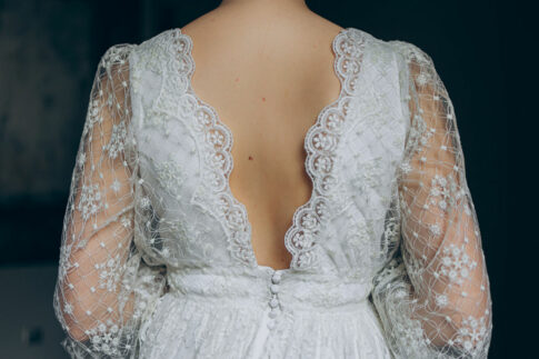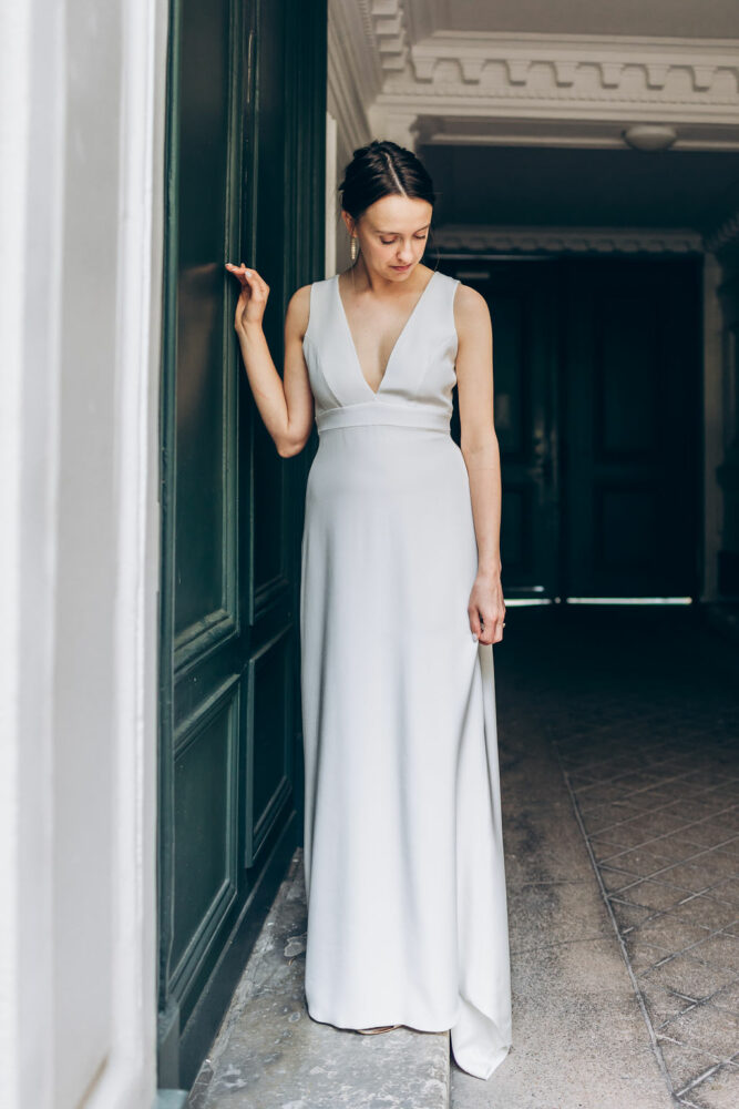 Robe en crêpe de soie avec une sur-robe en dentelle de Calais et tulle brodé.