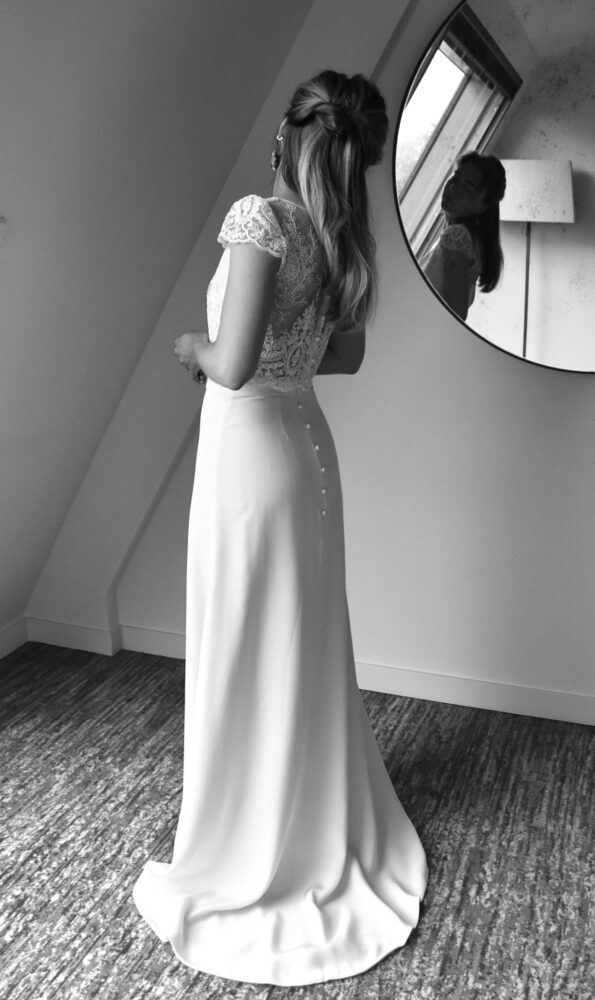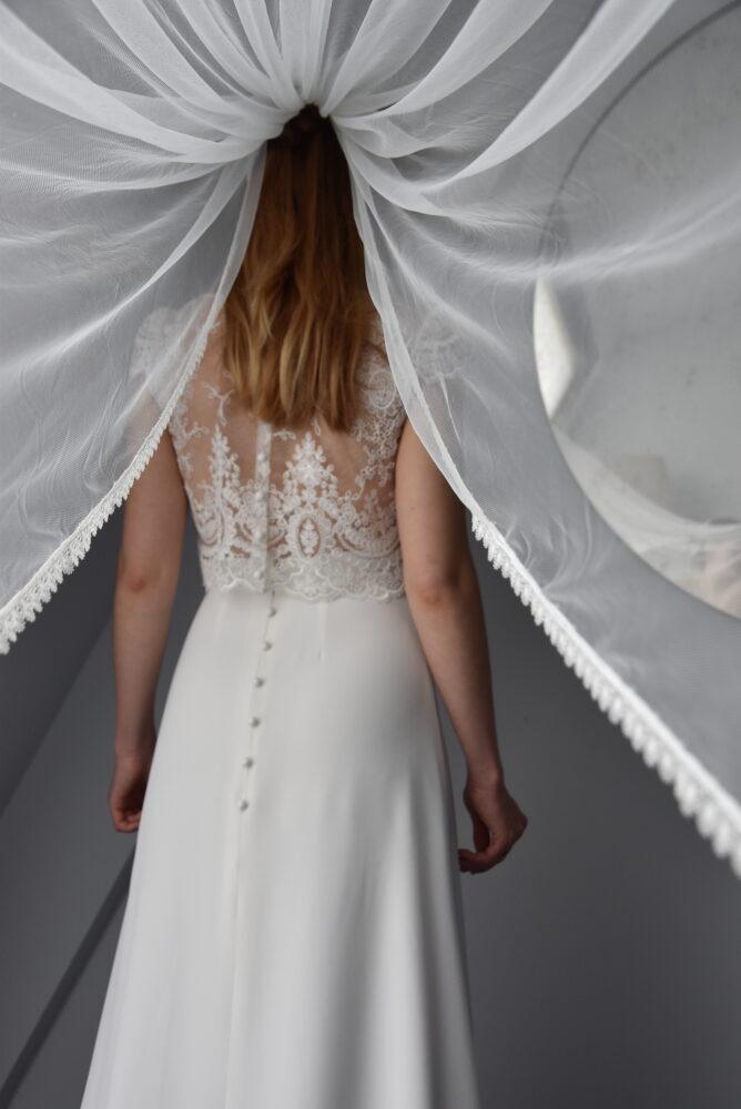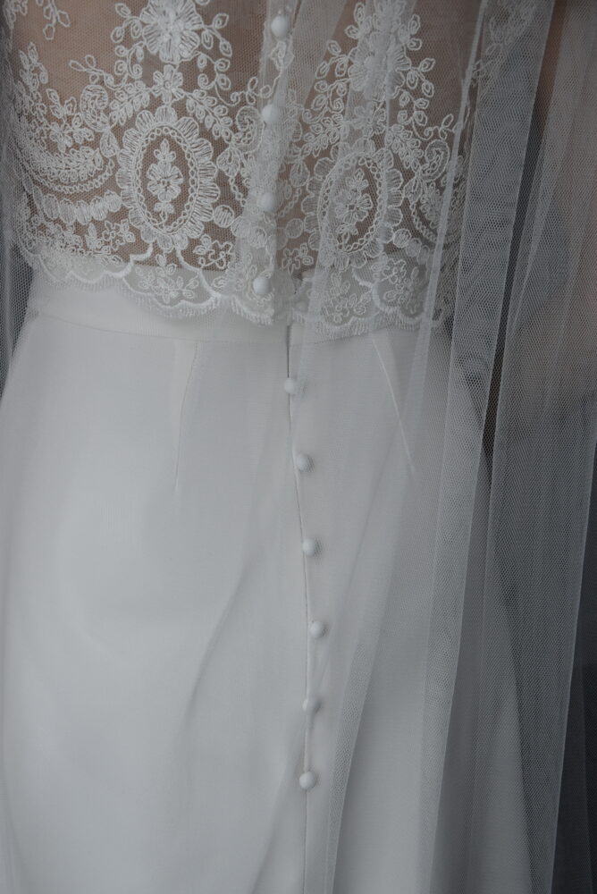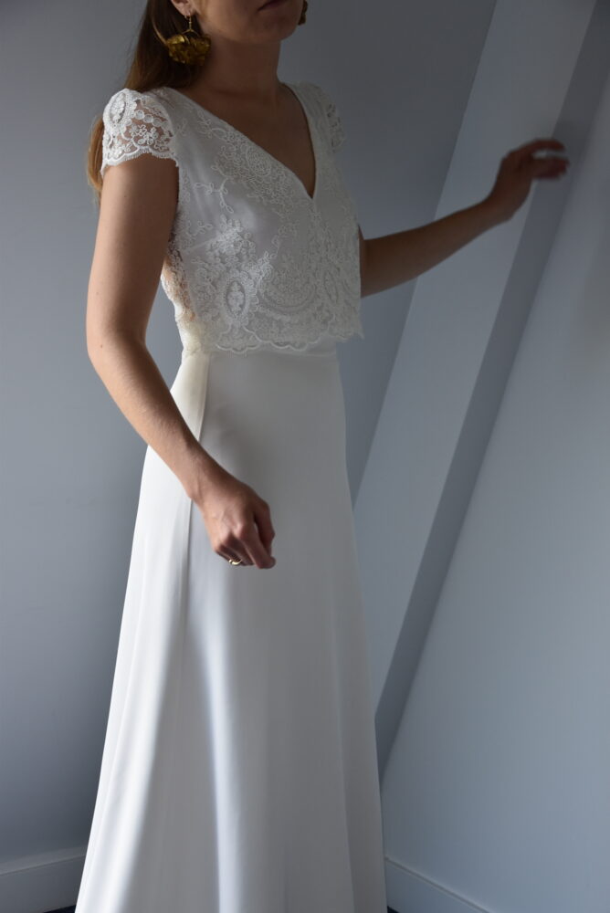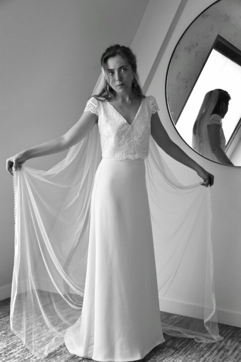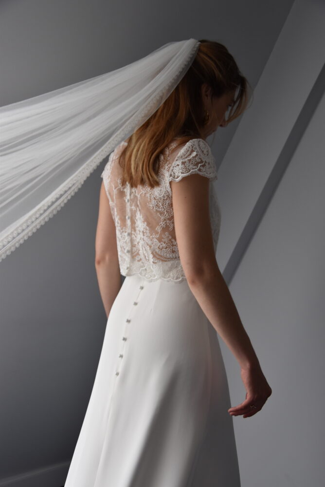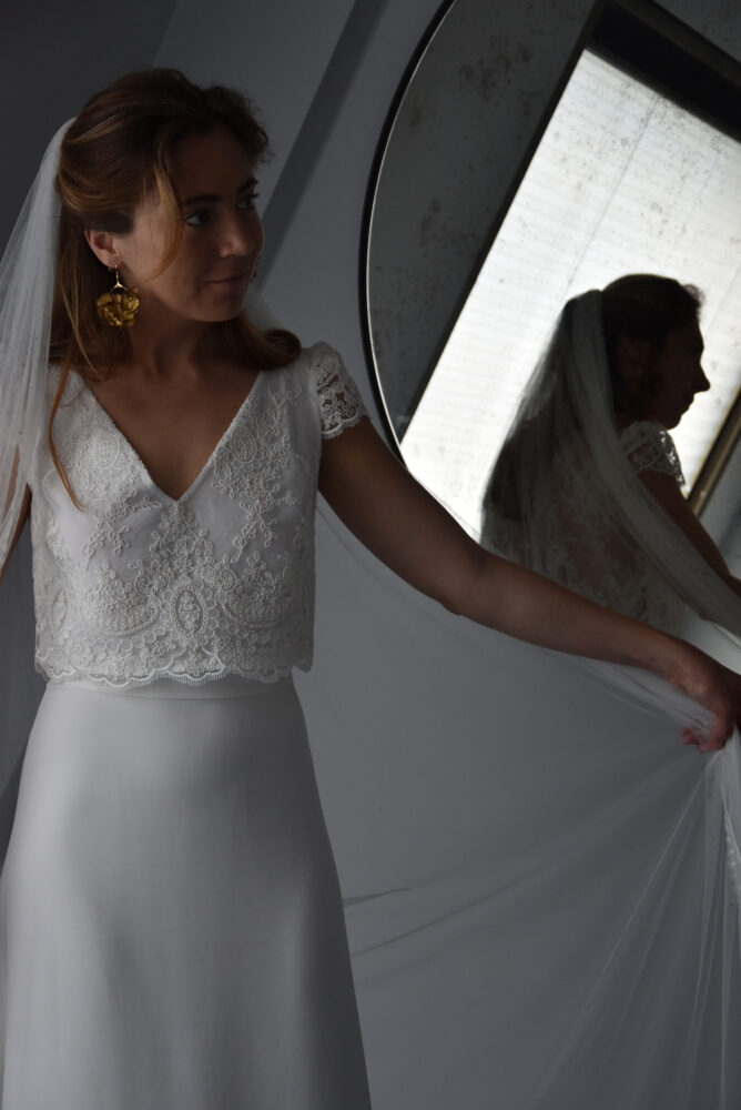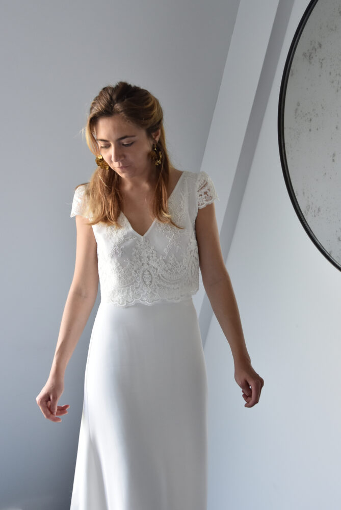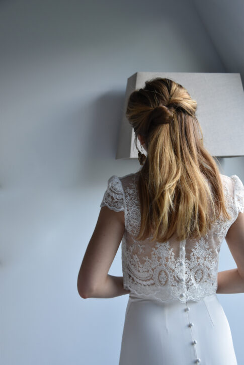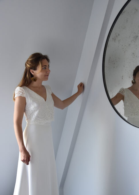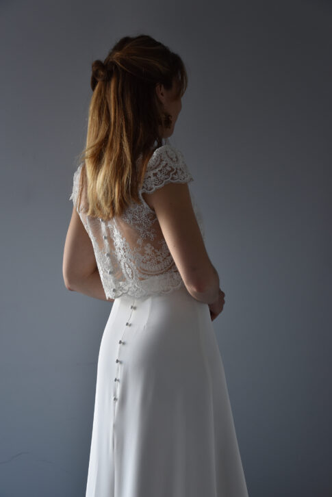 Haut séparé en tulle brodé, manches courtes et boutonné dans le dos.