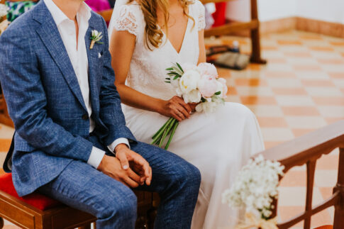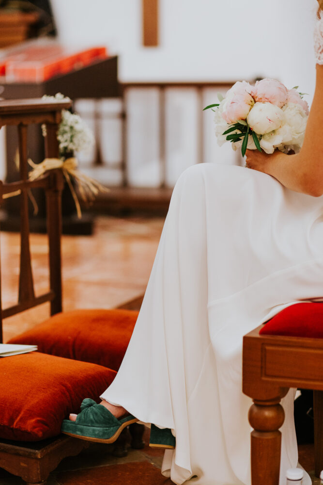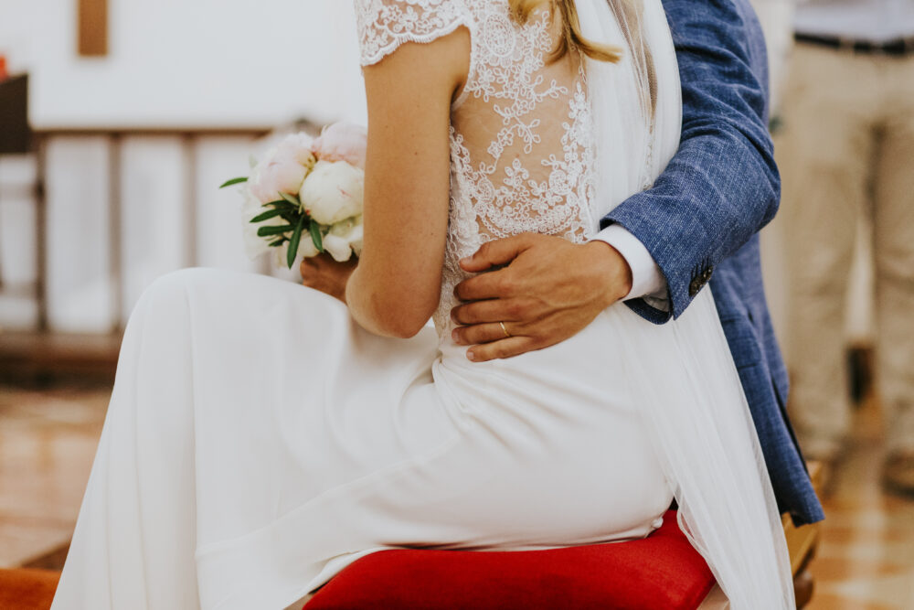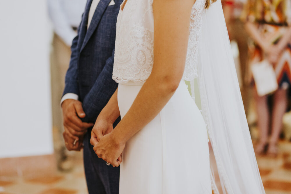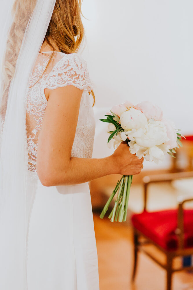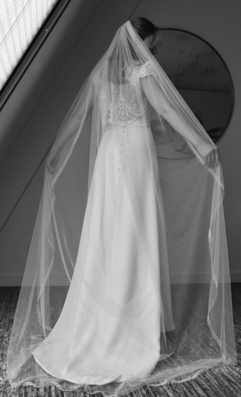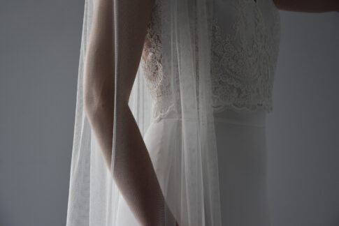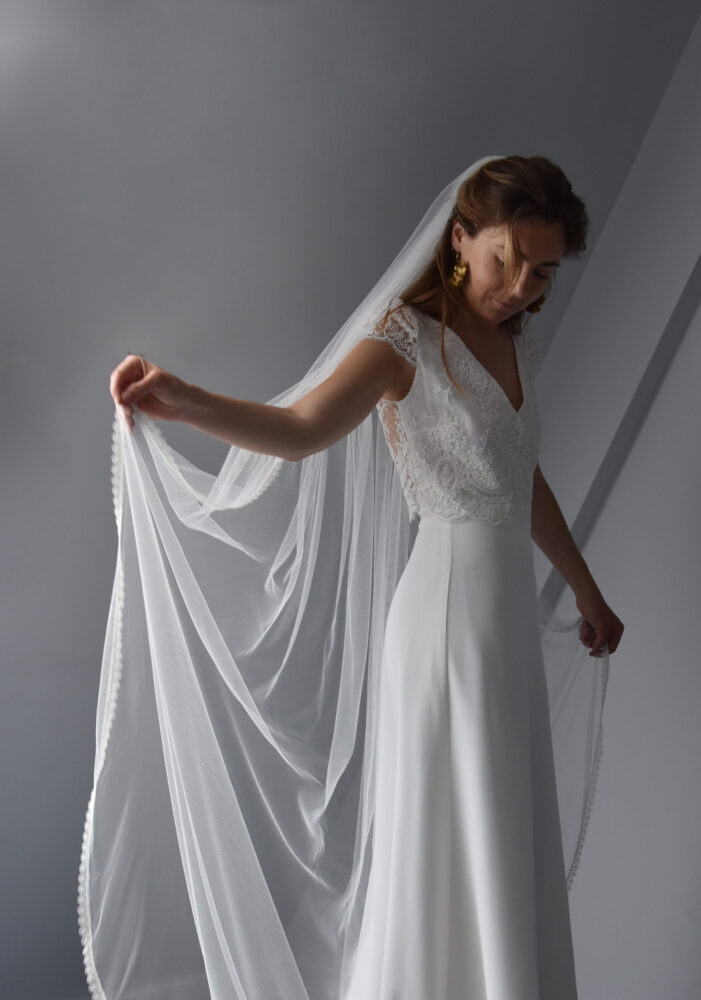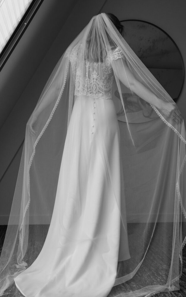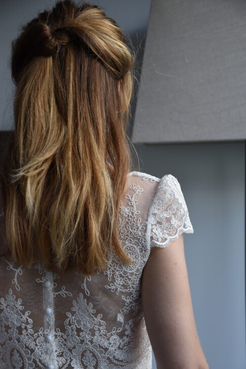 Haut séparé en tulle brodé, manches courtes et boutonné dans le dos.