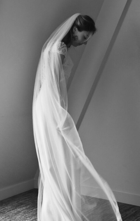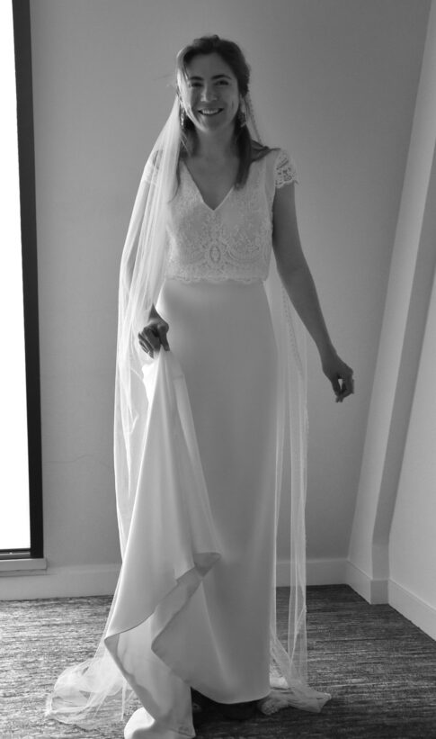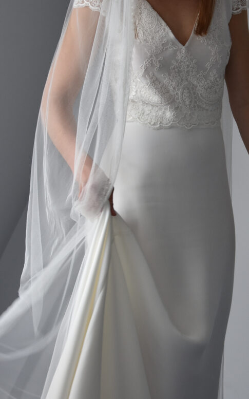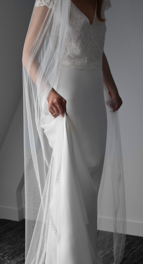 Jupe longue en crêpe de soie fluide, près du corps avec une petite traine.