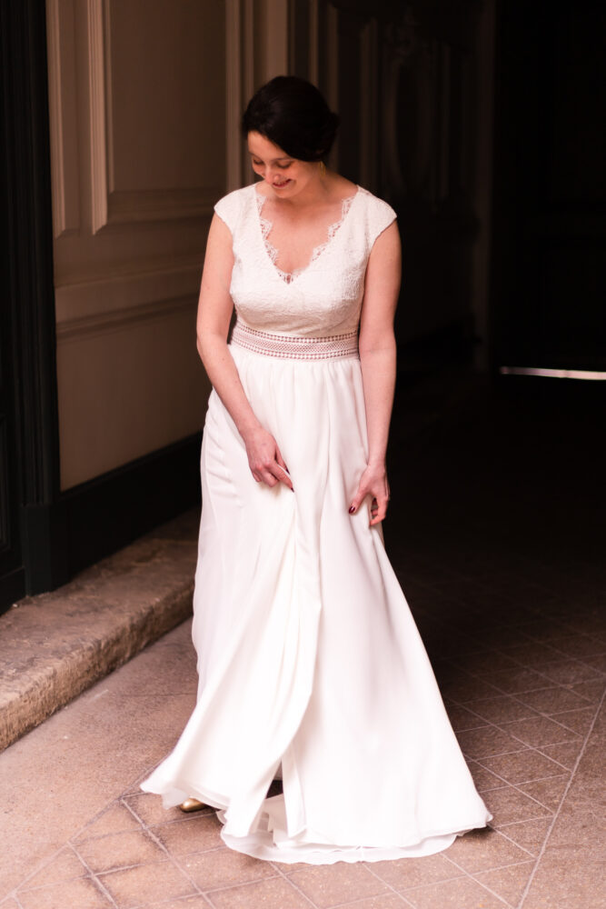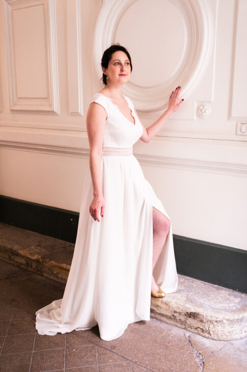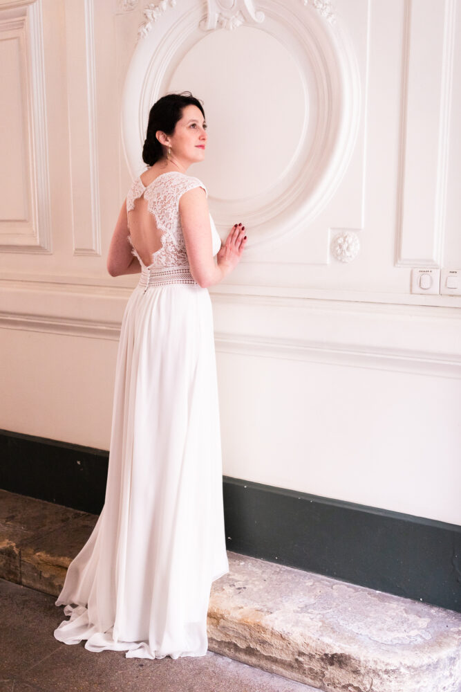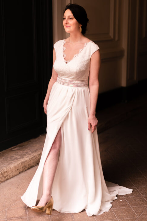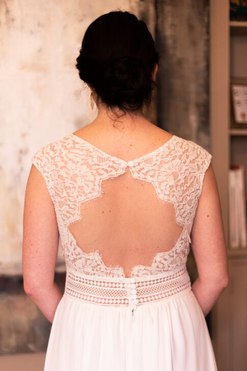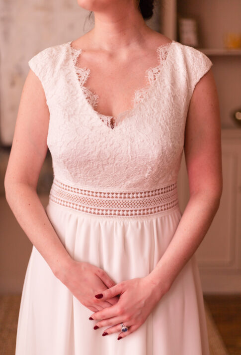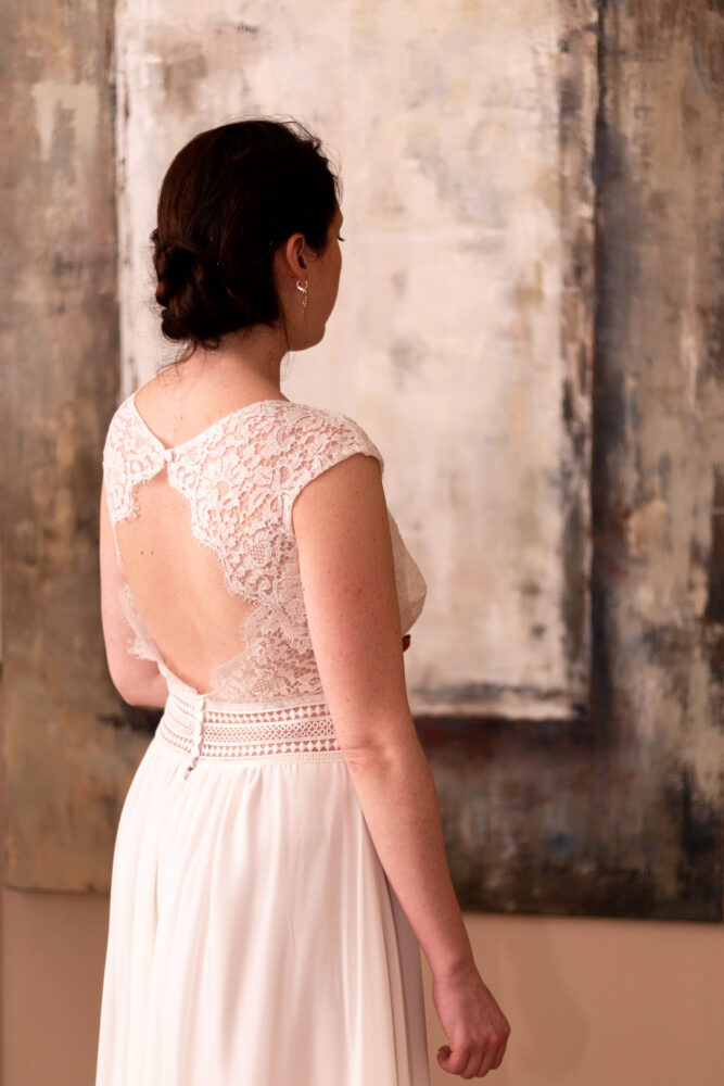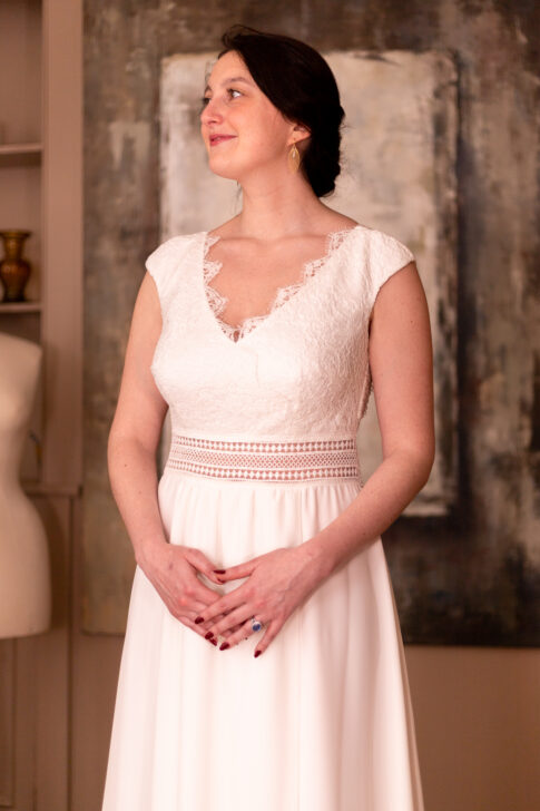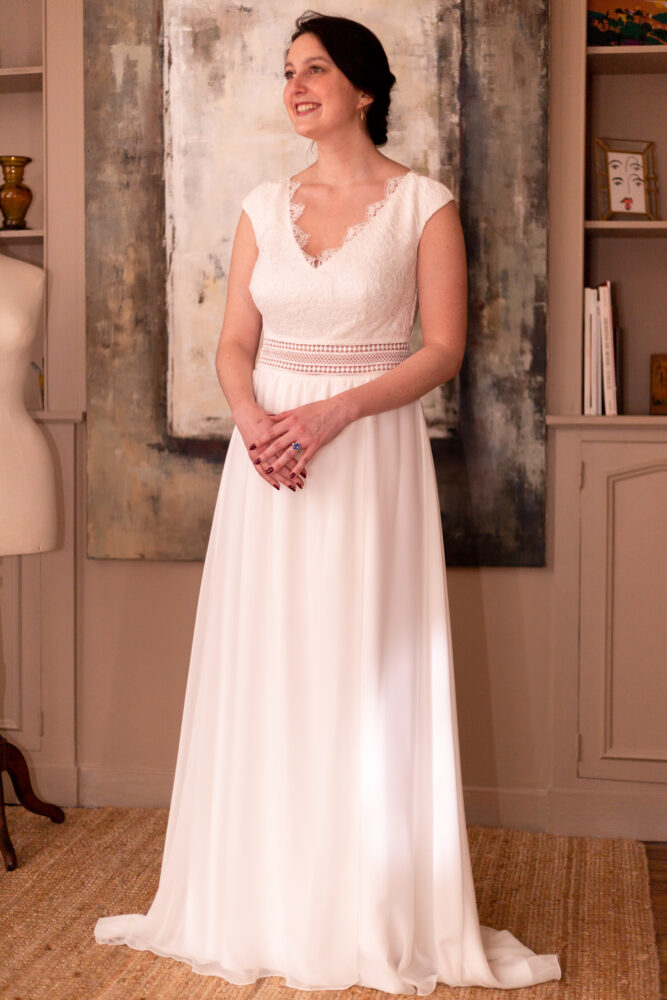 Robe avec un haut en dentelle de Calais et une ceinture en guipure.