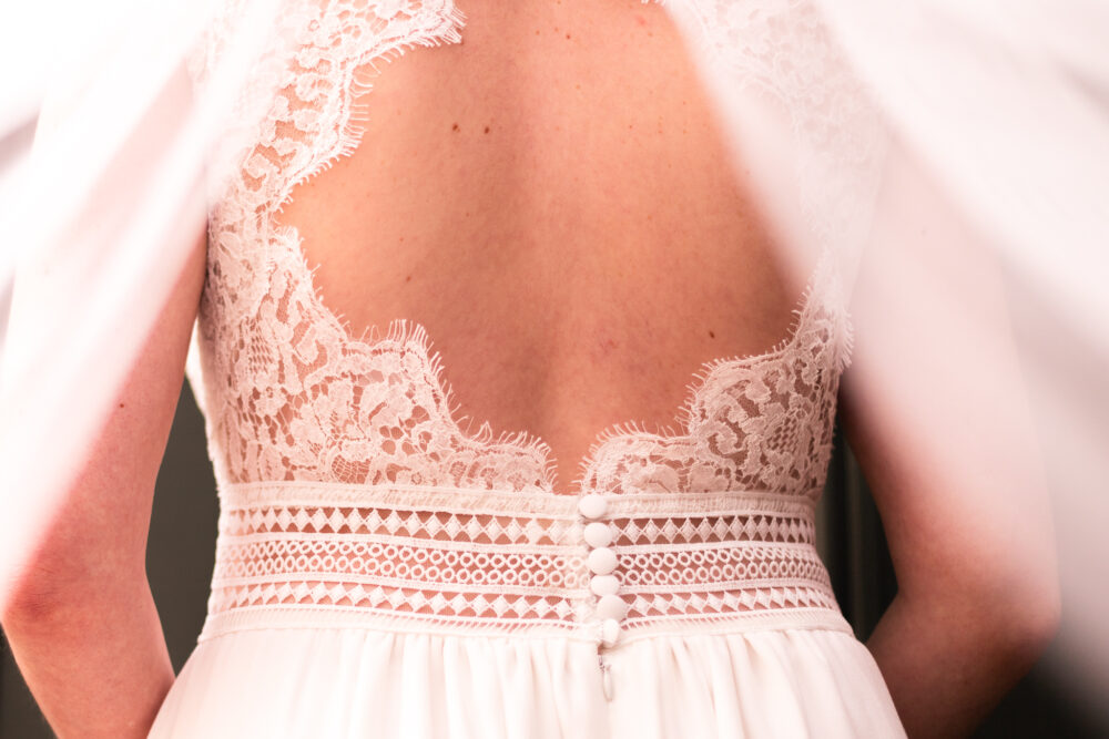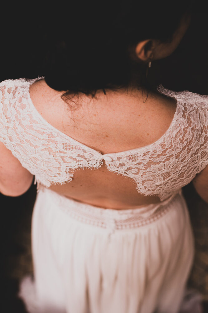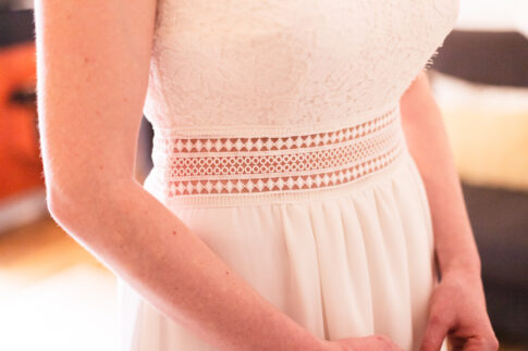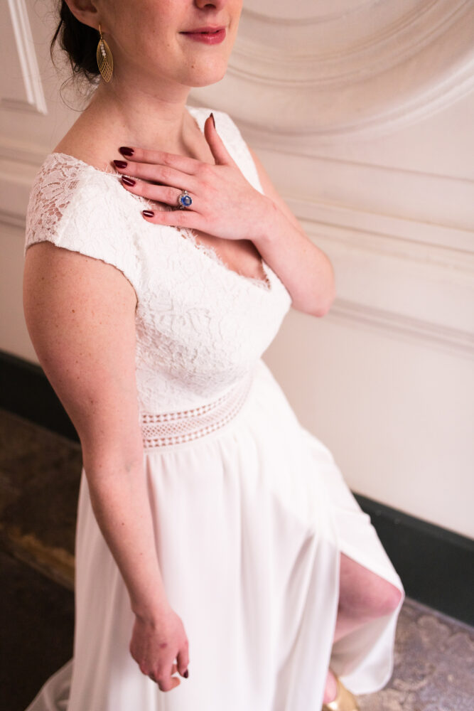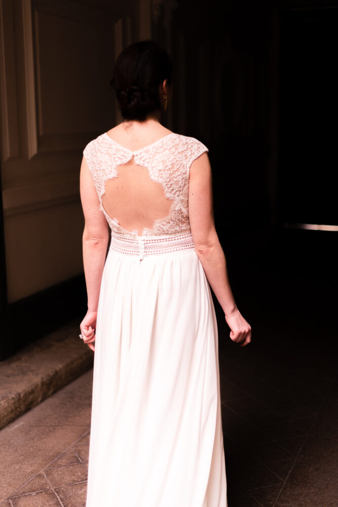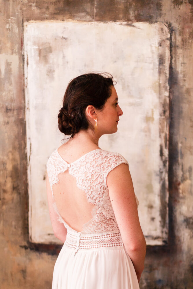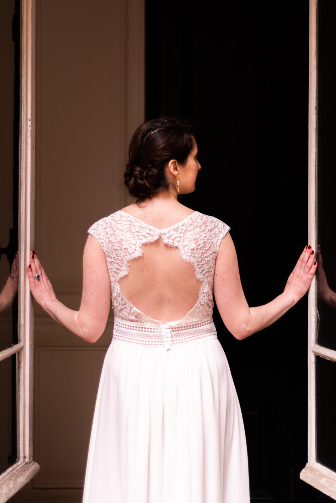 Robe avec un haut en dentelle de Calais et une ceinture en guipure.