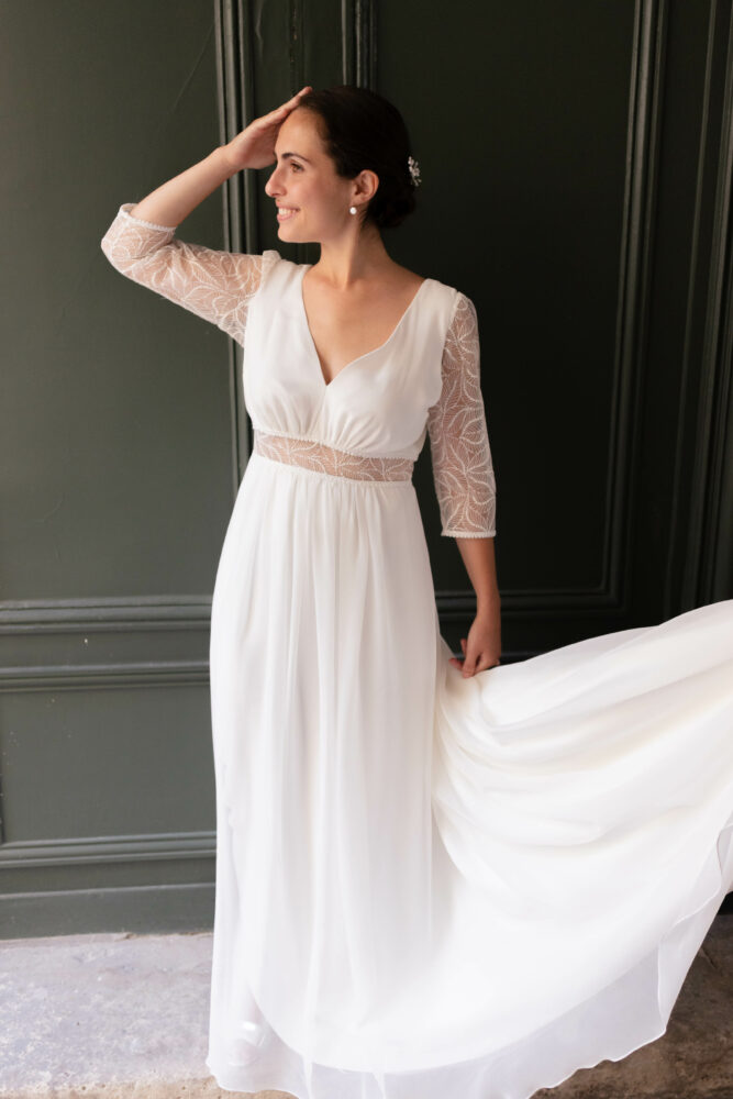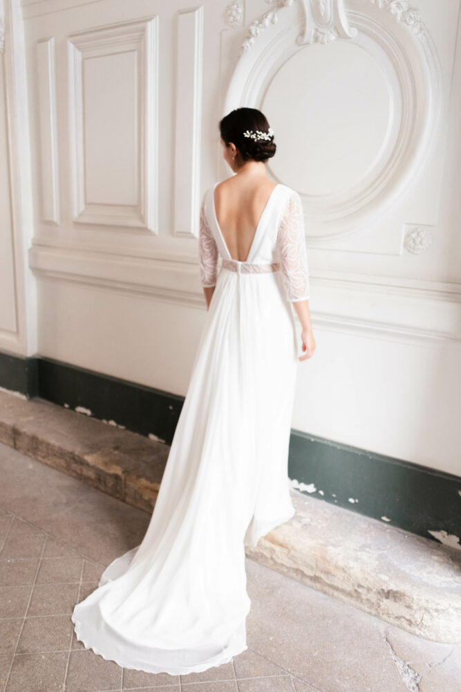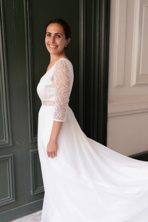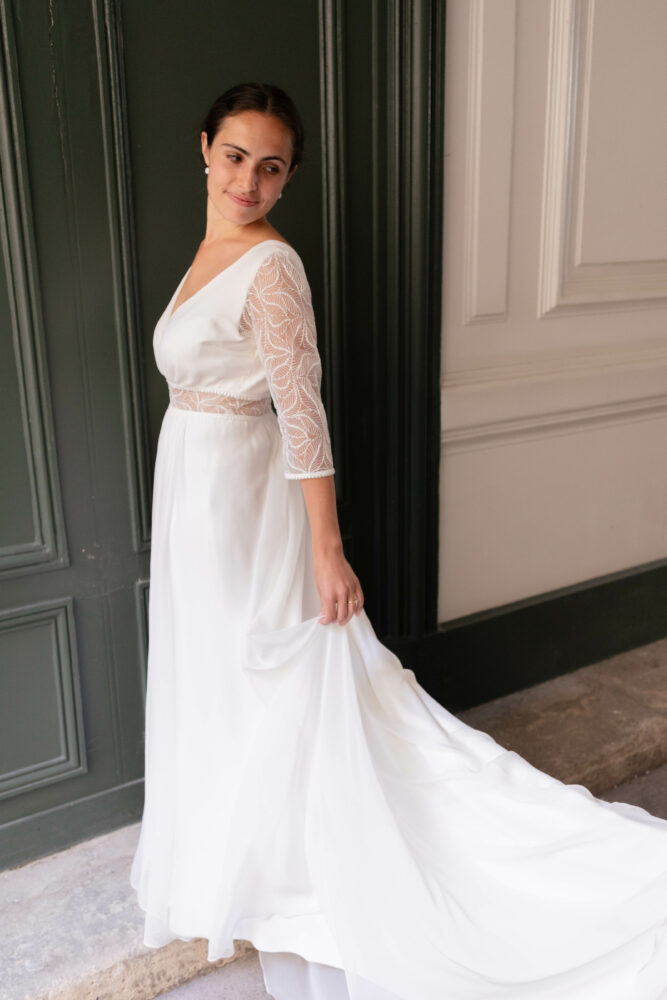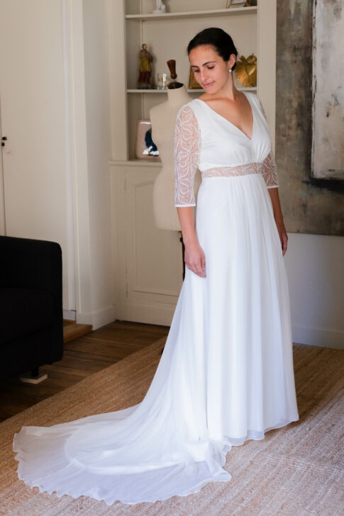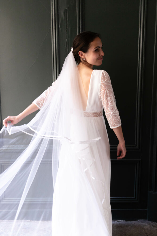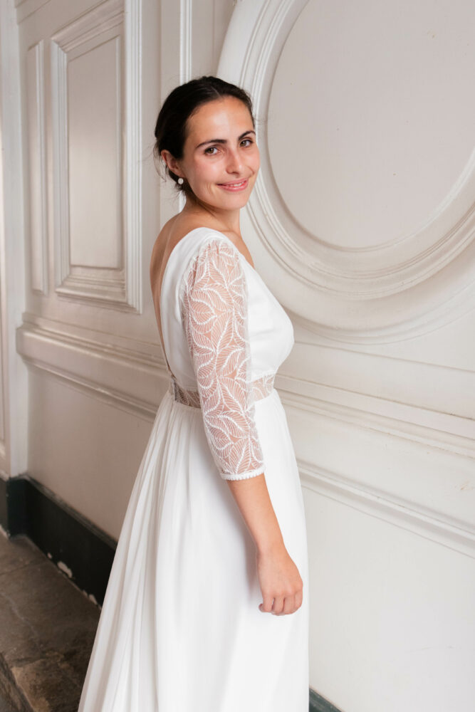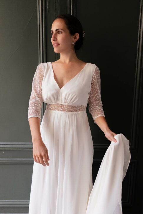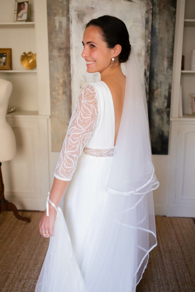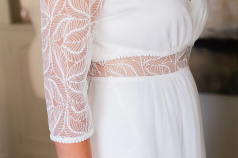 et une ceinture ajourée de tulle brodé, bordé d’un galon de guipure, comme les manches.