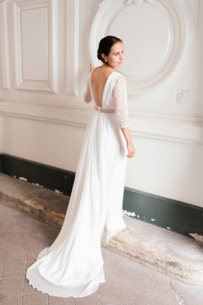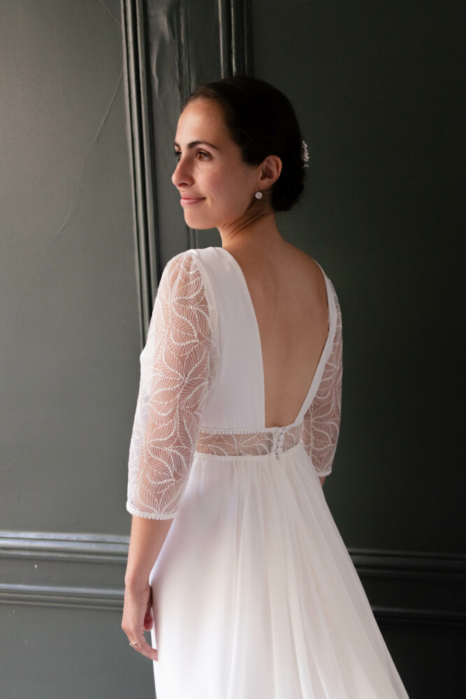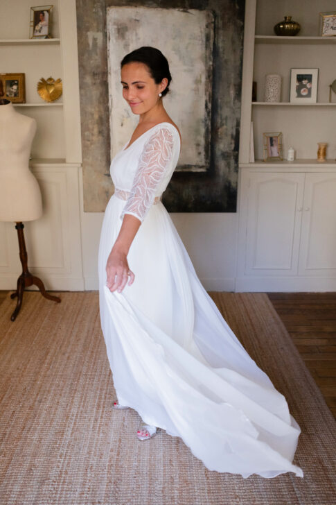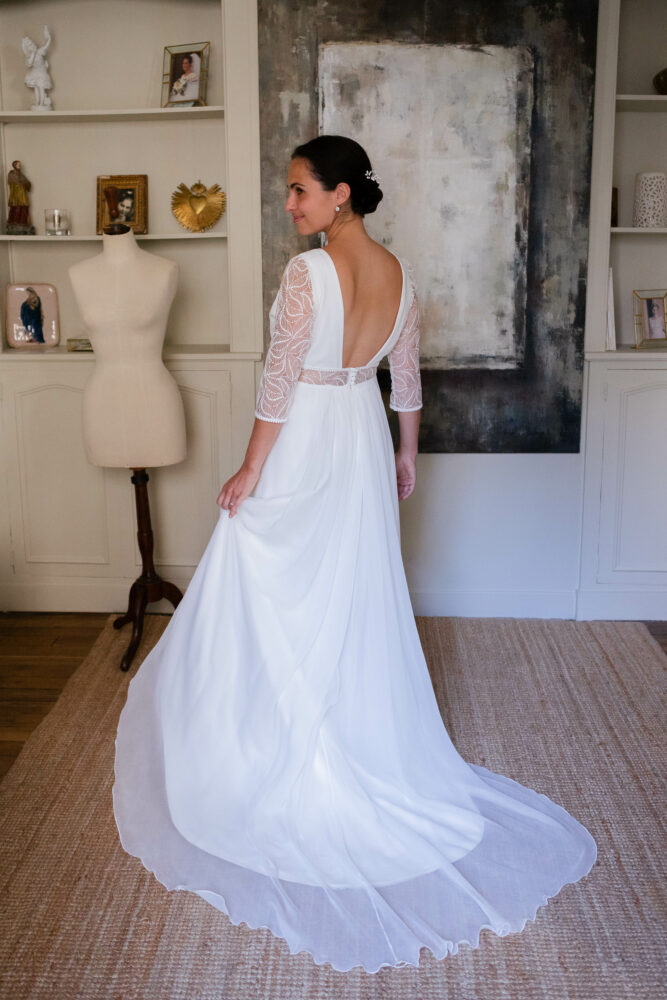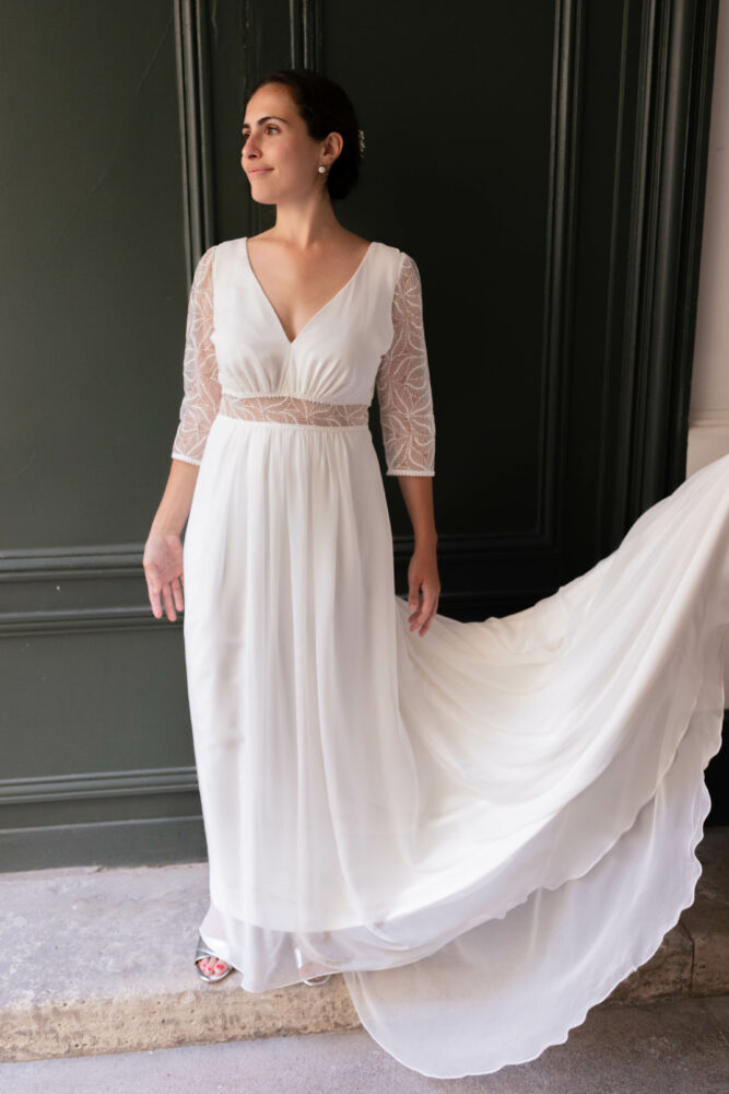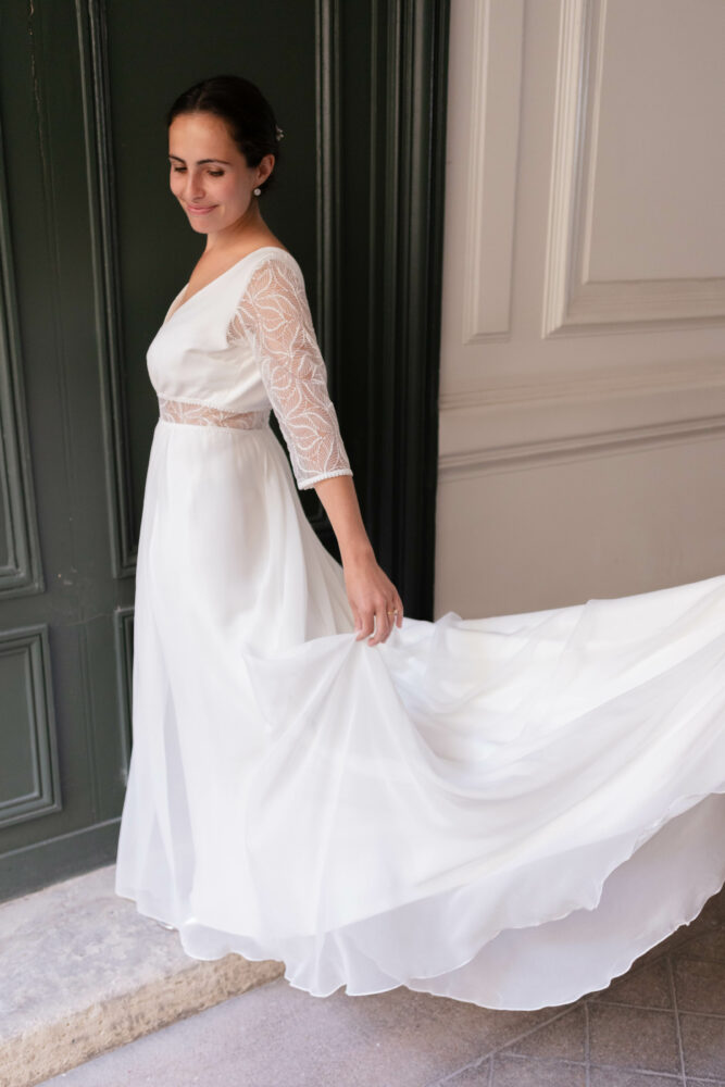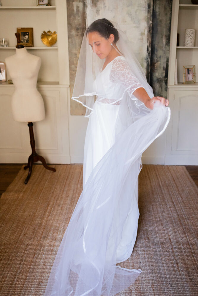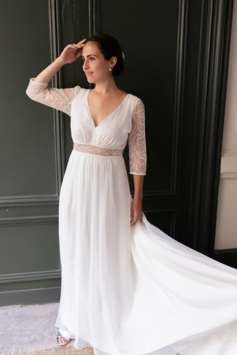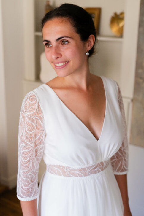 et une ceinture ajourée de tulle brodé, bordé d’un galon de guipure, comme les manches.