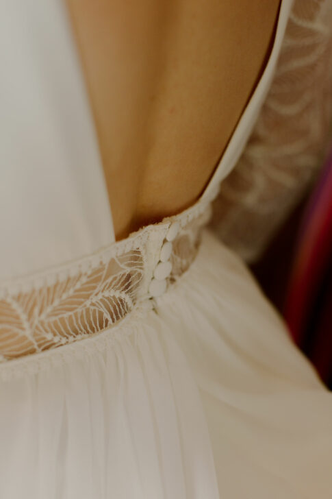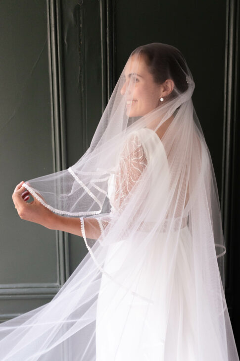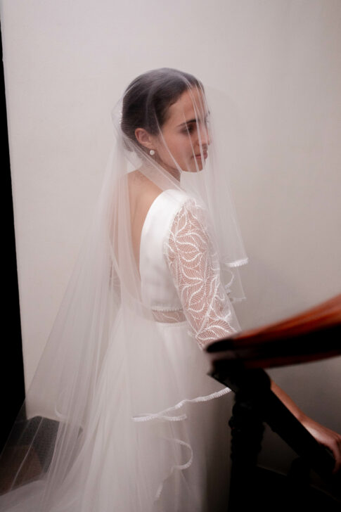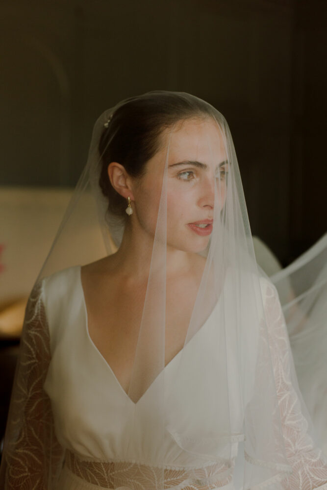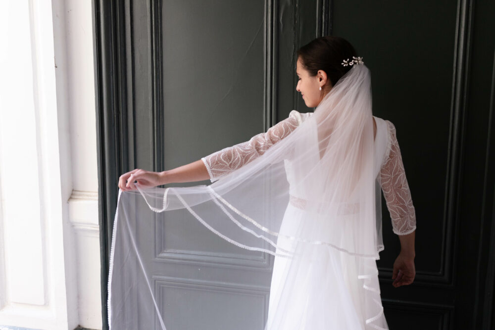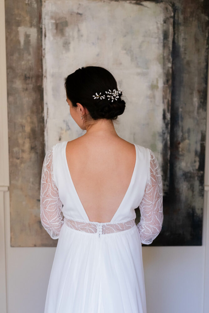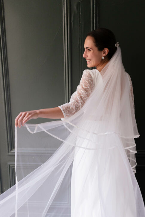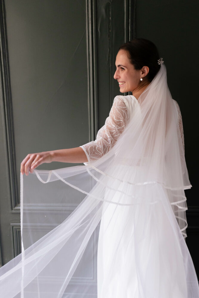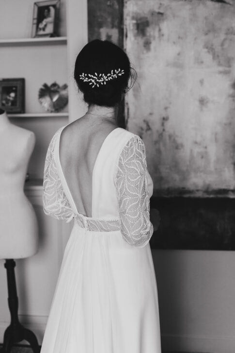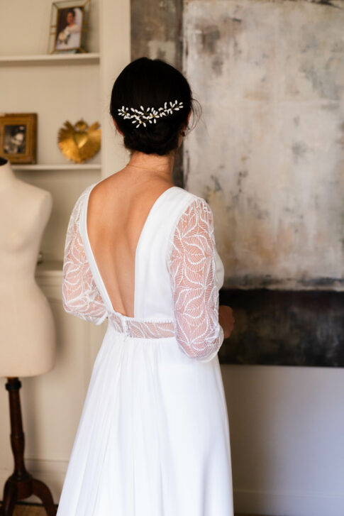 et une ceinture ajourée de tulle brodé, bordé d’un galon de guipure, comme les manches.