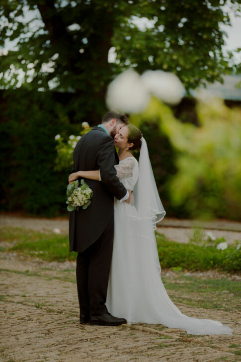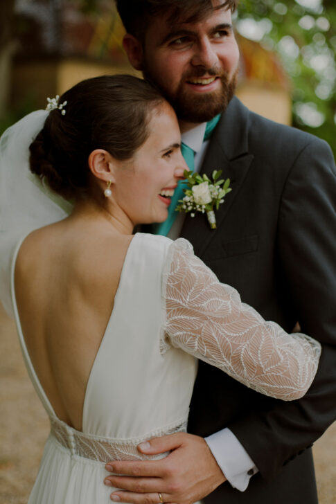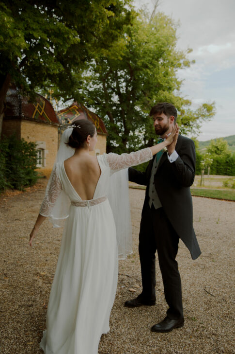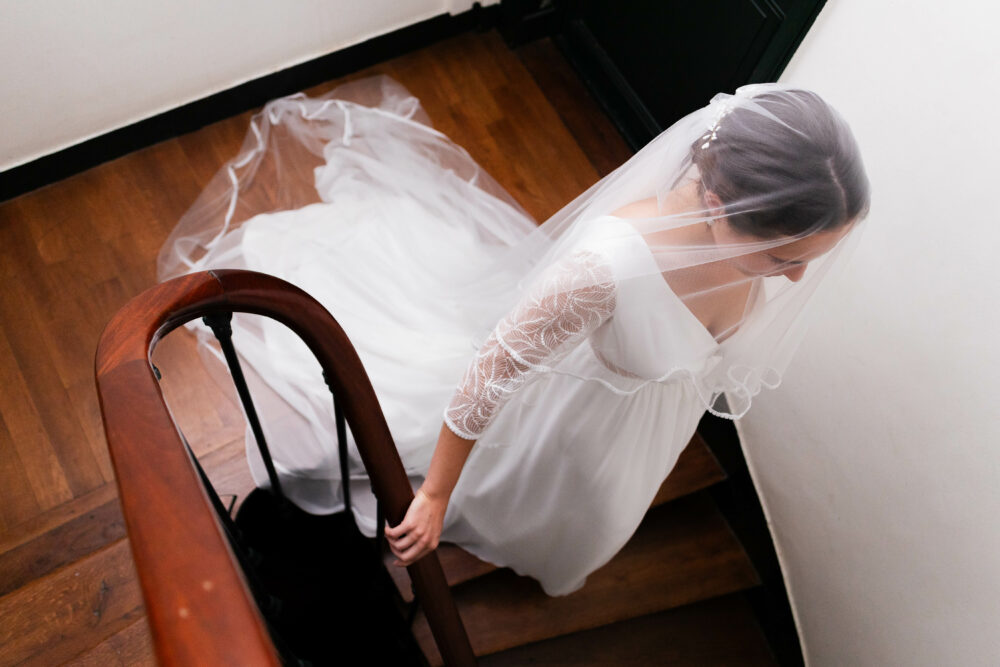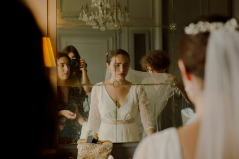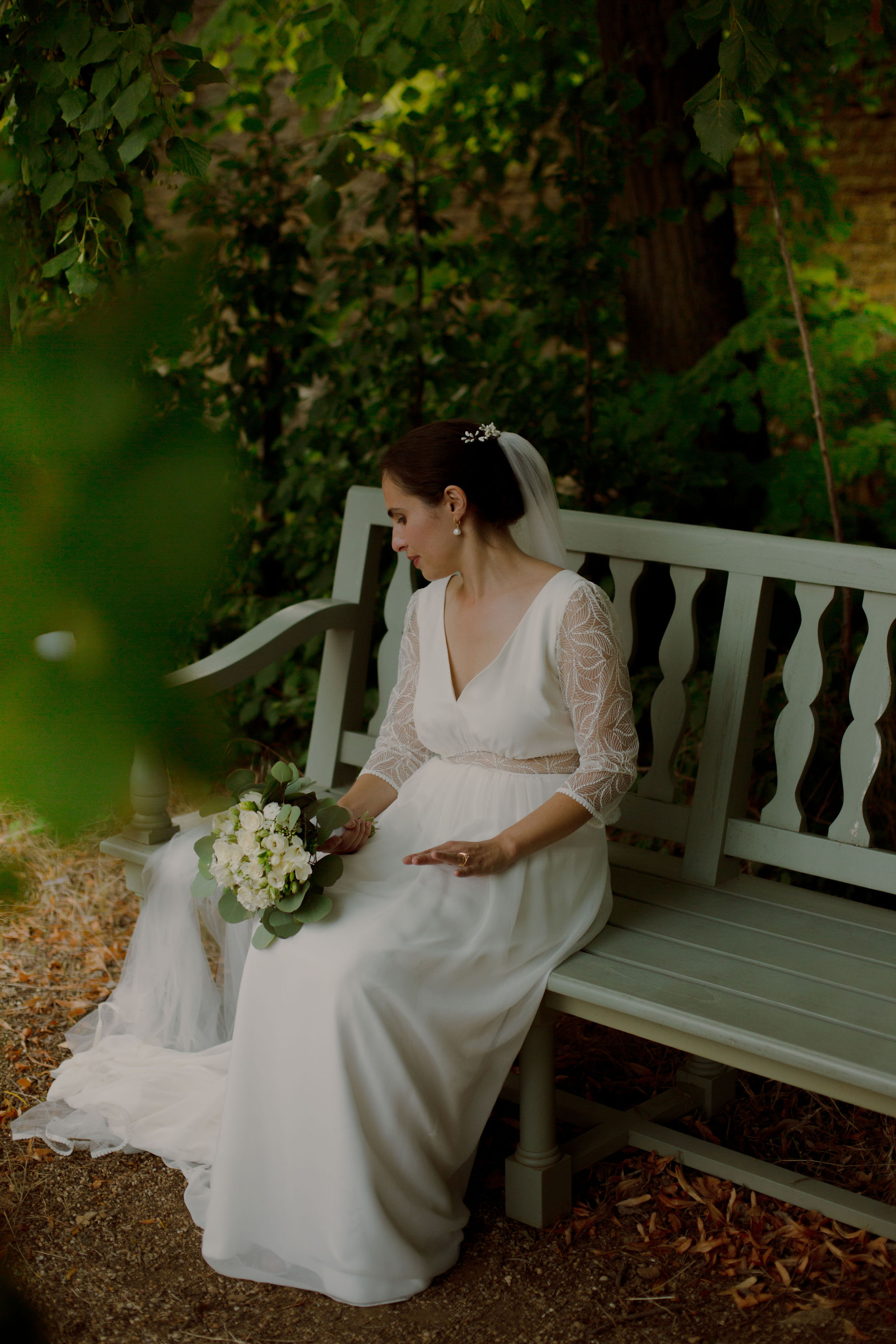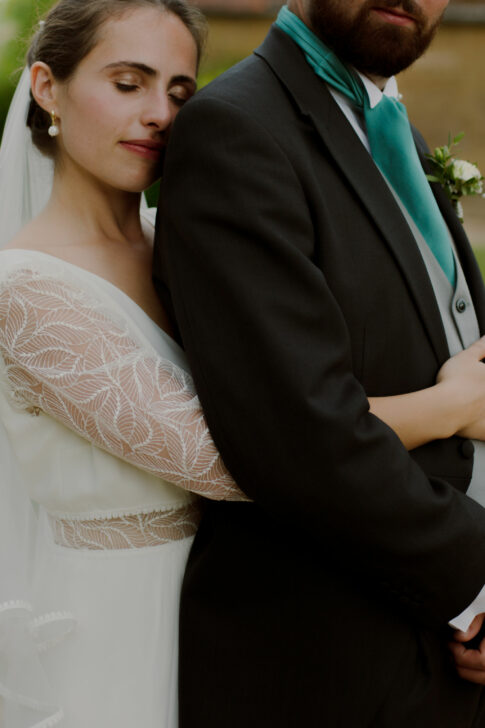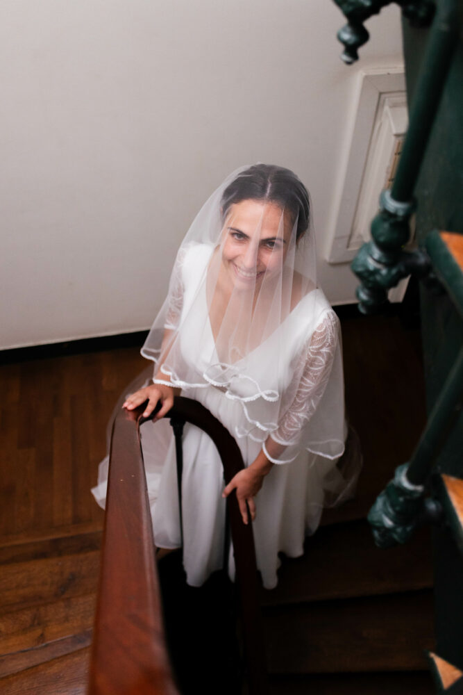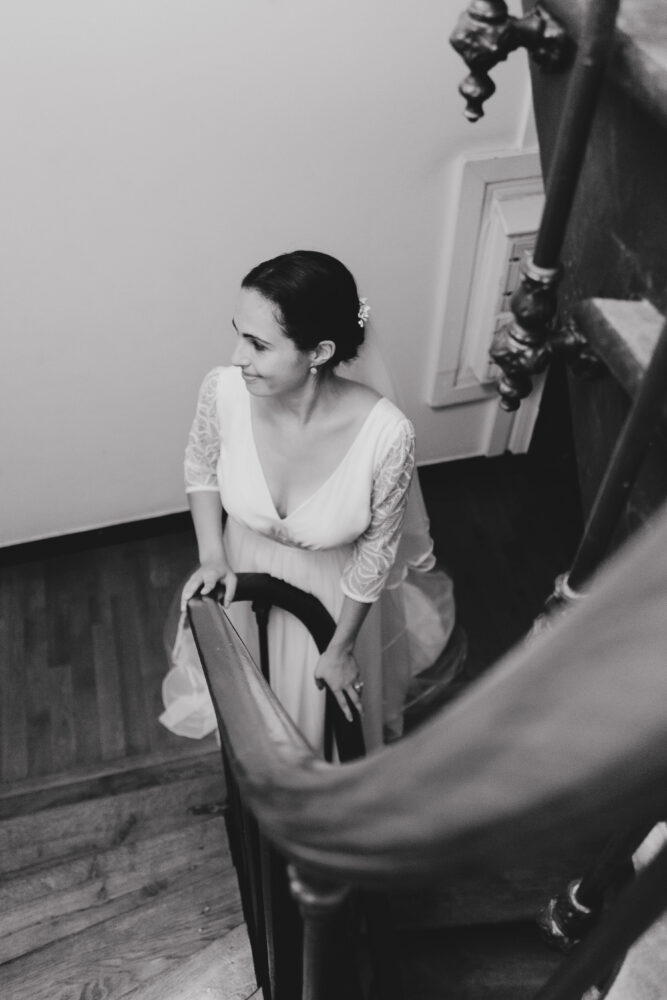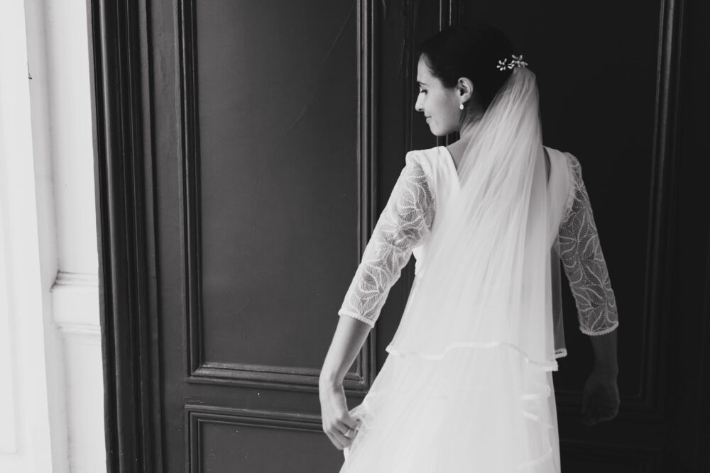 et une ceinture ajourée de tulle brodé, bordé d’un galon de guipure, comme les manches.