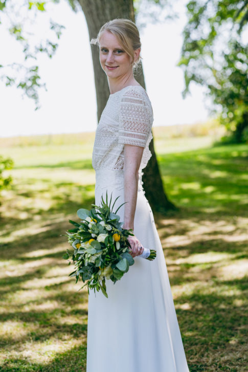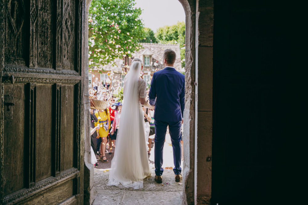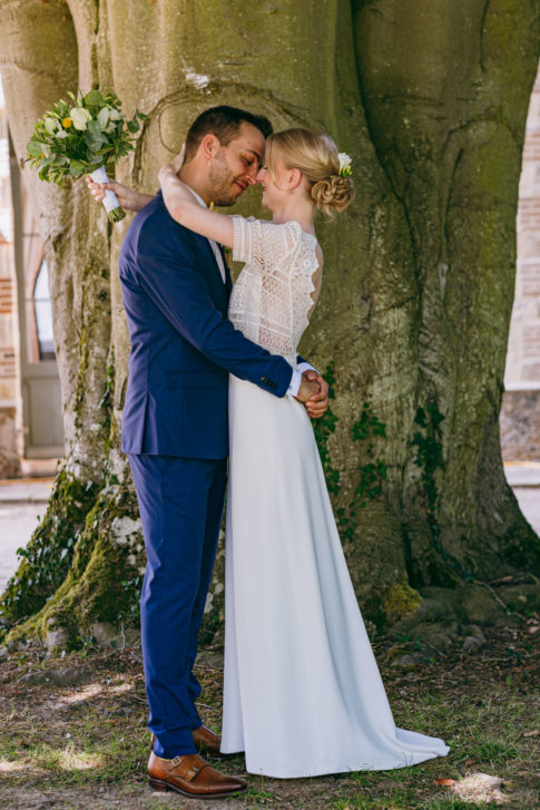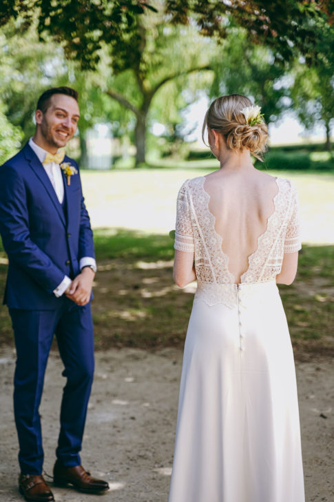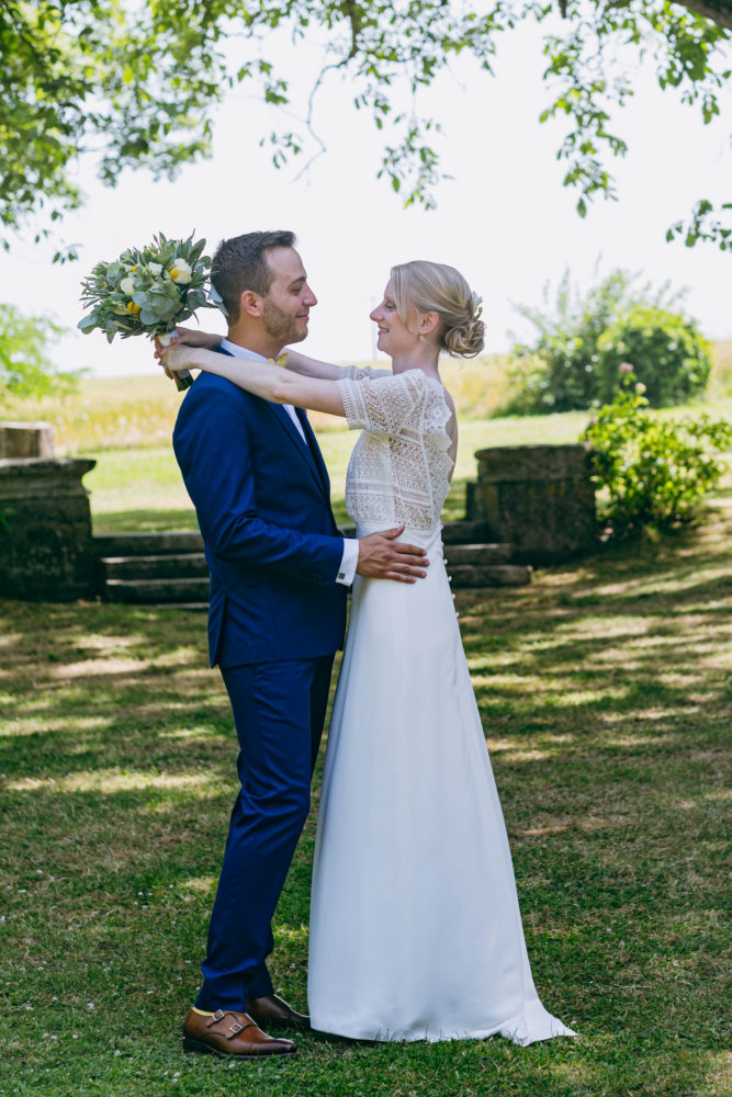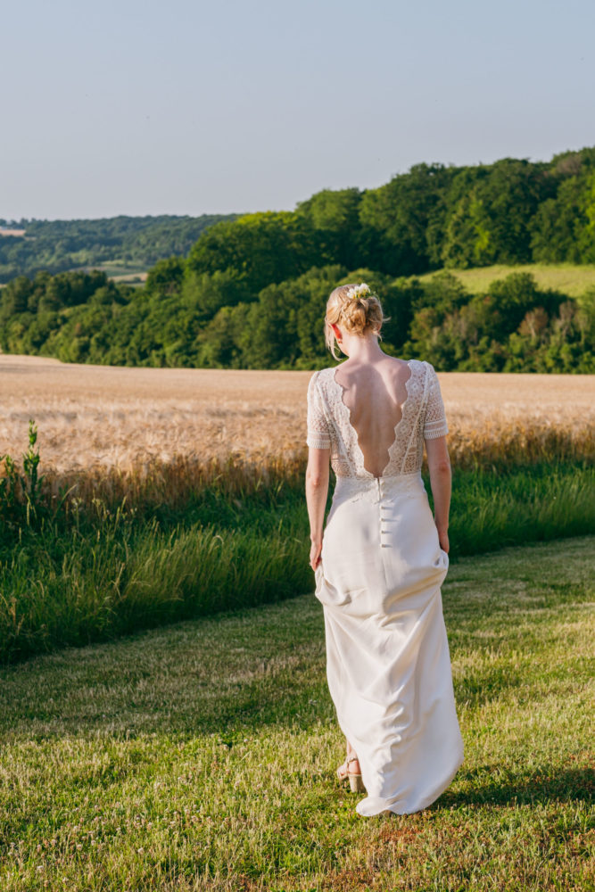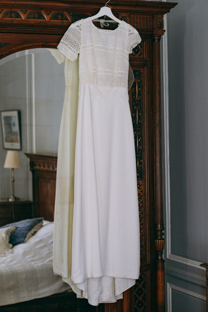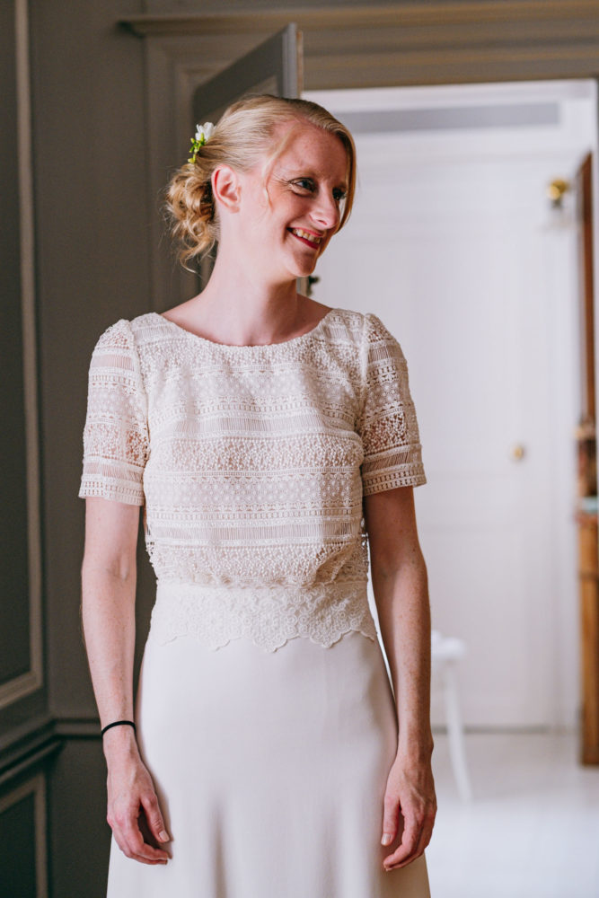 Jupe en crêpe lourd et top en guipure, avec des petites manches droites et dos nu.