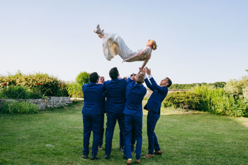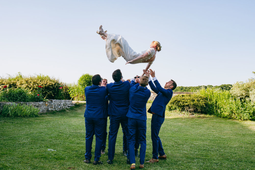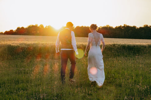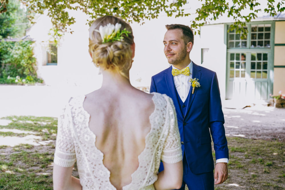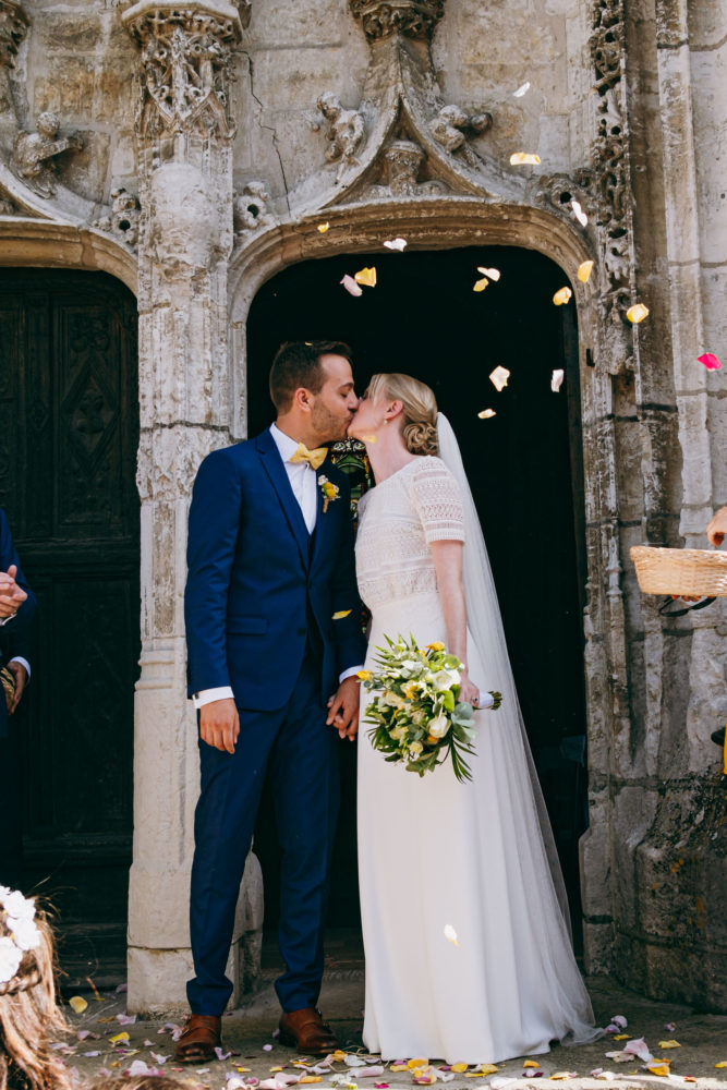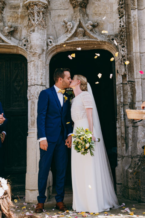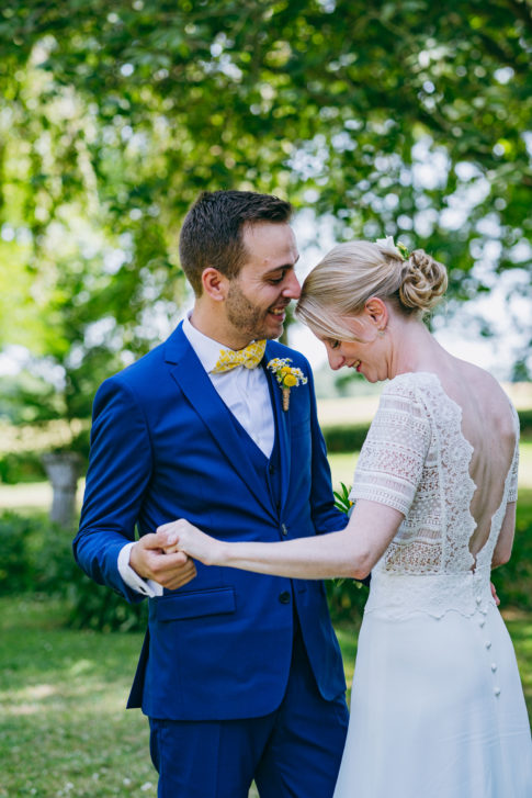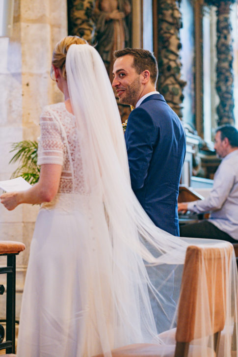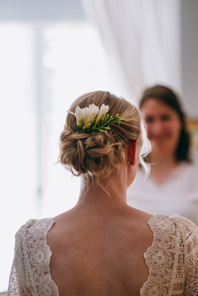 Jupe en crêpe lourd et top en guipure, avec des petites manches droites et dos nu.