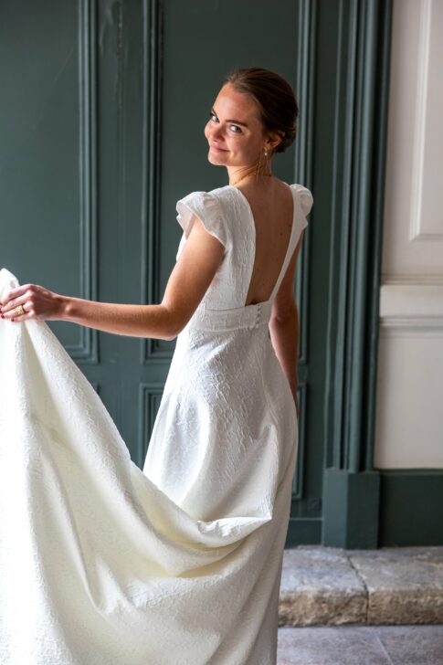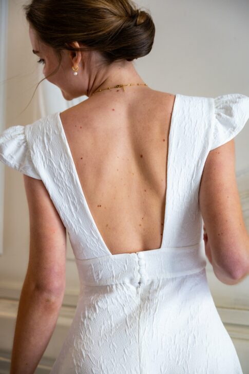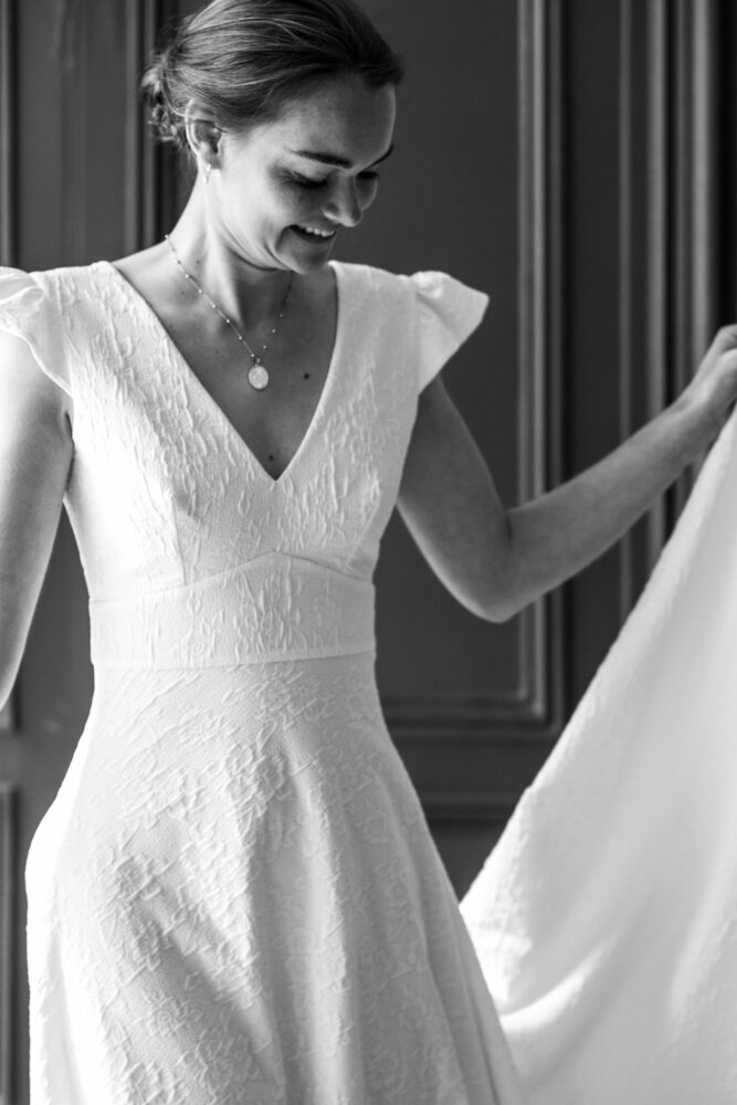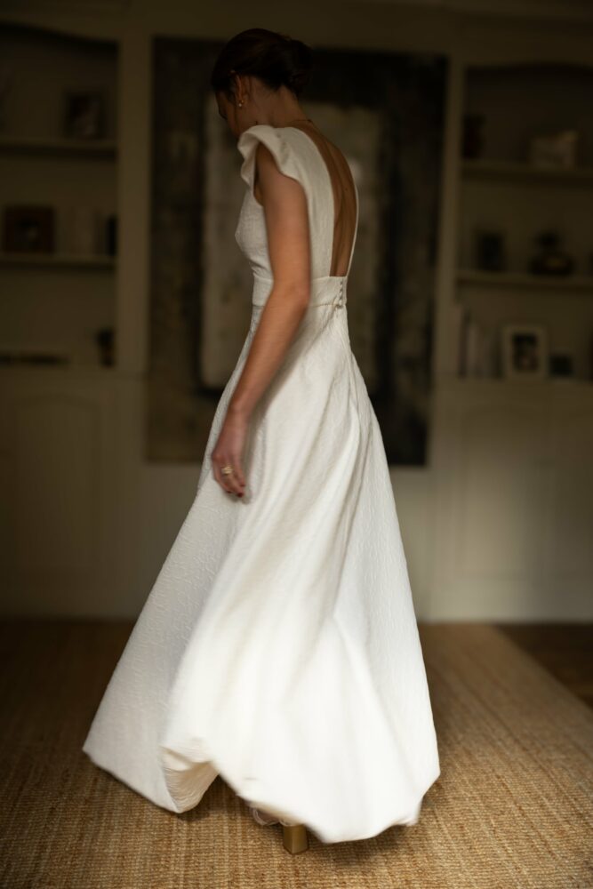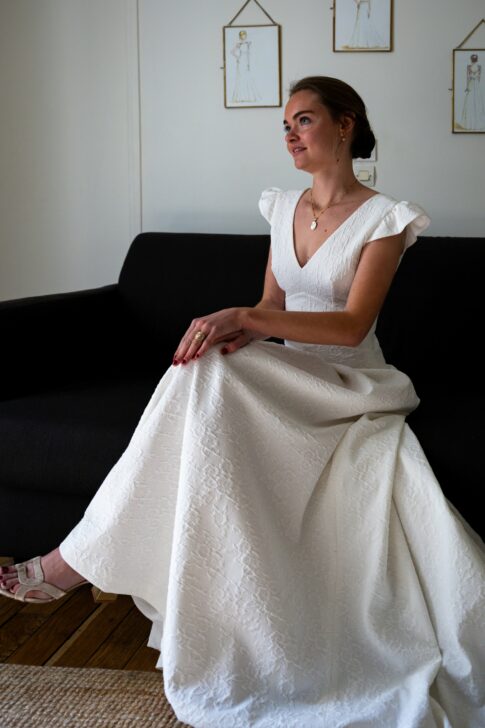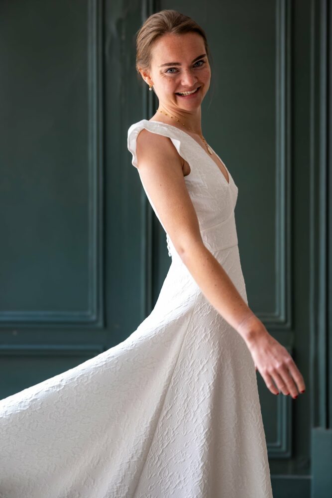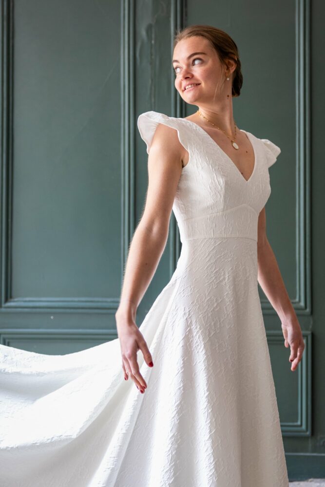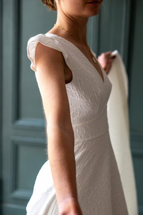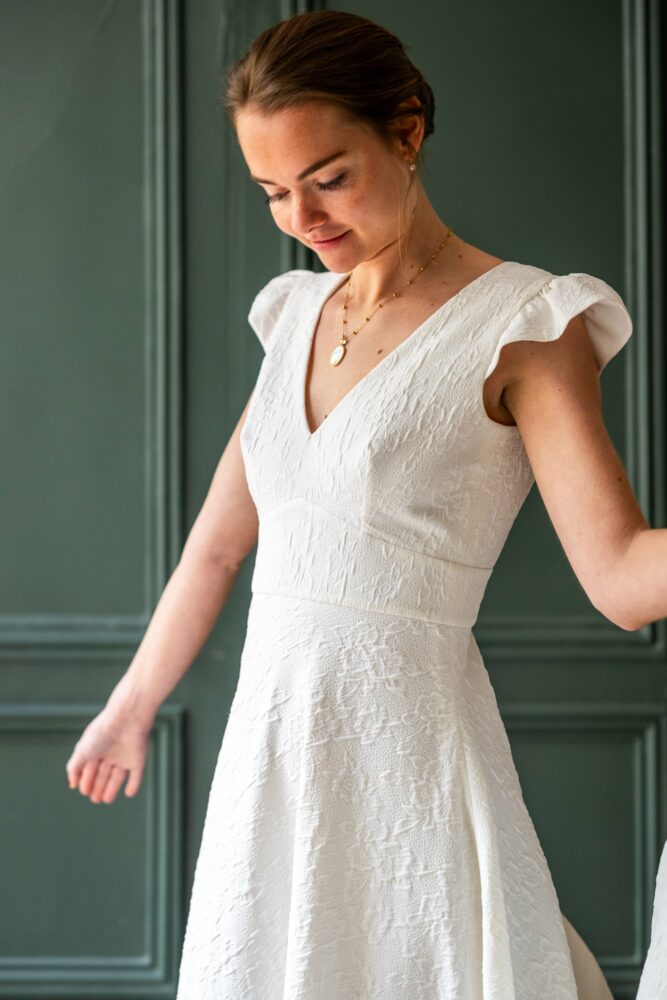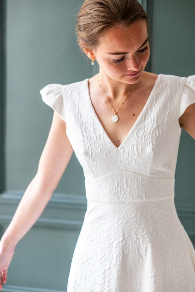 Robe en jacquard fleuri, avec des petites manches courtes.