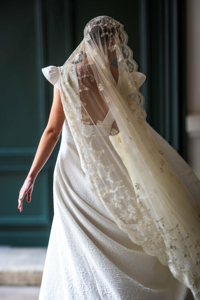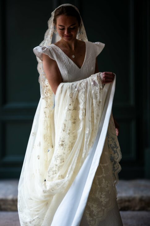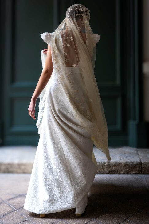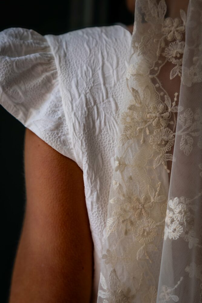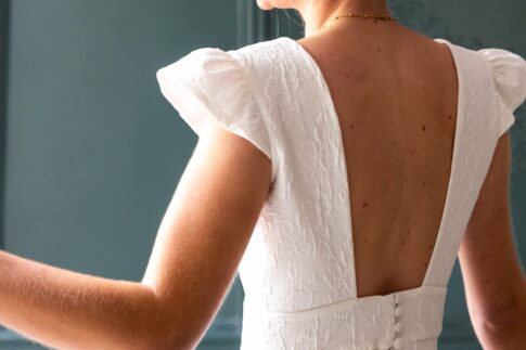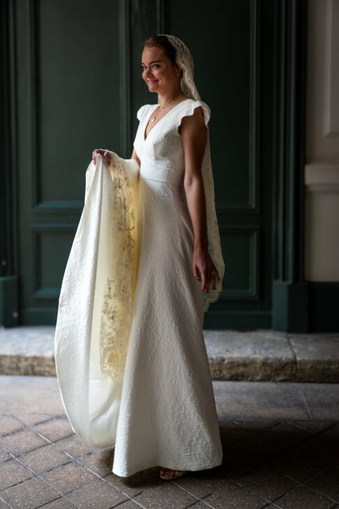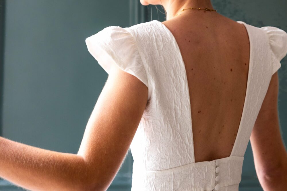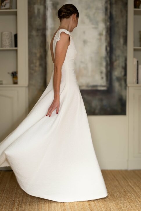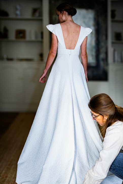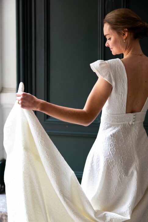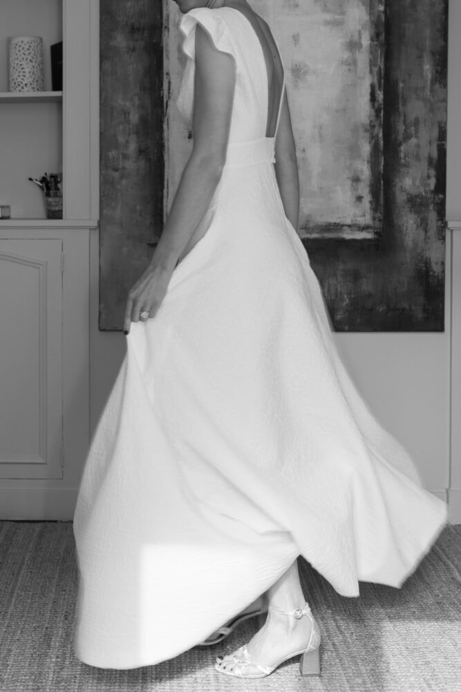 Robe en jacquard fleuri, avec des petites manches courtes.