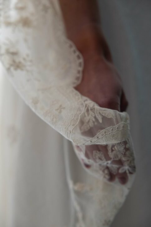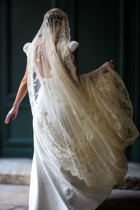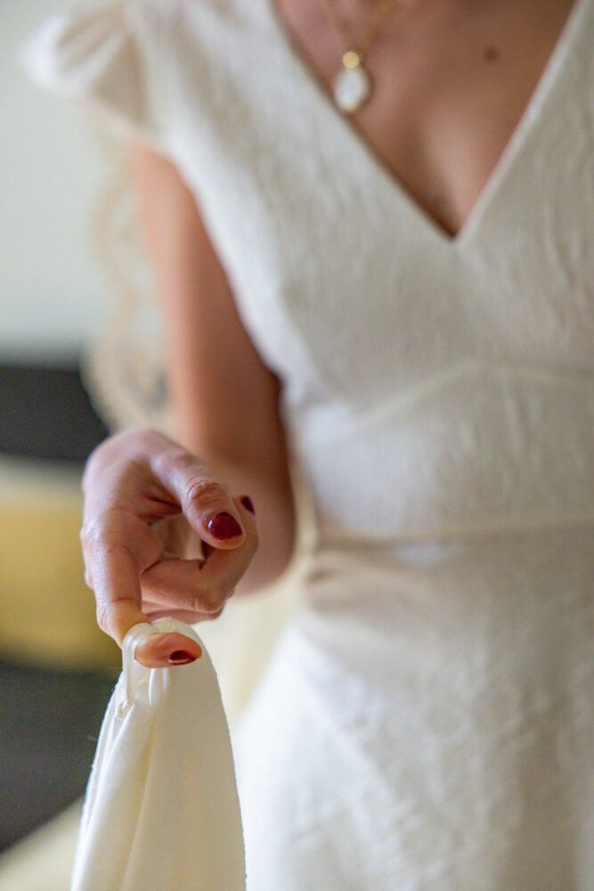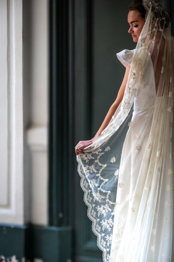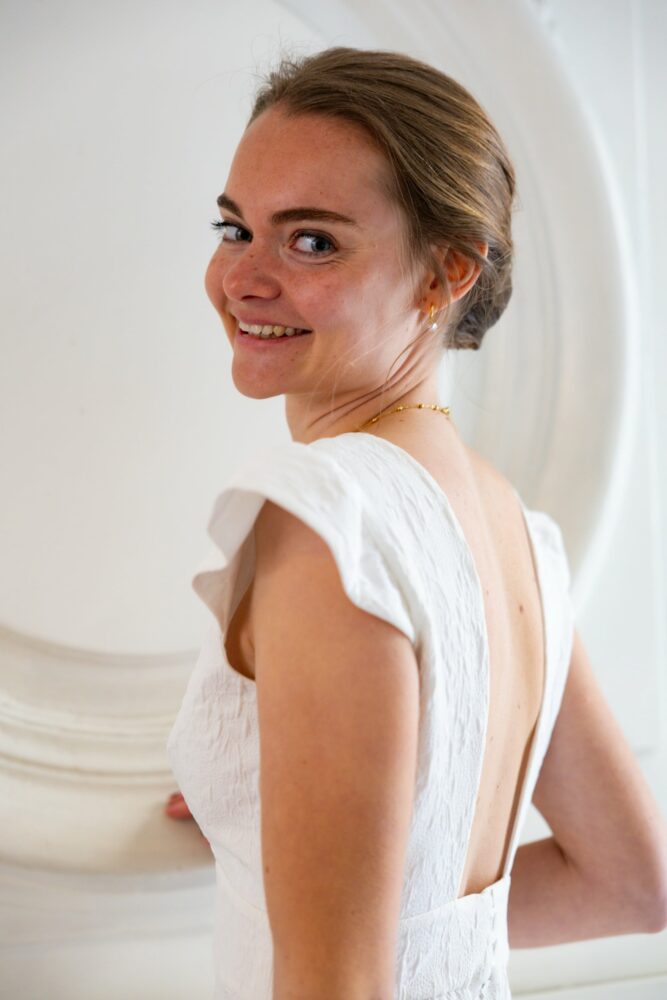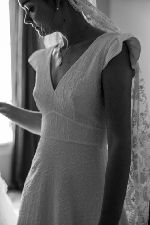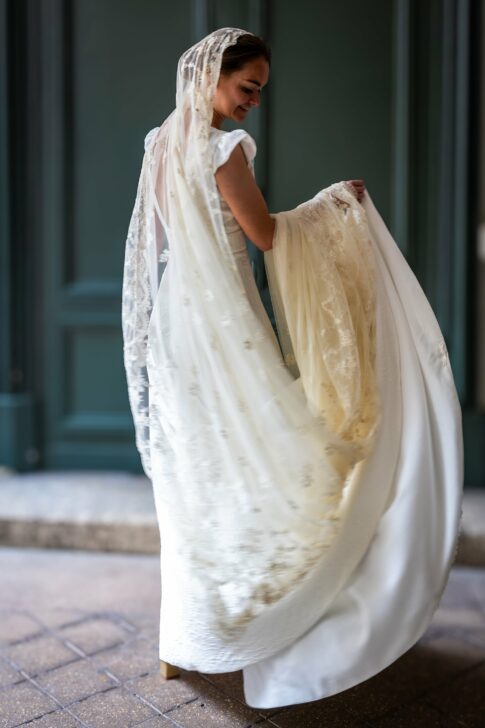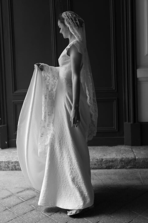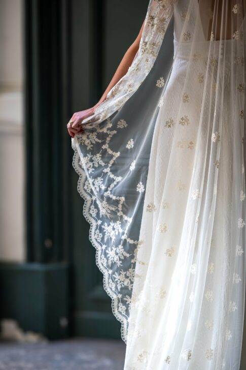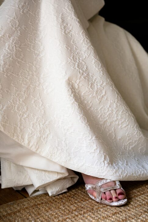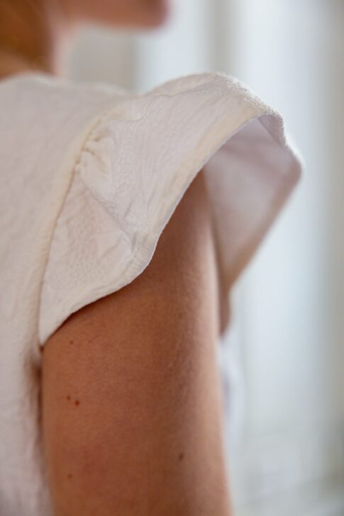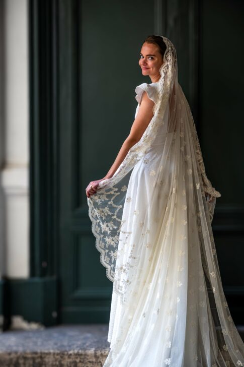 Robe en jacquard fleuri, avec des petites manches courtes.